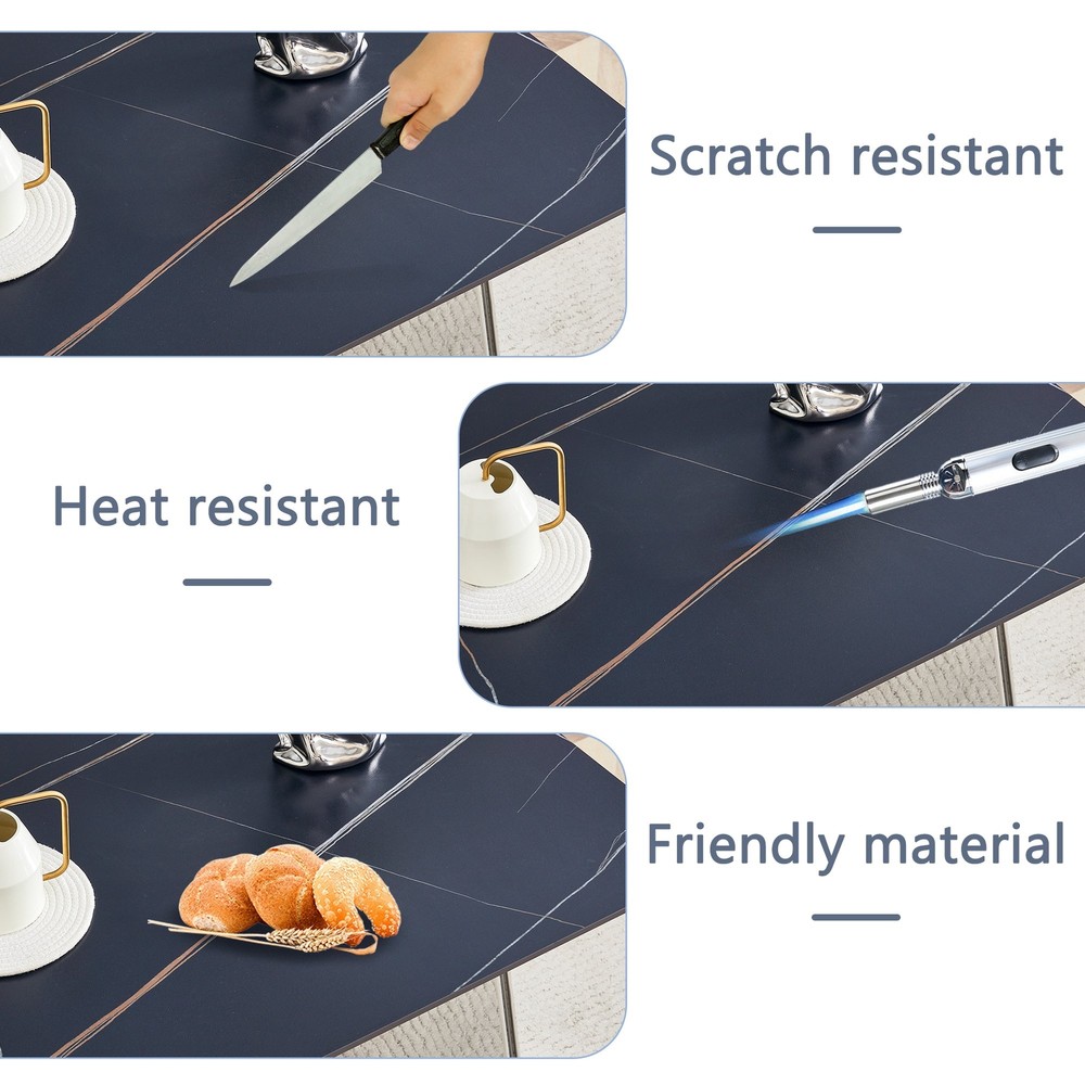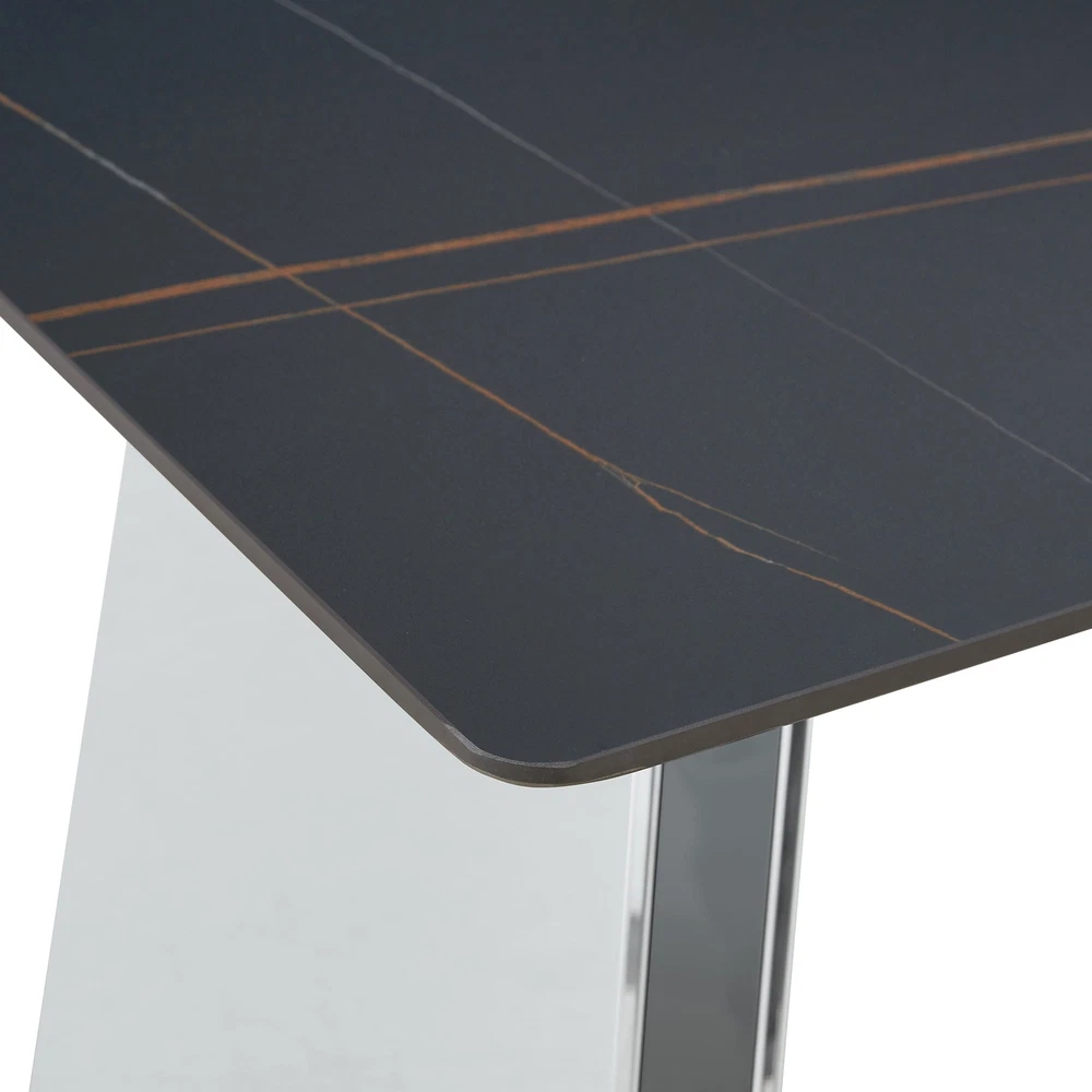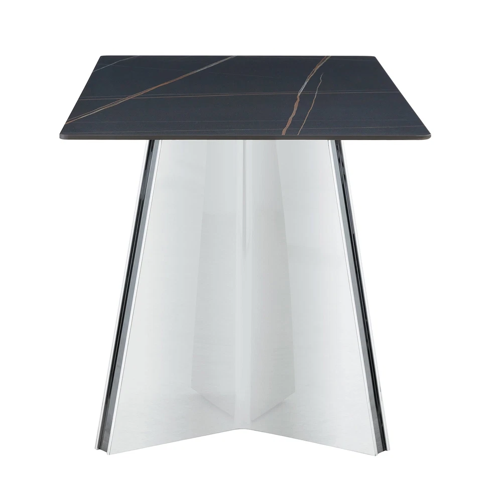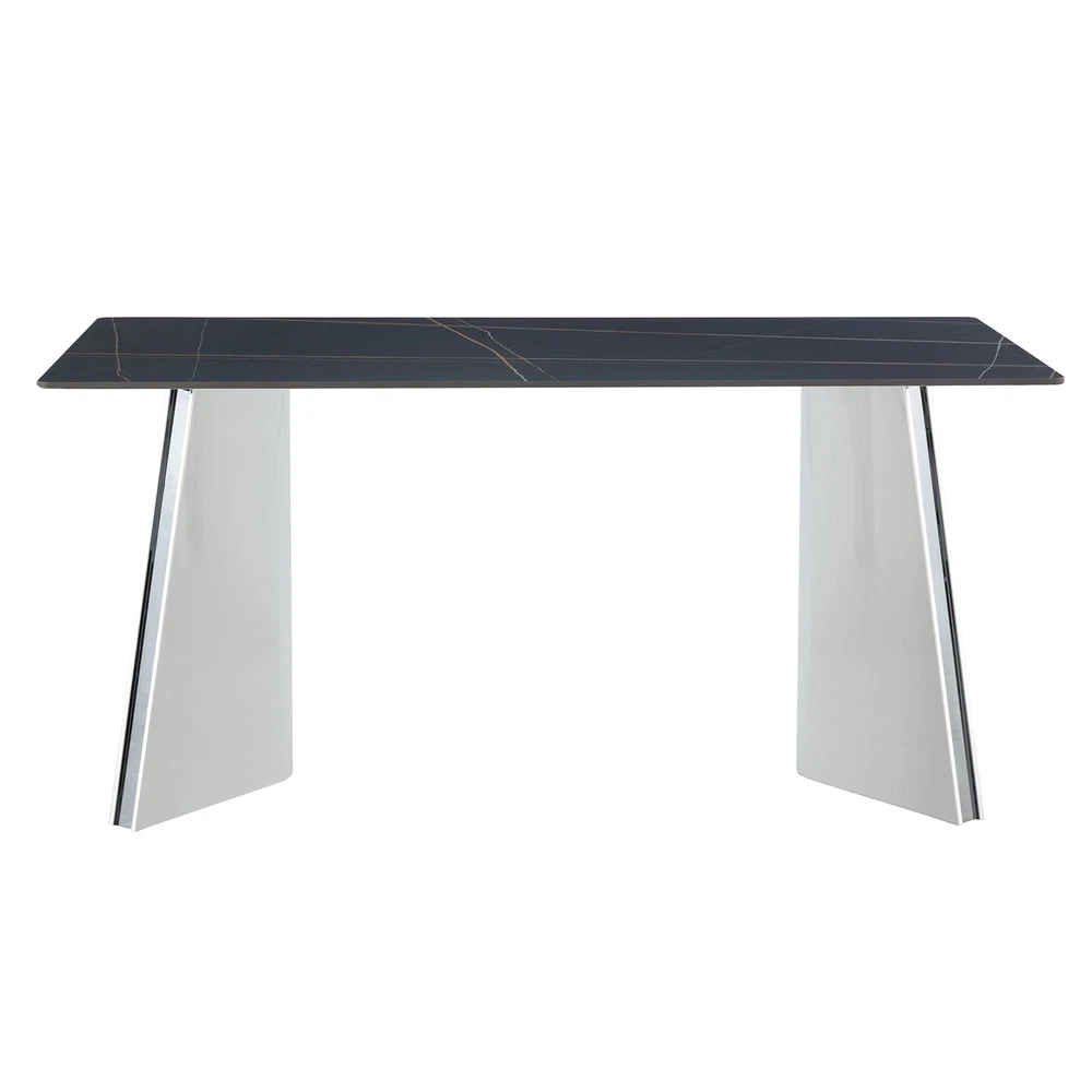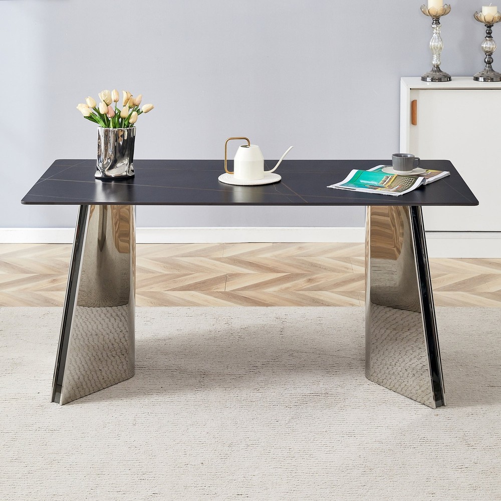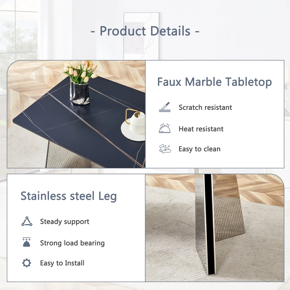 63" Black Marble-Patterned Slab Dining Table Modern Kitchen Table w/Steels Legs Features Create a minimalist, artistic dining space with first-class panels and craftsmanship. Minimalist line design maximizes the clutter in the view. At the same time, black is a timeless color in the fashion world. It makes the whole dining room space full of high-class feeling. Symmetrical design table legs are more stable. The silver luster is even show the noble atmosphere. It allows you to enjoy the food at the same time, but also feel the charm of quality home. This dining table is ideal in a minimalist, yet stylish home design. The deep black rock slab tabletop displays an understated and luxurious flavor. The texture is hard and wear-resistant. Every detail reflects craftsmanship. Stainless steel table legs in the stable load-bearing at the same time, exudes the luster is a perfect blend with the desktop. Every touch is a testimony to quality. Premium Slab Table Top: Made of durable slab material with a black marble pattern, bringing a high-end texture to your dining area.Scratch and Heat Resistant: The tabletop is designed to be scratch and heat resistant, suitable for placing hot dishes, and easy for daily maintenance.Smooth Edges: The edges of the dining table are finely polished, smooth to the touch, providing a comfortable user experience. Stainless Steel Butterfly Legs: Unique stainless steel silver legs are designed to resemble butterfly wings, adding a modern artistic touch.Stable Support: The stainless steel legs provide stable support to ensure the stability of the dining table during use. Ideal Size: The assembled size of the dining table is 63*31.5 inches, suitable for most family dining spaces.Standard Table Height: The table height is 30 inches, in line with international standard table heights, making it easy for dining. Easy Assembly: The included instruction manual is clear and easy to understand, allowing most users to assemble the table within 15-20 minutes. Color Variation Notice: Due to differences in display devices and lighting, there may be a slight color difference between the actual product and the images, which is normal. Descriptions