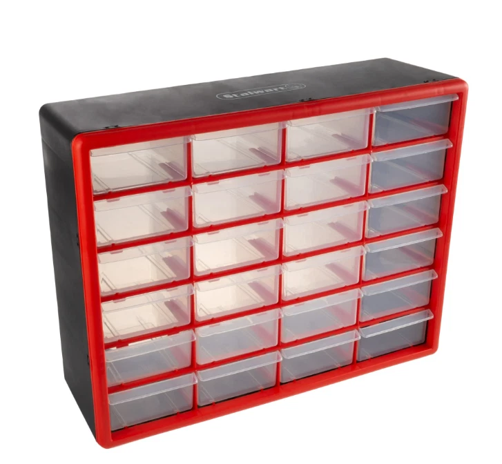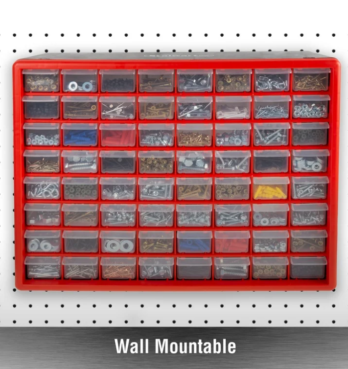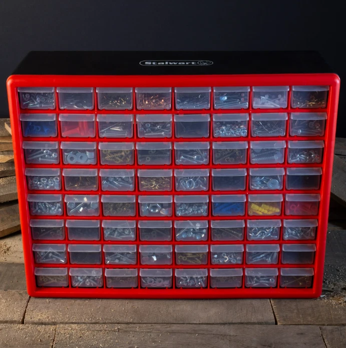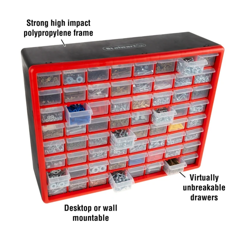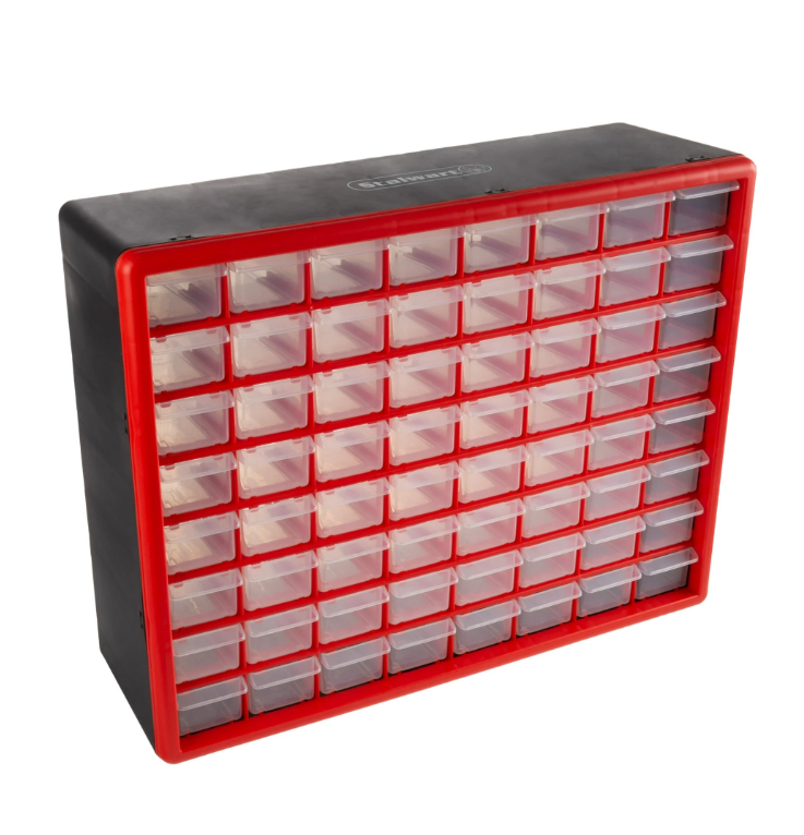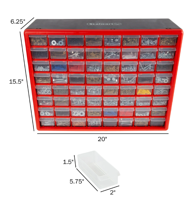 Product details The 64 Drawer Storage Cabinet by Stalwart is an excellent organizational solution for your garage, home, or office. The container is portable and can be used on tables, countertops or desks, and is also wall mountable. Stalwart is committed to providing the consumer with the absolute best price and value on all our products, which we ensure by applying a rigorous quality control process. NOTE: This is an exclusive product of Stalwart and Only 64 Drawer Storage Cabinets by Stalwart to be genuine. IMPORTANT: Avoid buying counterfeit products and transacting with unauthorized sellers. Look for our logo on the packaging for every one of our products. Stalwart is a registered trademark protected by U.S. Trademark law and will be vigorously defended. IMPACT RESISTANT MATERIAL- Constructed from durable polypropylene, these storage drawers are made to last, and difficult to damage or break. The flexible and strong, see-through clear plastic drawers feature finger grip drawer pulls for easy opening. DESKTOP OR WALL MOUNTABLE- The storage box is portable and can be placed on any desk, table, or work surface. The sturdy plastic frame features keyholes on the back for convenient wall mounting in a closet, in a classroom, workshop or shed. MULTI-PURPOSE- With 64 compartments, this cabinet is ideal for storing and organizing everything from fishing tackle, office supplies, hardware like nuts, screws, and bolts, to crafting materials, beads, makeup, or jewelry. VERSATILE- These storage containers are perfect for any area of the house. Get one for your garage, office, kitchen, bathroom, or bedroom. It's the perfect organizational solution to keep accessories, pieces, or parts neatly stored and tidy. PRODUCT DETAILS- Material: Polypropylene. Overall Dimensions: (L)20 x (W) 6.25 x (H) 15.5, Drawer Dimensions (64 Each): (L) 2 x (W) 5.75 x (H) 1.5. 64 total drawers. On Jan 9, 2025 at 19:52:31 PST, seller added the following information: