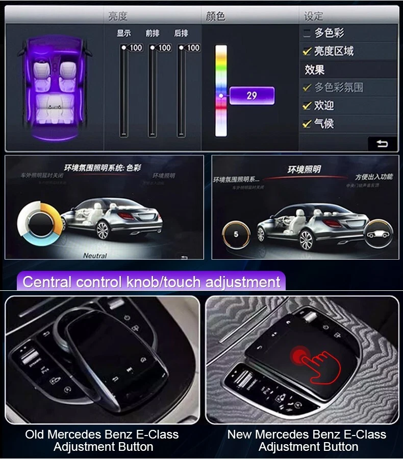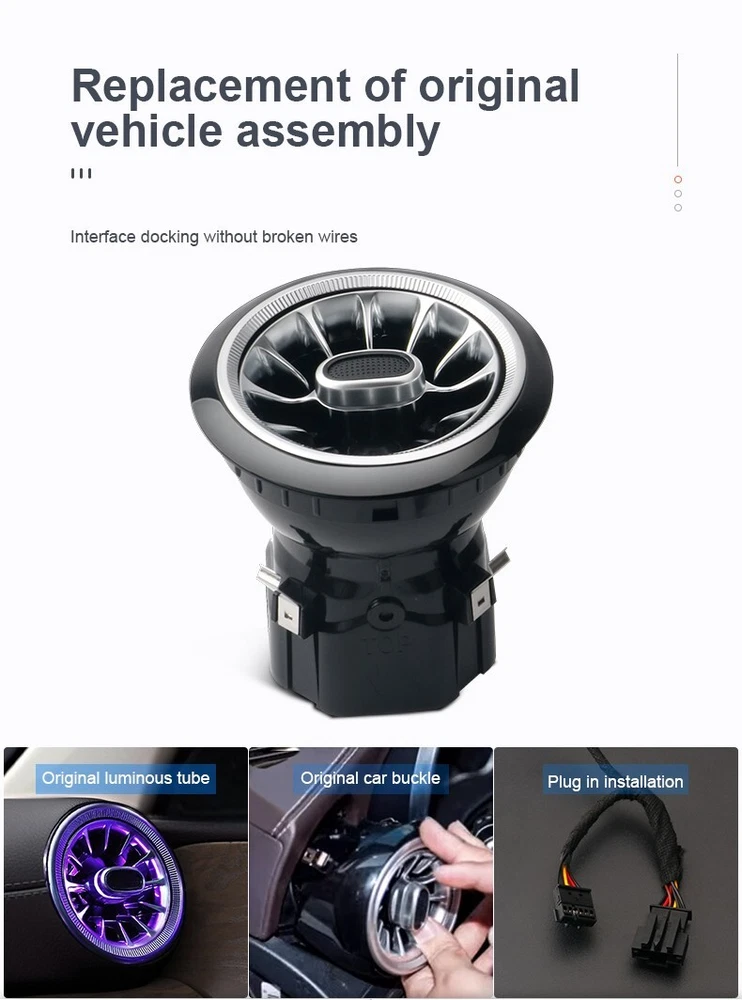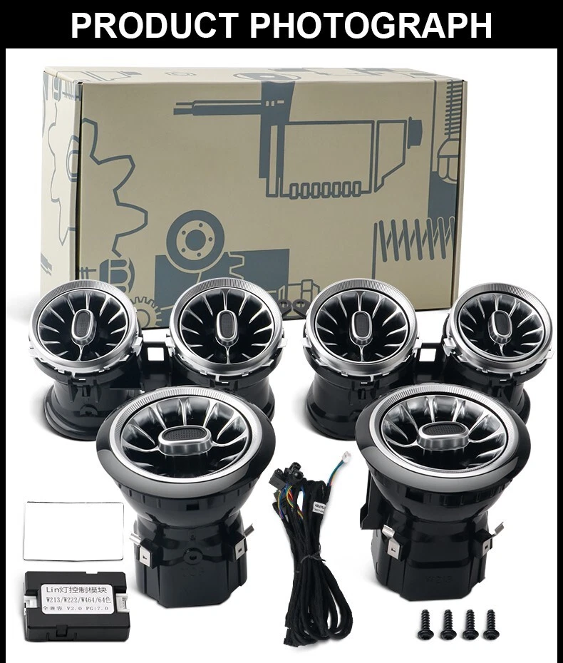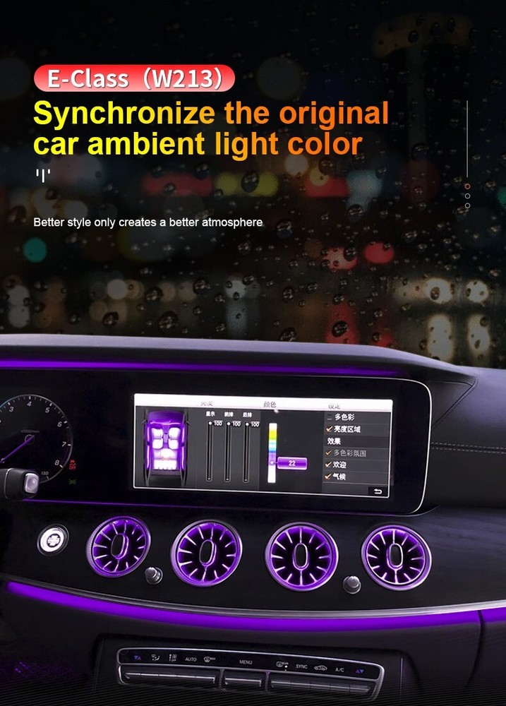 Features: 100% Brand New in Box W213 8PCS/Set 64 Colors NEW Version High Quality Plug and Play Interior Front and Rear Dashboard Air Vent with Ambient Light 1:1 Replacement; NO Modification Required Fitment: For Mercedes Benz E-Class W213 2017 2018 2019 2020 2021( 64 Colors ) - OEM design, fit original air vent position perfectly - Light color is synchronized with original ambient light - Light color and brightness can be controlled by original Command knob Package included: 8 PCS/Set Front and Rear Air Vents with Ambient Light NOTE: NOT Including Installation Guide or Manual. Professional installation is highly recommended .