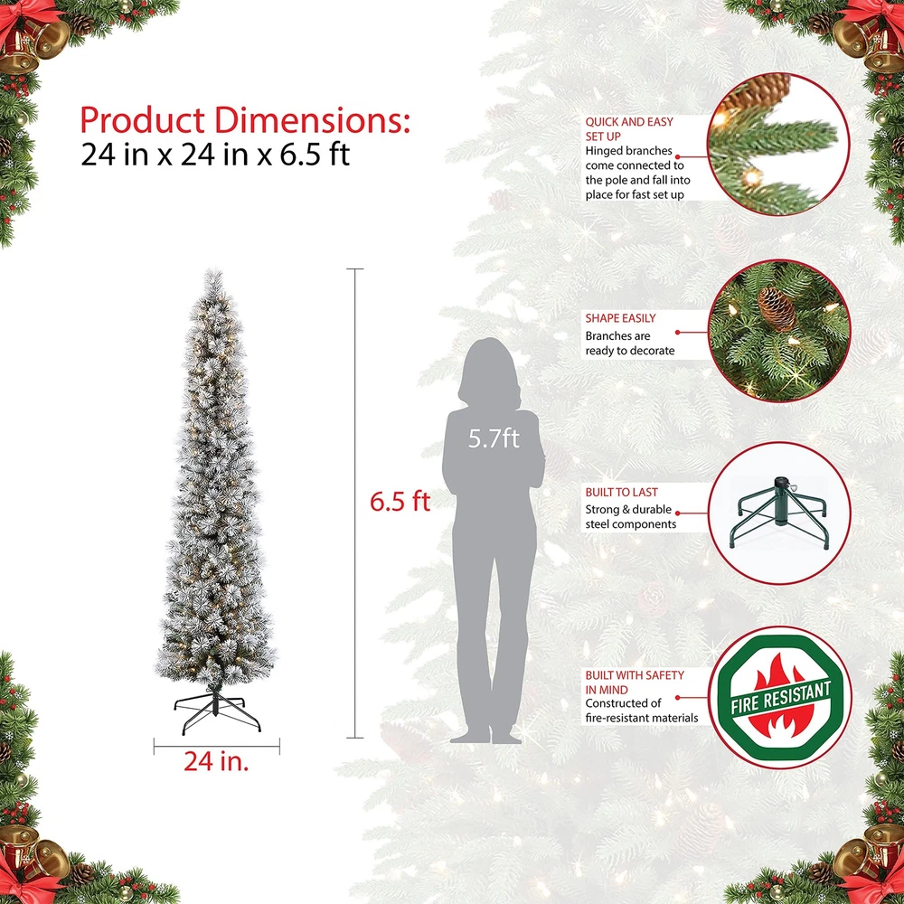 PRE-LIT ARTIFICIAL HOLIDAY TREE: This Pre-Lit Flocked Portland Pine Pencil Artificial Christmas Tree will light up any room in your home QUALITY BRANCHES AND LIGHTS: Equipped with 300 UL-listed lights and 410 branch tips to add festive holiday fullness SIMPLE ASSEMBLY: Assembly is quick and easy - just take the tree out of the box, adjust the branches, and plug in the lights to get decorating right away STURDY TREE STAND: Includes metal stand for your convenience INCLUDED WARRANTY: Backed by a 5-year warranty on tree, 2-year warranty on lights for years of quality use