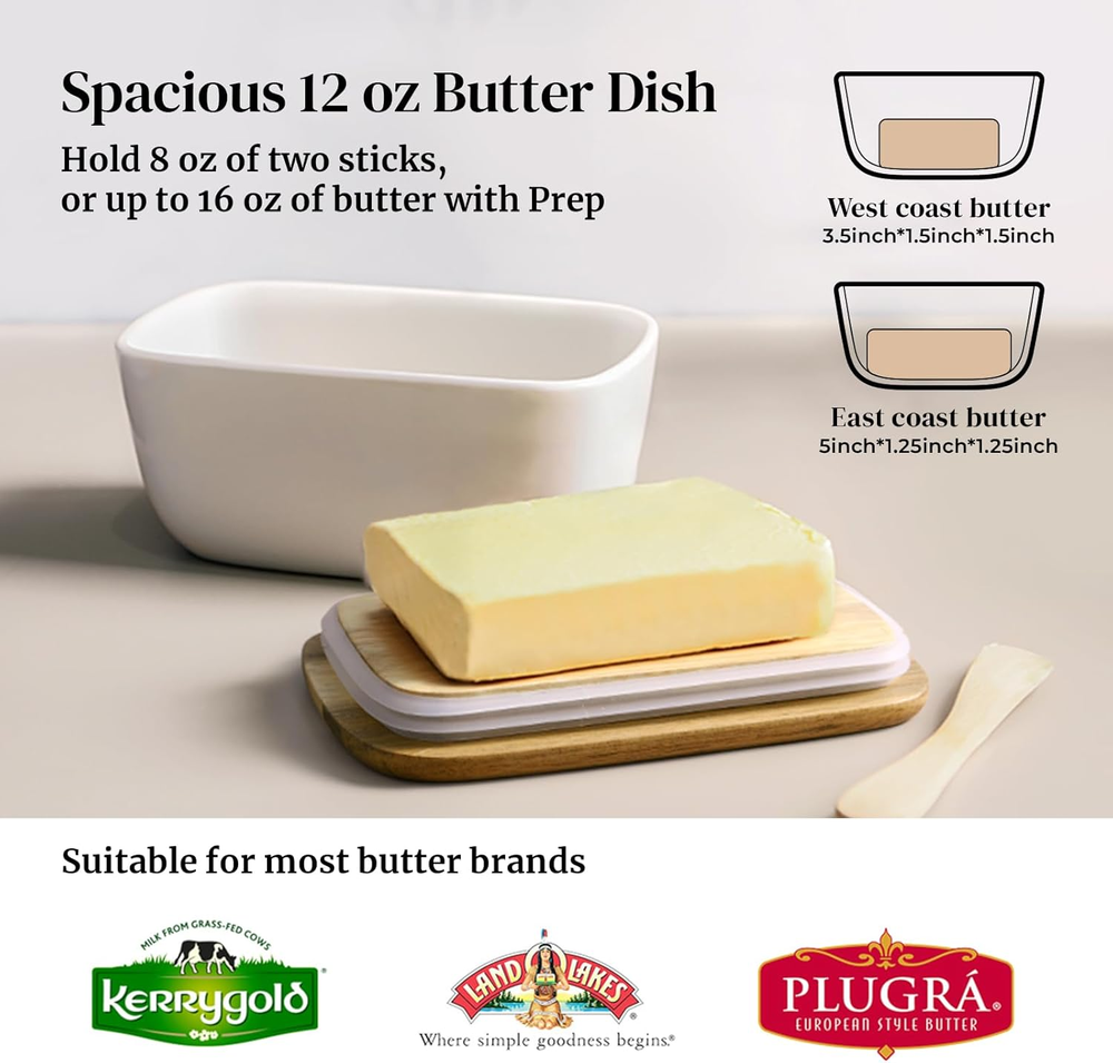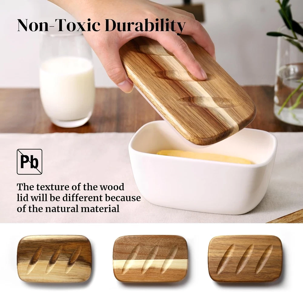 Large Butter Dish Holds Up to 3 Sticks : The inside dimensions of the lid are approximately 6.5" by 4", so it can hold 3 sticks of eastern-style butter stick (4.75" x 1.25") or a standard western-style butter stick (3.5" x 1.5"). Suitable for the whole family to use. Keep Butter Fresh for Longer: The butter dish with lid features a high-quality sealing silicone ring that helps keep butter fresher and longer and won't absorb the flavors of other foods in the refrigerator. Decorate Your Kitchen:The DOWAN butter dish with lid for countertop comes in six stylish colors and the natural acacia wood lid adds a rich texture, making it the perfect addition to any kitchen that will never go out of style. Healthy and Durable Ceramic: Ceramic butter dishes are the safest to use because they don't contain leachable lead or cadmium. DOWAN Butter dish is made with high-quality ceramic that has been fired at high temperatures, ensuring it's safe for dishwasher and long-lasting. Perfect Gift Choice: The DOWAN Butter holder comes carefully packaged in a box and is ready for gift-giving, whether to yourself or someone you love at Father's Day. Plus, it's dishwasher safe, making for easy cleaning. Product Description This beautiful enamel butter dish with wooden lid is perfect for keeping the butter in. The natural solid beech lid keeps the butter covered as well as keeping out air and light which spoils the butter. Stylish enough to keep on the kitchen side ready to spread over a slice of toast. DOWAN Porcelain Butter Dish Perfect for your Countertop Durable and non-stick porcelain: DOWAN insists on adopting good porcelain material, which can greatly prevent the crack, the chip, the fade, etc. Upgraded Silicone Seal: DOWAN constantly upgraded the silicone seal dozen of times, aims to provide the BEST storage room for the butter. Large Capacity & Universal Size: Suitable for most brands’ butter, which is wide and deep enough to hold 8 oz or two 4 oz sticks of butter. Dimensions: 6.5"L x 4"W x 3.1"H Accommodates all short and long butter sticks Lid helps keeps butter fresh and protected Premium porcelain material & BPA free A must-have accessory for butter lovers Why choose the DOWAN Porcelain Butter Dish with Lid? They are safe for freezer, microwave, dishwasher and oven as well (EXCEPT the wooden lid). The wooden Lid is Hand-wash only, Keep it dry after cleaning. Works great With sugar, coffee, salt, spices, seasoning, and cookie jars. The most ideal gift for your family, lover and friends to neaten kitchen counter easily. This dish is as practical as it is attractive, as it keeps your butter fresh while allowing it to soften up for easy spreading. Notes Dishwasher safe only for dish not the lid, the lid only wash by hands. Please do not clean with steel wool as it may cause abrasions over time. Please do not soak the lid in water for a long length of time as this will cause the wood to expand. Premium Material & BPA Free Made of premium AB porcelain, Chemical free so you won’t worry about BPA or harmful substance getting into your body. The butter will not be tainted by other odour, keep fresh and tasted. You have no trouble to handle greasy wrappers and to wipe off spilled butter. Upgraded Silicone Seal Sealed lid allows you to keep butter, margarine, and other shelf-stable condiments on counters and tables instead of inside the refrigerator so it stays soft and easily spreadable at room-temperature Durable and Non-stick Porcelain Durable porcelain and silicone seal can effectively prevent the spoilage of foods. Airtight lid keeps butter fresh in the fridge without mixing other foods’ taste.