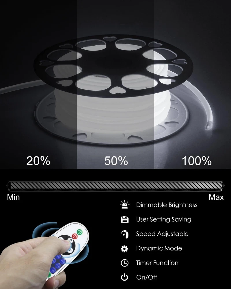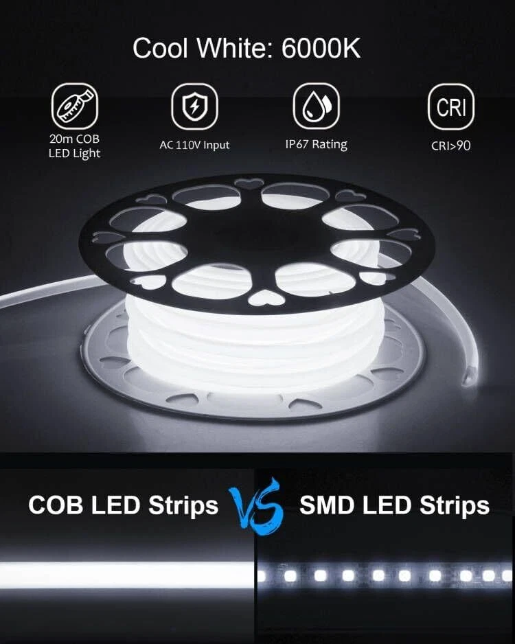 Product Description 65.6ft Outdoor COB LED Strip Lights Waterproof IP67 AC 110V 120V Dimmable LED Light Strip Daylight White 6000K 5760LEDs Uniform Glow Neon Light Strip with Remote for Patio Garden Pool Decor Plug and Play:AC 110V to 130V input, no power supply required. The extended 2-meter power cable spans a large area, allowing for great creativity. Using the controller, you can easily turn on and off the lights, adjust brightness and light modes.10-100% dimmable brightness, saving user settings. Dotless and Uniform Glow:288LED/M, 5760LED/20M, this high-density LED chip provides brighter, softer, and more uniform light than traditional SMD strip lights, without worrying about black spots. Daylight white 6000K, CRI>90. The continuous length of 20M is suitable for lighting projects that require long and high-quality LED strips. Flexible COB LED Strip: Made of flexible PCB, the LED strip is cuttable. It can also be bent freely to any shape. Along the cutting mark on the back, it can be cut once every 50 cm. The light strip is very suitable for indoor and outdoor DIY lighting projects. Such as ceilings, corridors, swimming pools, terraces, RVs, etc. All in One Kit:The kit includes 1 20-meter COB LED strip with AC 110V~130V input, 1 control, 95 mounting buckles, 95 screws, 2 AAA batteries, 2 end caps, and 2 connection pins.Easy installation without welding. Note:Please be careful when installing and using it!Do not roll it up when it is ligting! Widely used:LED strip is sealed with silicone hose, IP67 waterproof, which can beautify indoor and outdoor lighting scenes. It is very suitable for bedroom, kitchen, furniture lighting, living room, corridor, cabinet, wardrobe, TV wall, billboard backlight, bridge, parking lot, Christmas decoration and display cabinet, bar, hotel, KTV, nightclub, etc. About Us We are a reputable seller with many years of experience selling on eBay. Our goal is to provide high-quality products and excellent customer service. Payment 1.We accept PayPal only. 2.All major credit cards are accepted through secure payment processor PayPal. 3.Payment must be received within 7 business days of auction closing. 4.We ship to your eBay or Paypal address. Please make sure your eBay and Paypal address is correct before you pay. Feedback will be left automatically after we receive your feedback. Please contact us before leaving a Negative feedback or Neutral feedback. We would try our best to help you solving any problem. Shipping Items will be shipped within 1-3 business days when we received payment. (Orders are not processed on weekends & holidays) Tracking information will be sent once item is shipped. Delivery time depends on destination and other factors Item is shipped to ebay address. Leaving correct address can minimize delay. For international shipping and shipping to Guam, Hawaii and Alaska, Please contact us before placing the order. International buyers please note: Import duties, taxes and charges are not included in the item price or shipping charges. These charges are buyer’s responsibility. We will try our best to reduce the risk of the custom duties. Local pick-up is unavailable at the moment. Returns For any issues with Defects, Return, Item Exchange request, please contact us first and send us a message first before opening any type of case or request. We devote ourselves making EVERY CUSTOMER in 100% Satisfactory and resolve any problem. We highly value and appreciate your business. Thank you. No returns will be accepted without an RMA number. Please contact us for the RMA number. Return is acceptable within 30 days of delivery. Return for replacement or money back is optional. Returned items must be in the brand new, unaltered and resalable condition. Seller is not responsible for any labor cost, expense in a dealer store, or damage due to wrong installation. Contact Us We reply any email messages within 1 business / working days(off-duty at weekend). If you do not get a response from us, then please check your junk or spam mailbox. Our Business hours: Mon-Fri 9:00-18:00, UTC/GMT +8 hours. Please contact us either by clicking "contact seller" in the "purchase history" section or simply click "ask a question" at the bottom of this page. If you are unsatisfied with our item or service, please contact us before leaving any feedback. We are committed to resolve all issues in a friendly and satisfactory manner. powered by