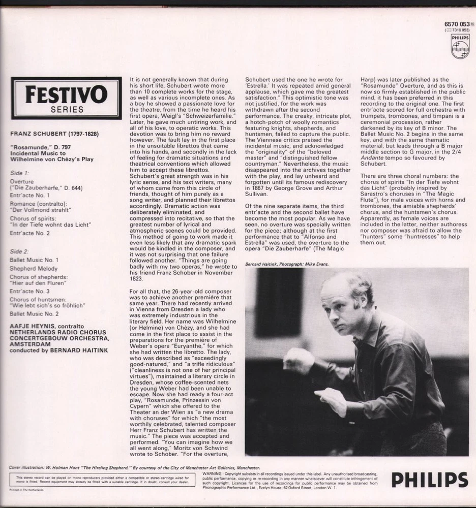 GRADING Our Grading System The table below is an overview of how our grading system works. The first grade is for the sleeve and second grade is for the media/disc, e.g. VG+/EX means that the item's sleeve is in Very Good Plus condition and the media/disc is in Excellent condition. If there is only one condition, e.g. /EX, it means that the item is not in a picture sleeve and that the media/disc is in excellent condition. Records that aren't in picture sleeves will either be in a company sleeve or a generic plain sleeve. If you have any questions, please get in touch. Condition Sleeve Media MINT (10/10) Mint, perfect Mint, perfect EX+ (9/10) Excellent plus, near mint Excellent plus, near perfect EX (8/10) Excellent, well looked after, clean, only slight signs of use Excellent, well looked after, clean, only slight signs of use EX- (7/10) Excellent minus, light wear and signs of use Excellent minus, light wear and signs of use VG+ (6/10) Very good plus, some moderate wear Very good plus, some scuffs, no deep marks VG (5/10) Very good, well used and worn Very good, well used and marked VG- (4/10) Very good minus, very worn Very good minus, very worn and marked GOOD (3/10) Good, some major wear Good, some major wear and scuffing FAIR (2/10) Fair, major wear Fair, major wear and scuffing POOR (1/10) Poor, severe wear Poor, severe wear and scuffing DELIVERY Combined Postage If you add all the items you wish to purchase from us to your shopping basket/cart, and then go to the checkout page from the shopping basket page, the shipping cost will be automatically combined. Packaging All of our items are parcelled using strong specially designed packaging, each vinyl in an order is placed in a clear plastic sleeve and plain paper white sleeve, and is separated from its cover (unless it is advertised as sealed), to prevent any damage during transit. If an item is sealed, and you would prefer the vinyl to be placed outside of its sleeve before dispatch, please let us know. Prices You can see all delivery options and prices for an item on the "Postage and payments" tab. Tracked delivery If you wish to have a tracking number with your order, please select the "Signed" or "Express" delivery option, "Standard" delivery does not include a tracking number. SHOP Click here to view our Ebay shop, with over 200,000 items in stock FAQ Does a used item include the original inner sleeve/insert/poster etc.? We will always include in the description if a used item includes any additional parts, e.g. "with inner" or "includes poster", if you know an item originally came with any additional parts, such as a printed inner sleeve, and it isn't mentioned in the description, then generally the used item won't include it, but please feel free to ask. New items will always be complete, unless otherwise specified. CATEGORIES Shop Home 10" Vinyl Records 12" Vinyl Records 7" Vinyl Records Cassettes (Tape) CDs (Compact Discs) LP Vinyl Records Music Memorabilia Other Artist Aafje Heynis / Bernard Haitink / Concertgebouw-Orchester, Amsterdam Title Schubert - Rosamunde Format LP Vinyl Country Netherlands Label Philips Catalogue Number 6570053 Description 10 track stereo - record made in England, sleeve printed in Netherlands Condition (Sleeve/Disc) EX/EX Track List Schauspielmusik Zu Rosamunde, D. 797 A1. Ouvertüre (Die Zauberharfe, D. 644) A2. Zwischenaktmusik Nr. 1 A3. Romanze (Altsolo): Der Vollmond Strahlt Auf Bergeshöh'n A4. Geisterchor: In Der Tiefe Wohnt Das Licht A5. Zwischenaktmusik Nr. 2 B1. Ballettmusik Nr. 1 B2. Hirtenmelodie - Hirtenchor: Hier Auf Den Fluren, Mit Rosigen Wangen B3. Zwischenaktmusik Nr. 3 B4. Jägerchor: Wie Lebt Sich's So Frölich Im Grünen B5. Ballettmusik Nr. 2 DELIVERY INFORMATION If you wish to have a tracking number with your order, please choose the Signed or Express delivery option, the Standard delivery option does not include a tracking number. Please note, the Express option for delivery outside of the UK includes a tracking number, but has the same delivery time as the Standard option. ABOUT US Vinyl Tap has been in the business of selling music for over 30 years, and in that period we have supplied many thousands of collectors and music fans around the globe with vinyl, CDs and music memorabilia. You can check out the over 200,000 items that we have in stock on our Ebay shop, here . Artist: Aafje Heynis / Bernard Haitink / Concertgebouw-Orchester, Amsterdam - Title: Schubert - Rosamunde - Format: LP Vinyl - Country: Netherlands - Label: Philips - Catalogue Number: 6570053 - Year: - Description: 10 track stereo - record made in England, sleeve printed in Netherlands
