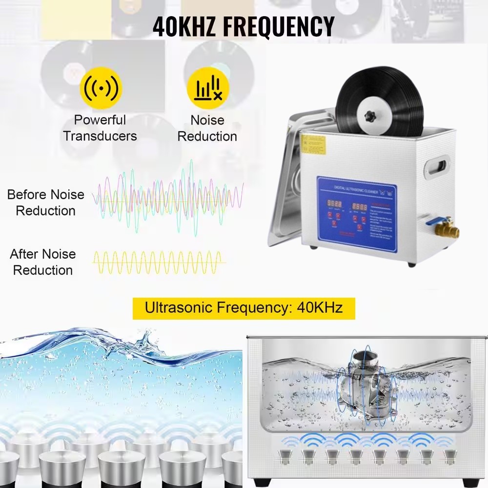 Product Description Specifications: External Dimensions (mm): 325 x 180 x 280(12.8*7.09*11") Inner Tank Dimensions (mm): 300 x 150 x 150(11.81*5.91*5.91") Ultrasonic Frequency: 40 kHz (single frequency) Ultrasonic Power: 180 W Non-slip Anti-static Feet: 4 Heating Power: 300 W Ultrasonic Transducers: 3 Time Control: 1–30 minutes Temperature Control: Room Temperature–80°C Tank Capacity: 6.5 L Tank Thickness: 1.1 mm Tank Material: 304 Stainless Steel Display Panel: Digital Display Weight: 7 kg Function: Ultrasonic Power Supply Voltage: 110/220V Feature: 1. Digital timing, free setting in (1-30) minutes 2. Double insurance power socket for safe use 3. 6 discs can be cleaned at one time with a lifting bracket 4. Material of durable SUS304 stainless steel, corrosion protection 5. Automatic thermostat heating system, Room Temperature-80° freely set 6. The power cord adopts the industrial power standard, and the thickened wire is heat-resistant and softened resistance. Package Included: 1 x Album Disc Ultrasonic Cleaner One set of accessories Payment Policy Shipping Policy Returns Policy About us Payment Policy NOTE: Import duties, taxes and chargers are not included in the item price or shipping charges. These charges are the buyer's responsibility. Please check with y our country's customs o ffice to determine what these additional costs will be prior to bidding buying. Shipping Policy 1. We Ship to Worldwide. 2. Item are shipped from S henzhen using Airmail, reach most of the countries within 10 to 35. 3. Delivery time depends on destination and other factors, it may takes up to 40 business days. 4. We are not responsible for undeli verable address, we reserve the right to charge the shipping fee again for returned items due to wrong address. Returns Policy 1. All Returned items Must Be in the original packaging and you MUST PROVIDE us with the shipping tracking number, specific reason for the return,and your ebay ID. 2. We will refund YOUR FULL WINNING BID AMOUNT, upon receipt of the item in its original condition and packaging with all components and acc essories included, AFTER BOTH Buyer and Seller cancel the transaction form ebay. OR, you may choose to have a replacement. 3. Return shipping is to be bear by the Buyer. About us 1. We greatly appreciate your POSITIVE feedback. Please do NOT leave negative feedback without asking for help. Our aim is to provide Top Level Customer Service, normally so we will try our best to solve any problem you have. 2. Please DON'T leave negative or neutral feed back if you haven't received item in 30 days, because we have mentioned the shipping time repeatedly. Copyright © 2023 Dianxiaomi