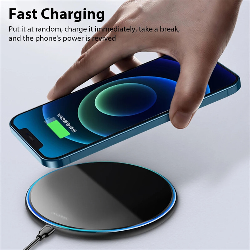 Easy to charge wirelessly and compatible with the case: The fast wireless charger allows you to charge your device 1.8 times faster than a standard wireless charger. Don't fumble with the phone case. Direct induction charging through protective covers up to 6mm/0.23 inch thick (excluding covers with magnetic or metal fittings). Thin and cool design: light, elegant and compact design with anti-skid rubber. This wireless charging pad is very thin, only 6 mm/0.23 inch. It takes up little space and is easy to place in your pocket. The high-speed wireless power charging pad is easy to carry when traveling or doing business. Whether you use it in the office or at home, this charger feels solid and looks good. Smart indicator light: When the power is turned on, if no charging device is detected within 20 seconds, the indicator light will turn on green for 20 seconds. When you place the phone or headset in the charging state, the indicator light will turn off automatically. The faint blue light flickers slowly until it is fully charged. Weak light will not affect your sleep. Specifications: Color: black/white/red/gold Output: 5W/7.5 W/10W/15W/20W/ (the maximum charging speed of 20W is faster than others) Charging efficiency:>75% Charging frequency: 110-205 kHz The package includes: 1x Wireless Fast Charger Pad 1 * 1M C-type USB cable (not included if not selected)