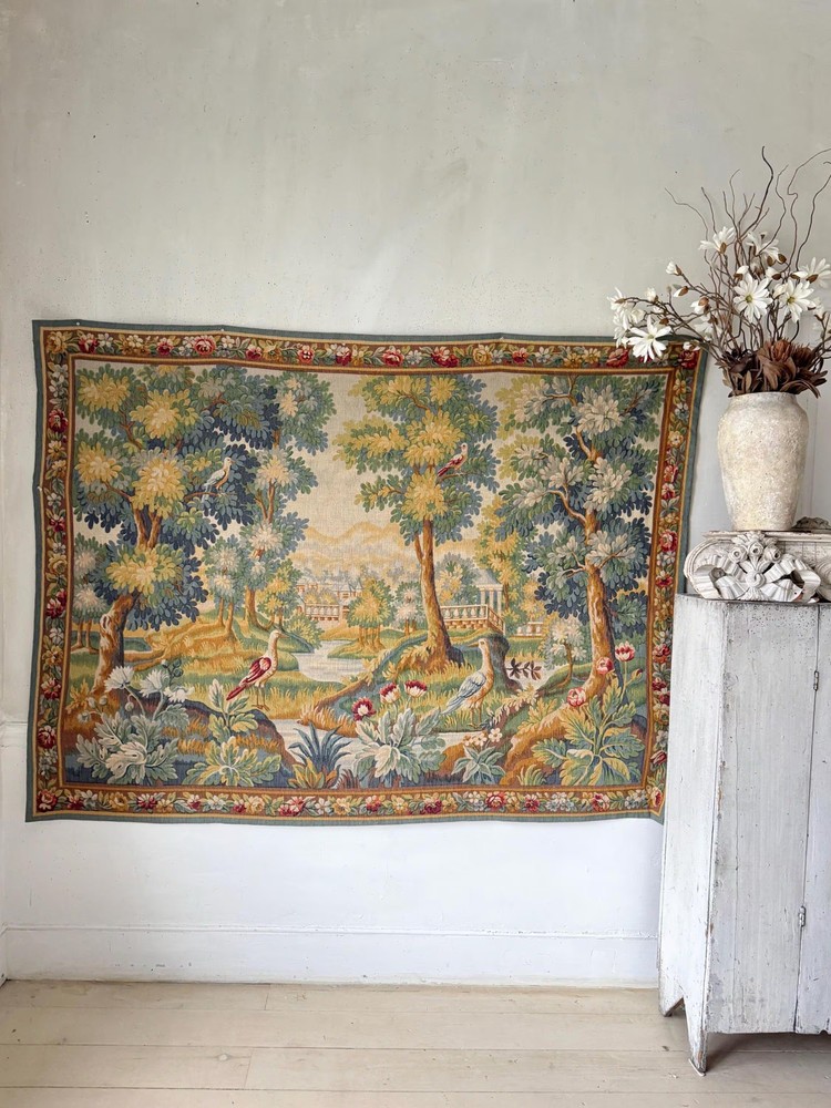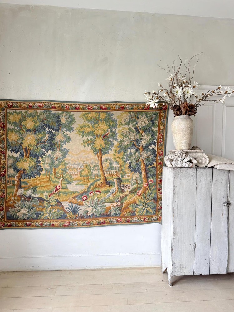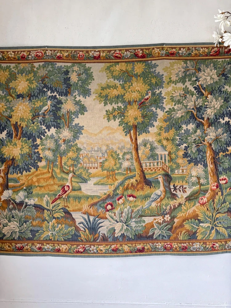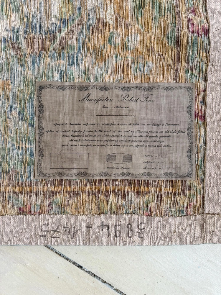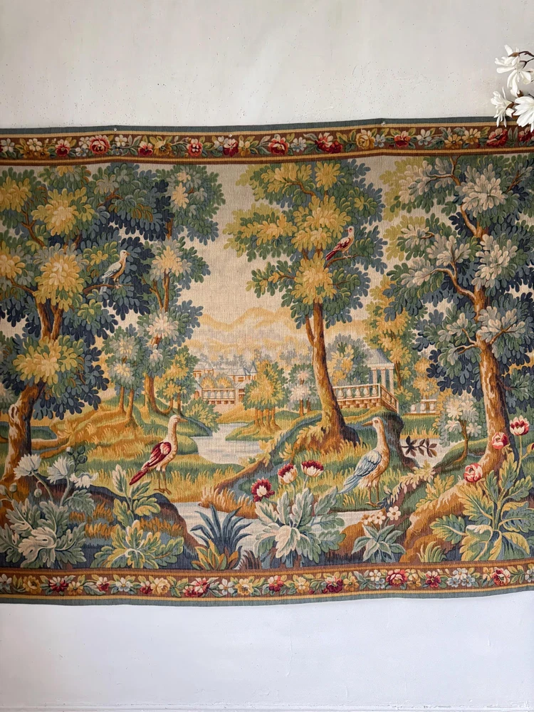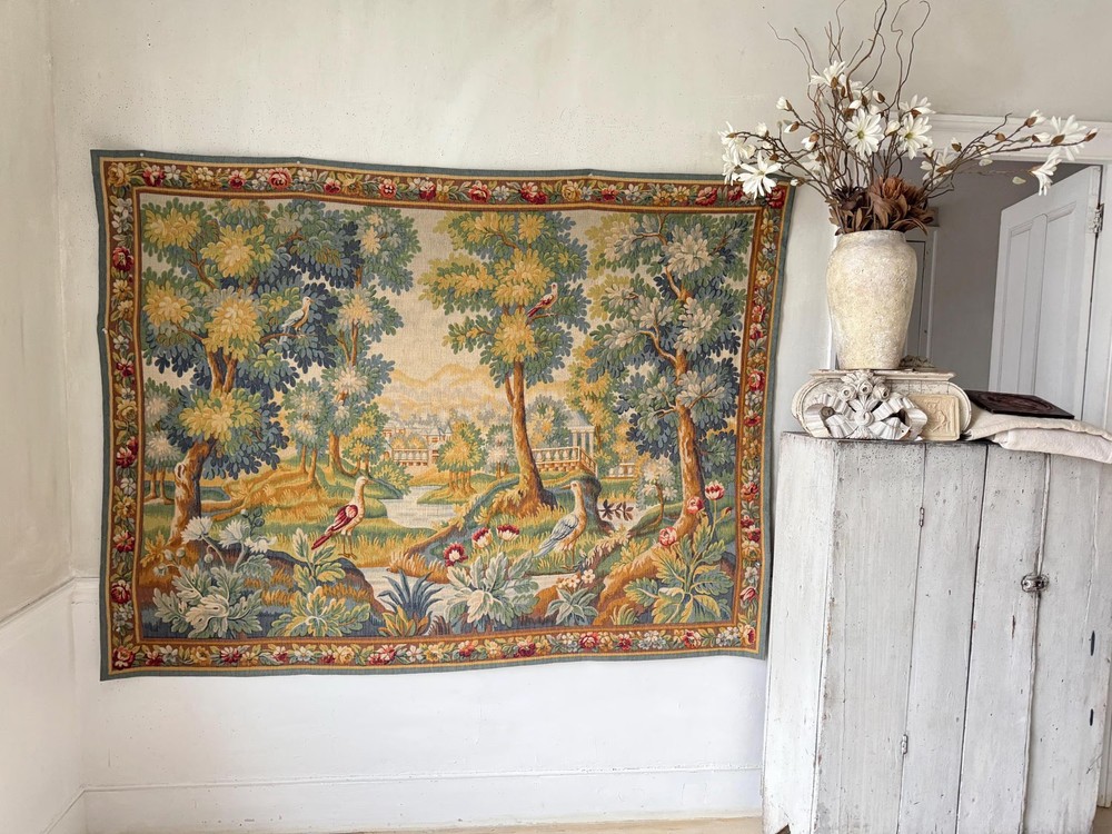Welcome to The Textile Trunk! This beautiful French verdure tapestry immediately drew my eye for its peaceful landscape, soft foliage, and charming birds set within a classical garden setting. The design is inspired by traditional 18th century French verdure tapestries and has a timeless, calm presence. I purchase this from a tapestry collector, they had matching tapestries of this Chantilly!~ To view the others just search my store for the word Chantilly ~ This tapestry was made in France by Manufacture Robert Four, Paris–Aubusson, and is titled “Verdure Chantilly.” The original label remains intact on the reverse. According to the manufacturer’s tag, this piece is a faithful reproduction of an 18th century tapestry, produced using a serigraph printing process applied deep into the wool fibers, following traditional old style techniques. It is clearly marked Made in France and numbered Work no. 1475 Robert Four was known for producing high quality decorative wall tapestries during the mid 20th century, drawing directly from historic French designs while using durable weaving and printing methods intended for interior display. These tapestries were made to bring the beauty of classical French landscapes into everyday homes rather than serving as upholstery or floor coverings. The color palette is wonderfully soft and easy to live with, featuring muted greens, gentle blues, warm golden tones, and subtle floral accents. The scene is framed with a floral border and works beautifully in country homes, chateau inspired interiors, rustic spaces, and layered antique settings. Landscape orientation. This is a decorative tapestry intended for wall display. It can be hung as is or mounted if preferred. Pieces like this allow historic French designs to continue living on in modern interiors, appreciated and reused rather than forgotten. MEASUREMENTS: This tapestry measures approximately 79 inches wide by 56 inches long. CONDITION: This textile work of art is in good condition with signs of time and use consistent with age. Light undulation to the weave and gentle handling wear visible on the reverse, as expected. No major issues noted. Please use the zoom feature on the photographs to see the exact condition!~ Inventory: L 55