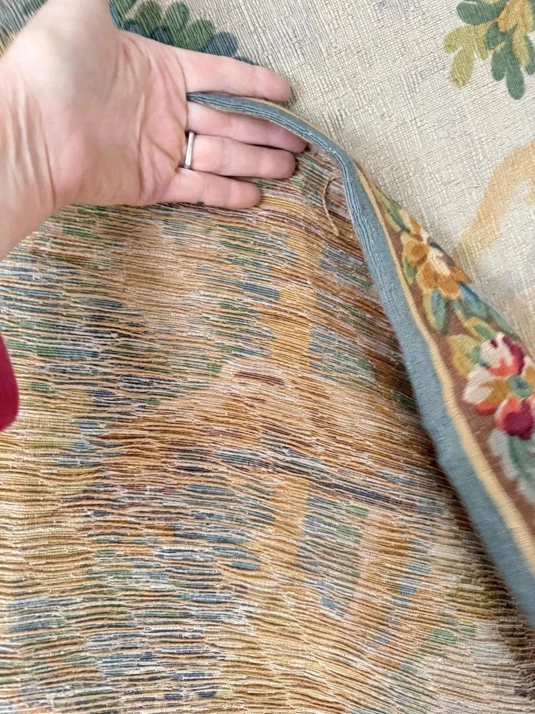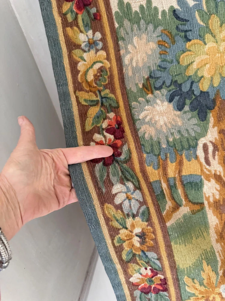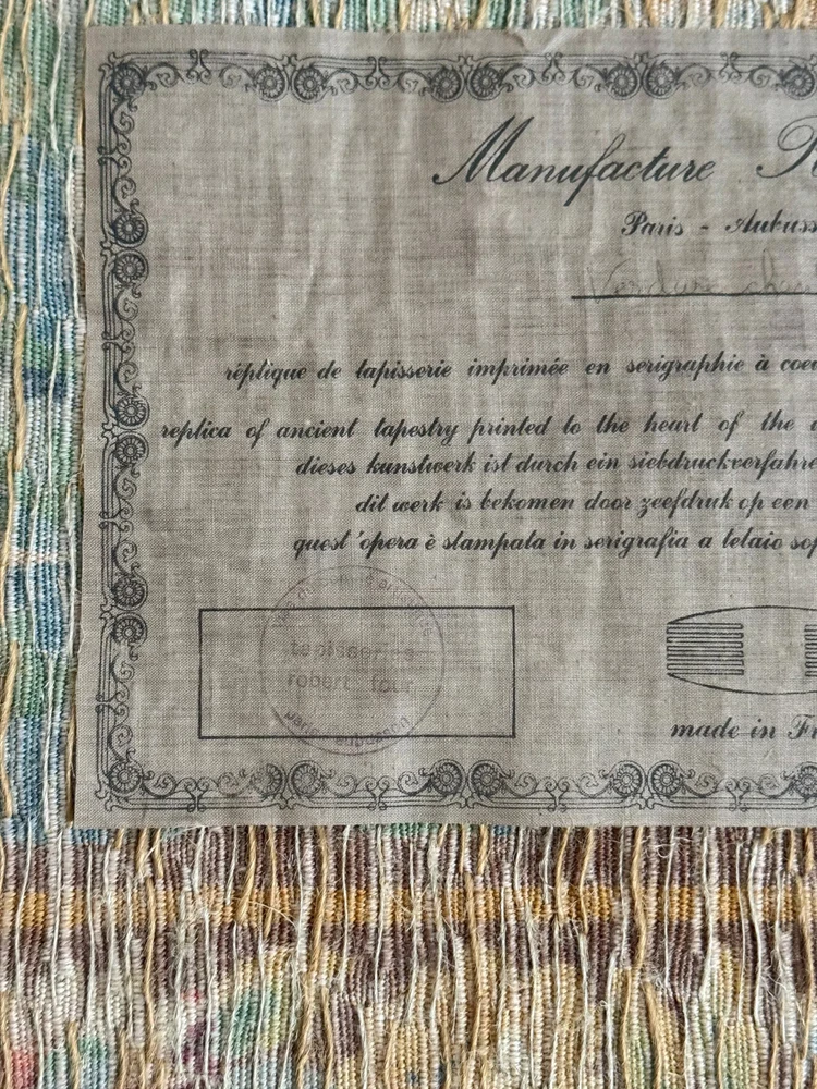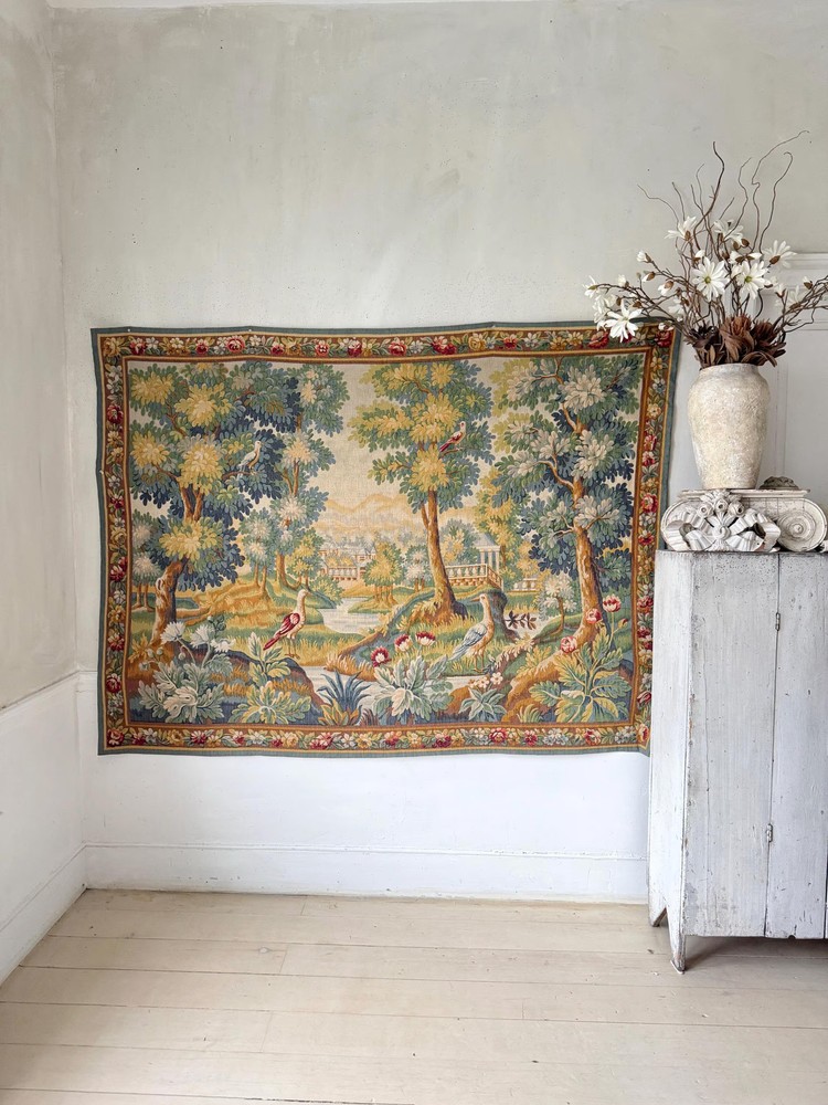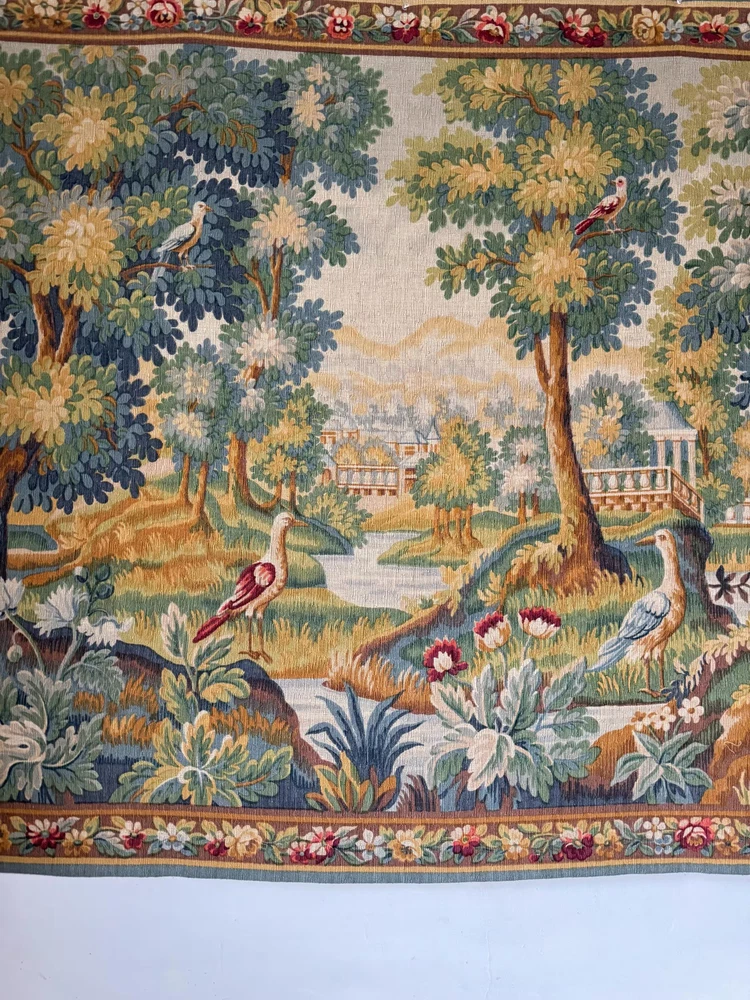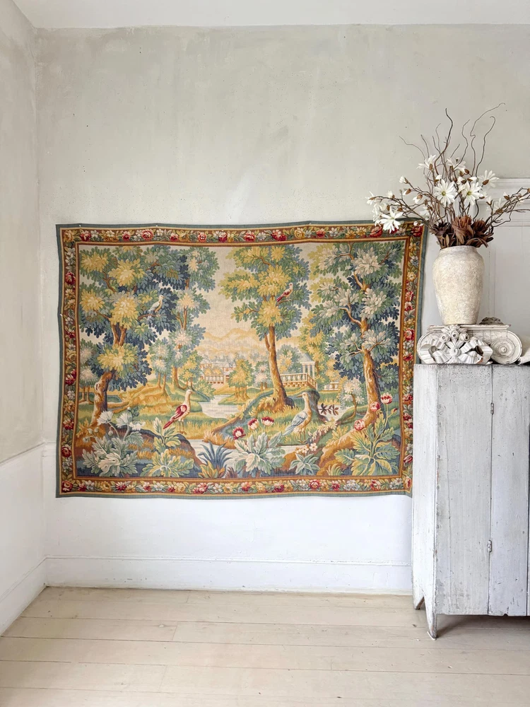 Welcome to The Textile Trunk! This beautiful French verdure tapestry immediately drew my eye for its peaceful landscape, soft foliage, and charming birds set within a classical garden setting. The design is inspired by traditional 18th century French verdure tapestries and has a timeless, calm presence. I purchase this from a tapestry collector, they had matching tapestries of this Chantilly!~ To view the others just search my store for the word Chantilly ~ This tapestry was made in France by Manufacture Robert Four, Paris–Aubusson, and is titled “Verdure Chantilly.” The original label remains intact on the reverse. According to the manufacturer’s tag, this piece is a faithful reproduction of an 18th century tapestry, produced using a serigraph printing process applied deep into the wool fibers, following traditional old style techniques. It is clearly marked Made in France and numbered Work no. 1475 Robert Four was known for producing high quality decorative wall tapestries during the mid 20th century, drawing directly from historic French designs while using durable weaving and printing methods intended for interior display. These tapestries were made to bring the beauty of classical French landscapes into everyday homes rather than serving as upholstery or floor coverings. The color palette is wonderfully soft and easy to live with, featuring muted greens, gentle blues, warm golden tones, and subtle floral accents. The scene is framed with a floral border and works beautifully in country homes, chateau inspired interiors, rustic spaces, and layered antique settings. Landscape orientation. This is a decorative tapestry intended for wall display. It can be hung as is or mounted if preferred. Pieces like this allow historic French designs to continue living on in modern interiors, appreciated and reused rather than forgotten. MEASUREMENTS: This tapestry measures approximately 79 inches wide by 56 inches long. CONDITION: This textile work of art is in good condition with signs of time and use consistent with age. Light undulation to the weave and gentle handling wear visible on the reverse, as expected. No major issues noted. Please use the zoom feature on the photographs to see the exact condition!~ Inventory: L 55
