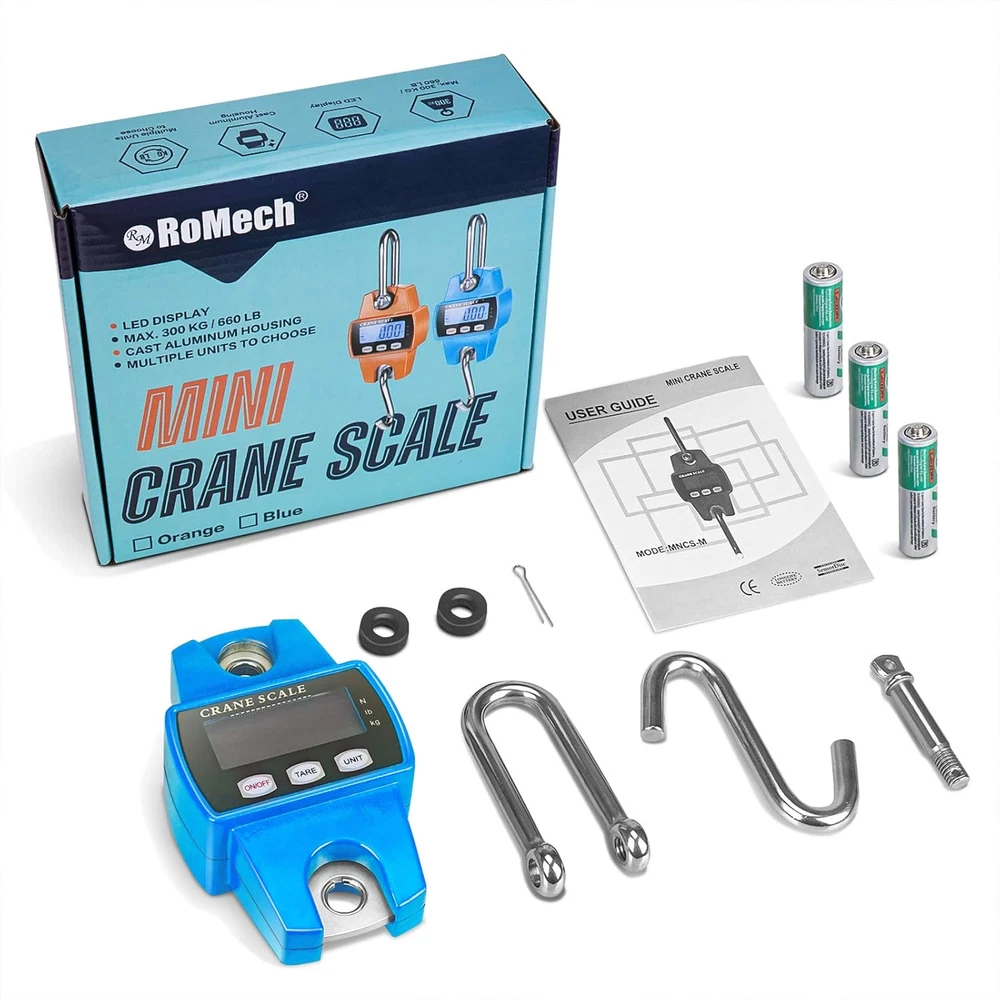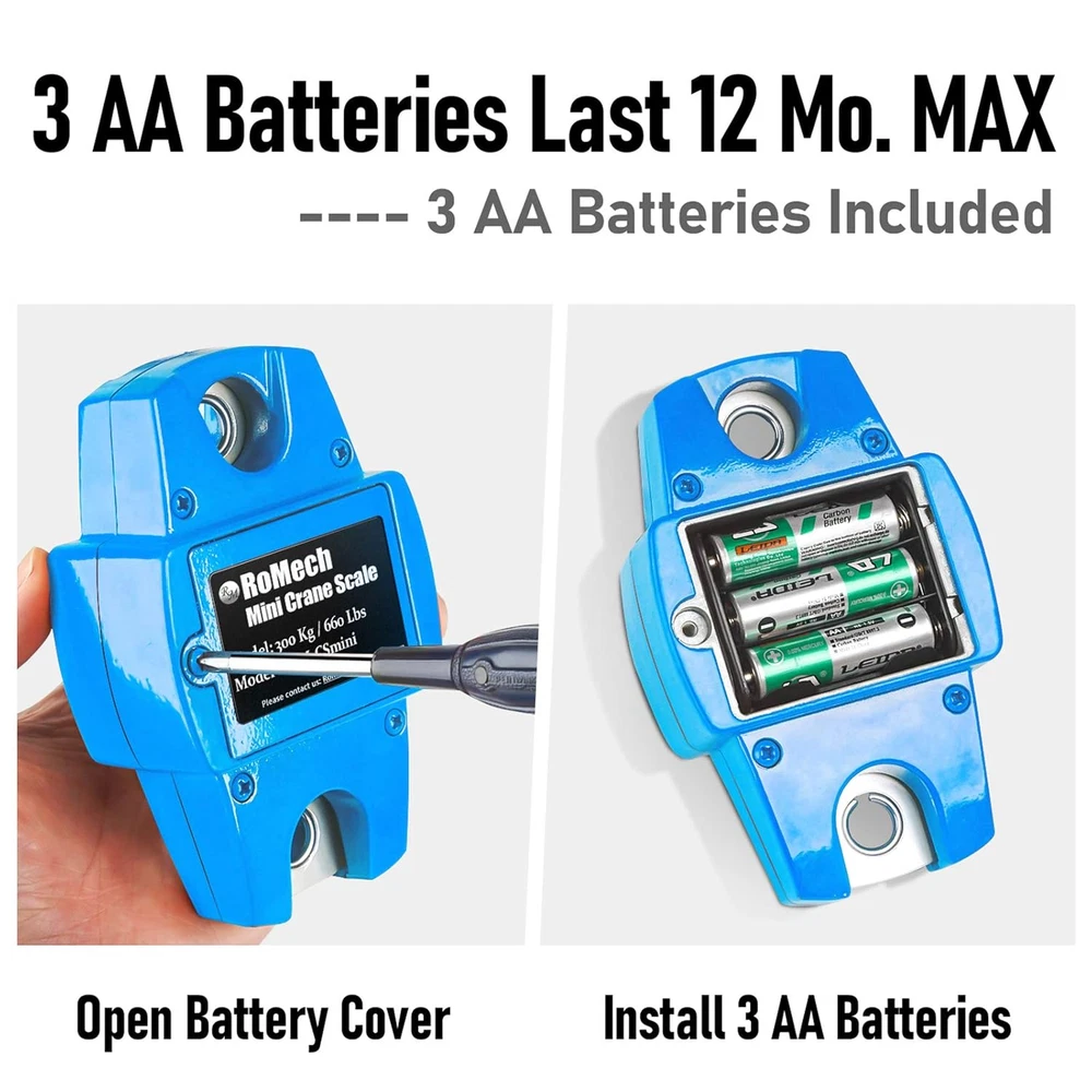 ✔️Portable: mini size hand held crane scale with S-shape hook, 300kg/660lb capacity, suitable for farm, hunting, fish weight, travel and more indoor outdoor activities ✔️Multi-function and Accurate: press "UNIT" to switch from "lb" to "kg" to "N". Press "HOLD/TARE" to turn on or off hold readings function for further use. The increment is 0.05kg / 0.02lb / 0.1N. The accuracy is ± 0.1%. ✔️Assembly: please refer to the product image to assemble within minutes; disassembly is also easy when you need ✔️Batteries: 3 AA batteries (non-rechargeable) included in the package; Normally lasts for 6 month at least ✔️QUALITY COMMITMENT: We stand behind the quality of our products. If for any reason you are not satisfied with your purchase, please . We provide 45-day money back and 12-month warranty. 100% Satisfaction Guarantee for risk-free shopping! Product Description ALUMINIUM BODY Exterior made with cast-aluminum, almost the same weight as plastic but much stronger and more sturdy than plastic body, no need to worry about dropping, scratching or cracking. SIMPLE TO USE All 3 buttons are easy to read and use, just push and choose the corresponding function you need. DETAILS All parts are carefully machined and assembled together, to make sure that each unit is reliable to use for customer. ASSEMBLY Follow this figure to assemble within minutes and also, you can dissemble when not in use. BATTERY INCLUDED We prepared 3 AA alkaline batteries in the package. Normally, 3 AA batteries will last up to 12 month but it may not if uses are too many. DIMENSION This is the actual dimension of mini crane scale, the hanging scale body is almost the same size of a grown-up man's palm, for your reference.