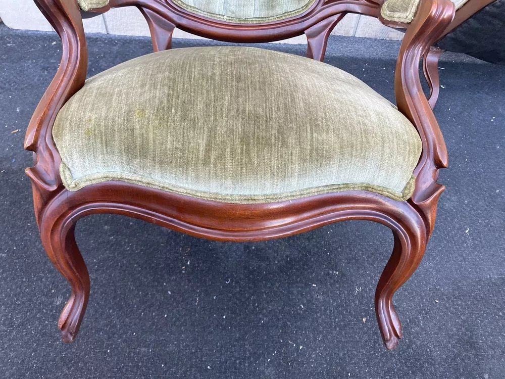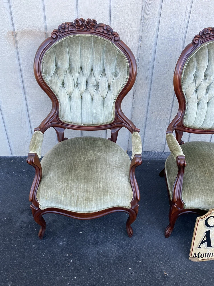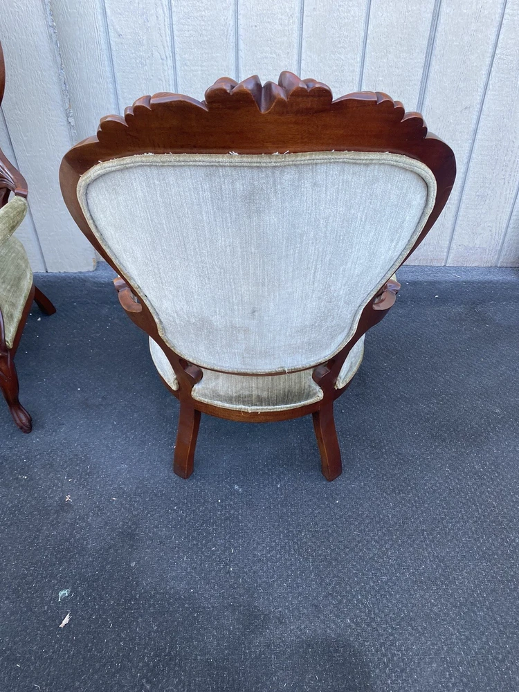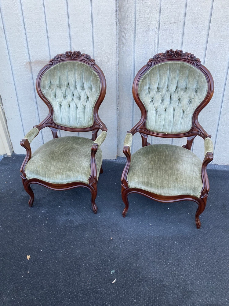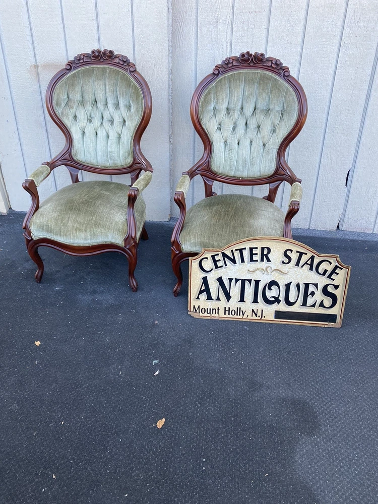 Item Description- pair of Victorian furniture armchairs. They are tight and sturdy and in good condition. The one seat does need some more foam cushion on the seat as per picture. WE SHIP ANYWHERE IN THE USA. IF YOU NEED A HOME DELIVERY QUOTE EMAIL US YOUR ZIP CODE. THE EBAY SITE IS SOMETIMES BROKEN AND WILL NOT LET YOU PURCHASE AN ITEM SAYING WE DO NOT SHIP TO YOUR LOCATION. THE WORK AROUND IS TO MAKE AN OFFER FOR THE AMOUNT STATED ON THE LISTING THEN WAIT FOR ME TO INVOICE YOU BEFORE TRYING TO PAY. SHOWROOM NUMBER 609 261 0602 Age- circa 1980 Size-26"W x 30"D x 45"H Seat 18"H This item can be packaged, insured and shipped via freight directly to your home . Please ask for a home delivery quote before purchasing this item.