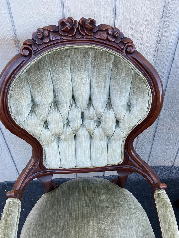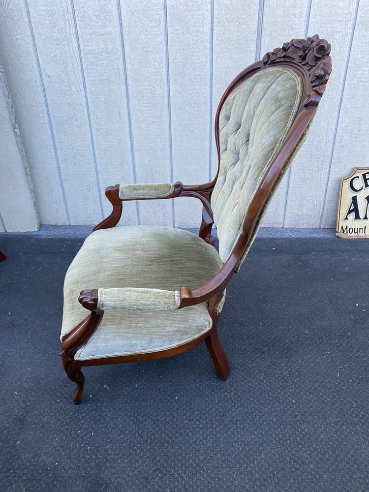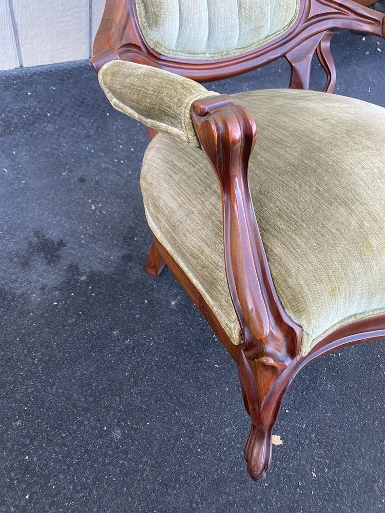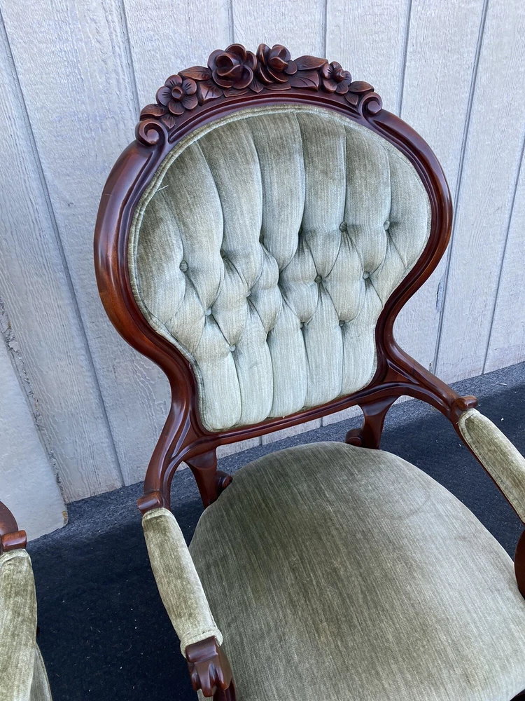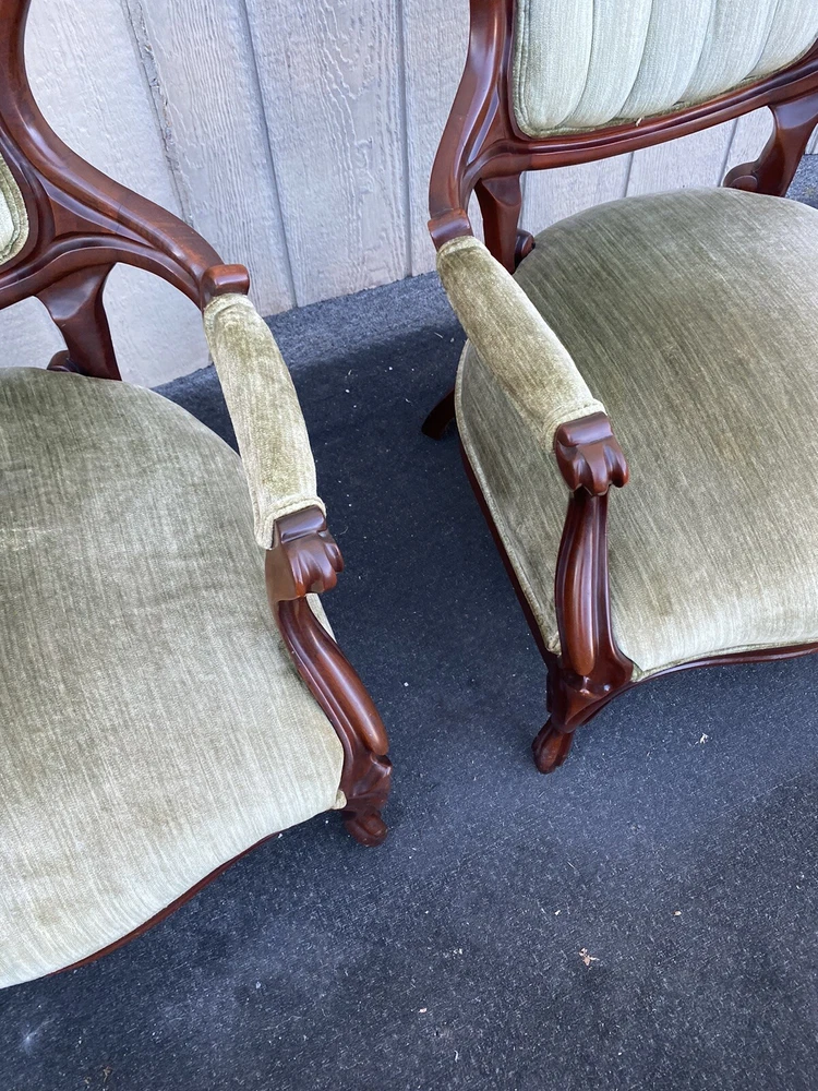 Item Description- pair of Victorian furniture armchairs. They are tight and sturdy and in good condition. The one seat does need some more foam cushion on the seat as per picture. WE SHIP ANYWHERE IN THE USA. IF YOU NEED A HOME DELIVERY QUOTE EMAIL US YOUR ZIP CODE. THE EBAY SITE IS SOMETIMES BROKEN AND WILL NOT LET YOU PURCHASE AN ITEM SAYING WE DO NOT SHIP TO YOUR LOCATION. THE WORK AROUND IS TO MAKE AN OFFER FOR THE AMOUNT STATED ON THE LISTING THEN WAIT FOR ME TO INVOICE YOU BEFORE TRYING TO PAY. SHOWROOM NUMBER 609 261 0602 Age- circa 1980 Size-26"W x 30"D x 45"H Seat 18"H This item can be packaged, insured and shipped via freight directly to your home . Please ask for a home delivery quote before purchasing this item.