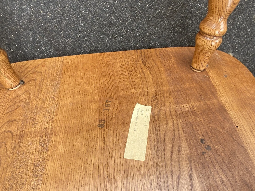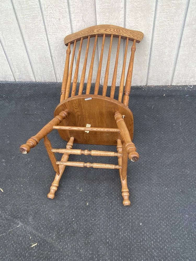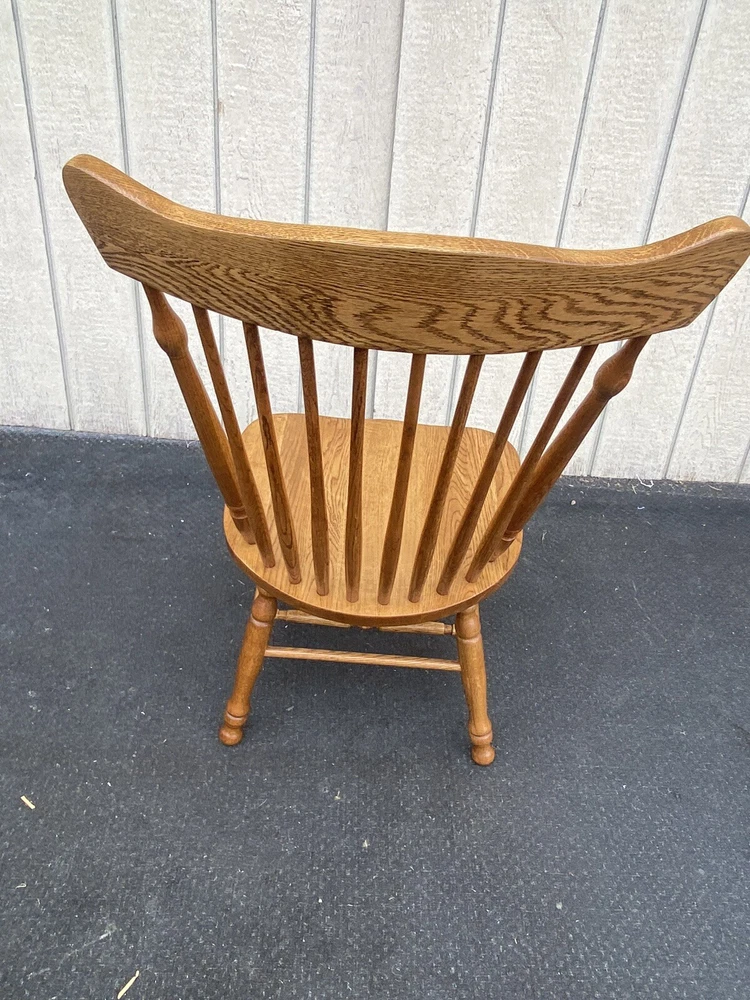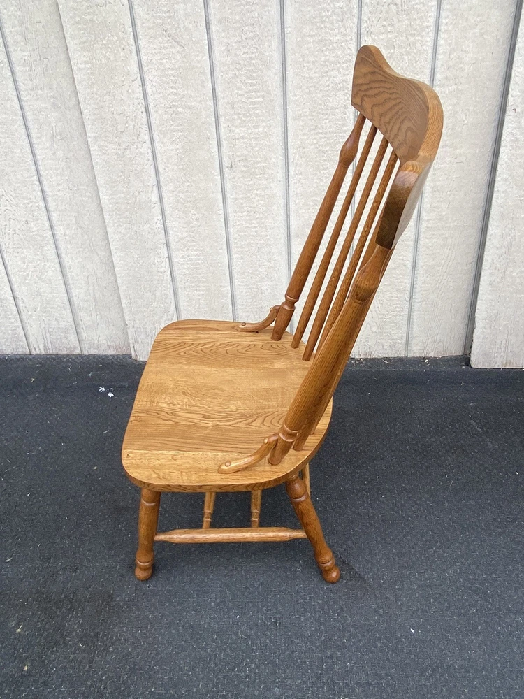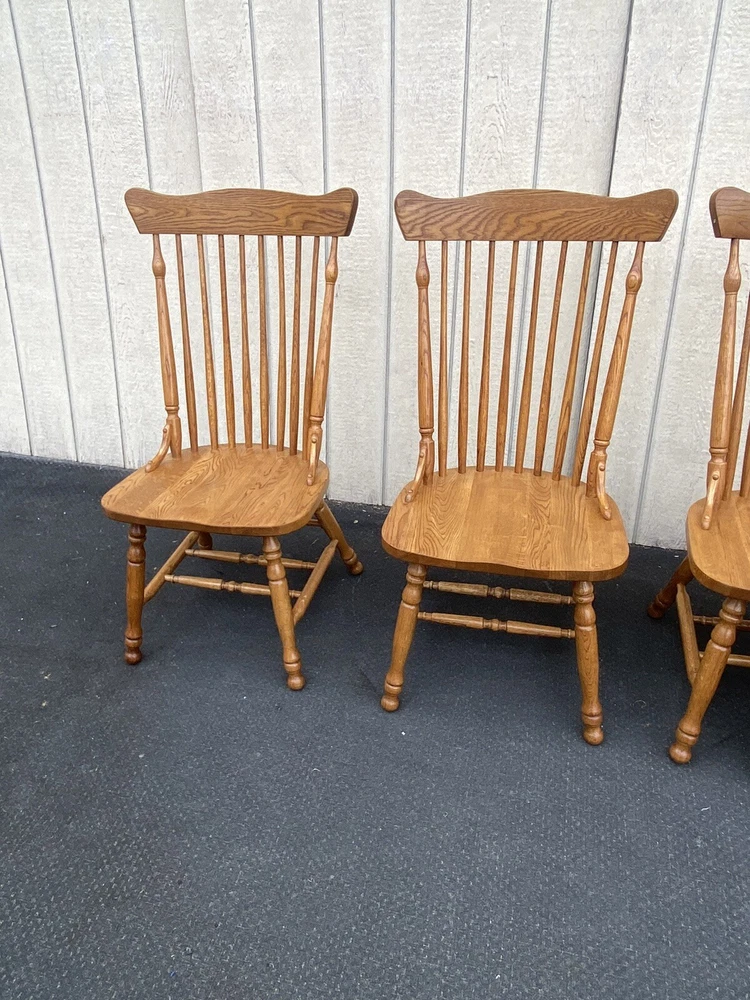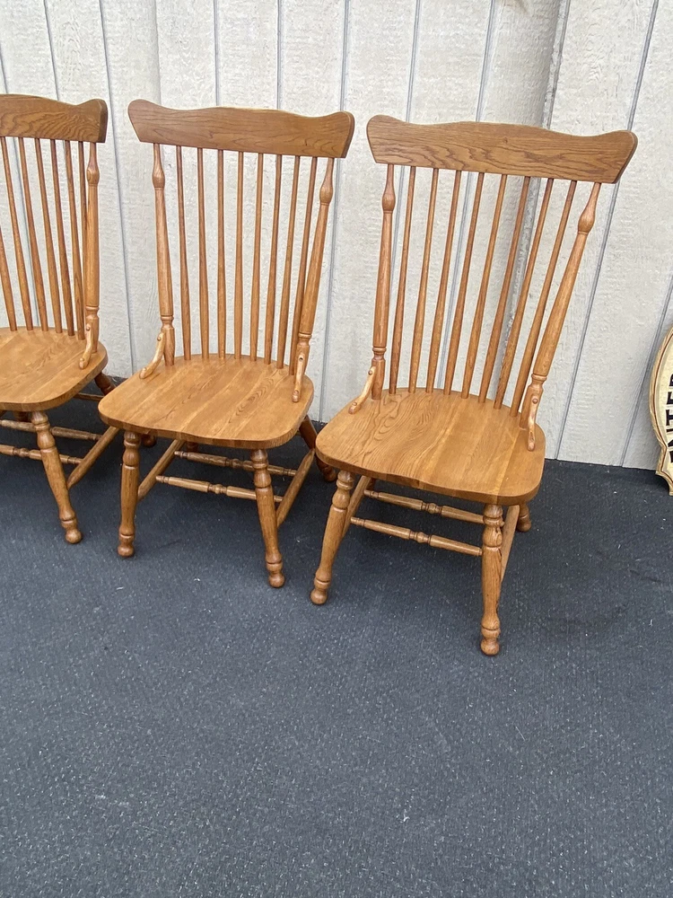 Item Description- Set of 4 solid oak dining chairs. They are all very comfortable and tight and sturdy and in very good condition. Age- circa 1990 Size- 21"W x 23"D x 42"H Seat 18"H This item can be packaged, insured and shipped via freight directly to your home. Please ask for a home delivery quote before purchasing this item. SHIPPING: Center Stage does our own deliveries to New York, Pennsylvania and New Jersey including the New York city and Philadelphia area every 2-4 weeks at very reasonable rates. For a delivery quote please email us with a city and zip code. WE SHIP ANYWHERE IN THE USA. IF YOU NEED A HOME DELIVERY QUOTE EMAIL US YOUR ZIP CODE. THE EBAY SITE IS SOMETIMES BROKEN AND WILL NOT LET YOU PURCHASE AN ITEM SAYING WE DO NOT SHIP TO YOUR LOCATION. THE WORK AROUND IS TO MAKE AN OFFER FOR THE AMOUNT STATED ON THE LISTING THEN WAIT FOR ME TO INVOICE YOU BEFORE TRYING TO PAY. SHOWROOM NUMBER 609 261 0602. BUYER IS RESPONSIBLE TO PAY SHIPPING COSTS ON ALL ITEMS! If you need home delivery email us with your zip code for a quote. Large items or those over 100 lbs. will need freight shipping and we are happy to provide a free quote but you will pay the shipper directly. Expect delivery times on these items to be approx. 2-6 weeks depending on your location. All local deliveries within 50 miles and to NYC are done by Center Stage Antiques. If you are picking up from our store you will need to contact us with a pick up time. NJ residents and buyers picking up are subject to NJ sales tax. Center Stage Antiques has been at its current location for 30 years, selling high quality used estate furnishings at a fraction of the cost. All items are sold in their original condition and ready to place in your home. If you have any specific questions regarding the condition of an item please email us before bidding. We are a small family business who do everything ourselves including packaging and local deliveries.