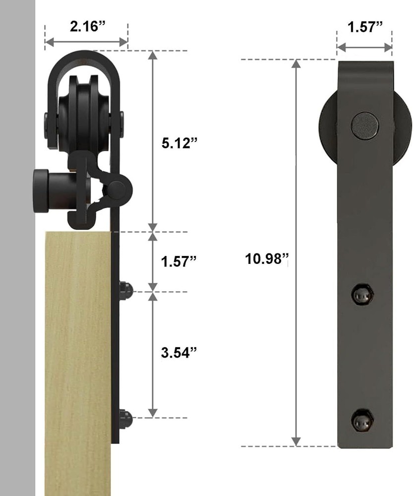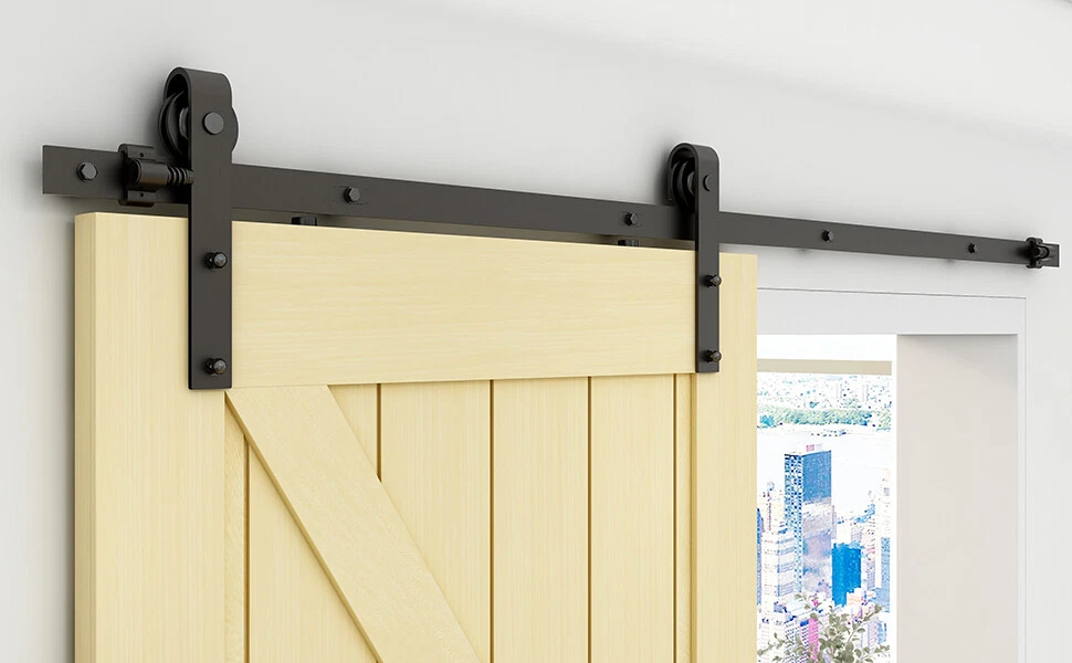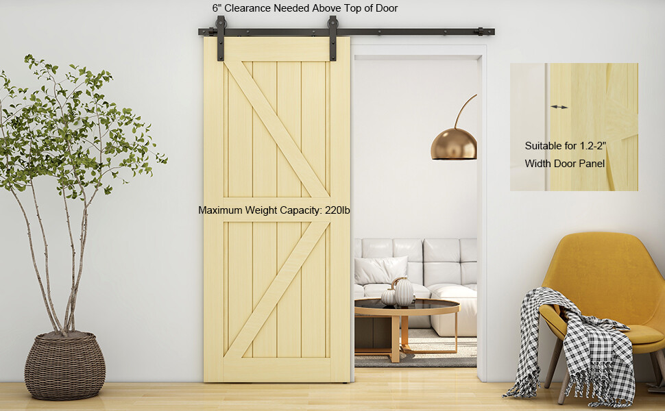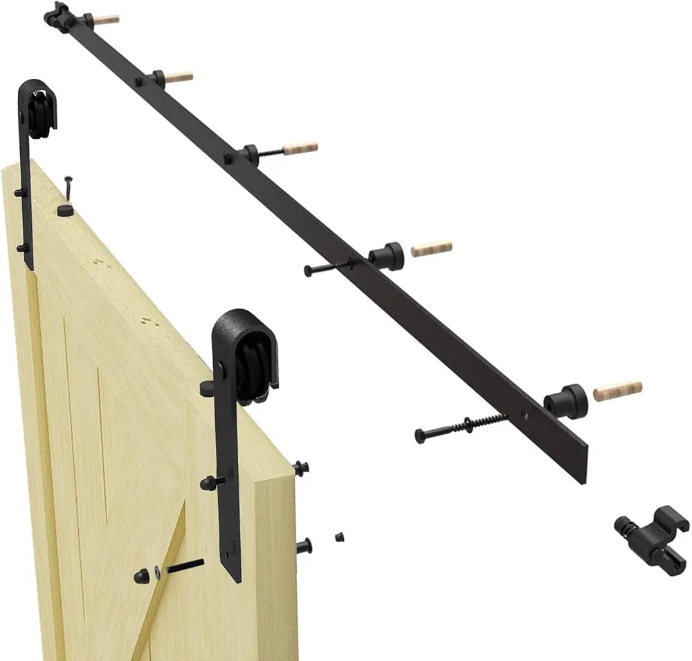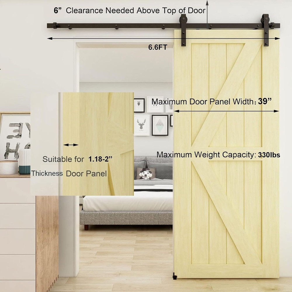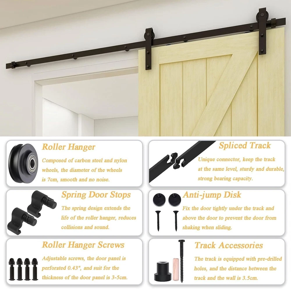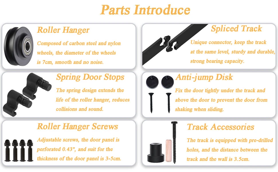 SPECIFICATIONS: Roller Material:Carbon Steel Track Material: Aluminum Maximum load-bearing capacity of a single door: 330lbs (150kg) Suit able for door thickness: From 1 3/16" to 2"(3cm-5cm ) Suitable for door width: 36''-40'' Warranty period: 10 ye ars warranty FEATURES: 【Durable & Safe 】 High quality barn door hardware kit, Pre mium nylon roller wheel, Gcr15 roller bearing, High strength industrial grade track, Can easily hold 330bls loads 【Advantage】 ① Spring Door Stops, reduce noise and extend life ② Pre- drilled rails, steel bearings ③ N ew design connection s yste m , Connect Rail stable 【Wide Applicability】 The rustic wooden sliding door fitting are very easily to decorate and suitable for bedroom, study room, dressing room, kitchen, closet, cabinet, farmland etc 【100% Q uality Warranty 】 We offer 1 0 ye ars warranty.Any questions, please contact us First, we will re ply you within 24 hou rs. 【 Easy to install 】 --- Pre-drilled rails ,step by step installation manual,professional after-sales customer service help you install easily. ACCRSSORIES DETAILS: 1.Carbon Steel Roller Super load-bearing capacity,inner nylon wheels, will not wear the track when rolling. 2.Unique Spring Door Stops T he spring design door stopper c an no t only reduce sound during sliding your door, also extend the life of the k it. 3.Anti-jump Disk M ounted on the top of the door, prevent the door from popping out of the track during movement. 4.Adjustable Screw : The roller screws can be adjusted freely in any size within the door thickness from 1 3/16" to 2"(3cm-5cm ).
