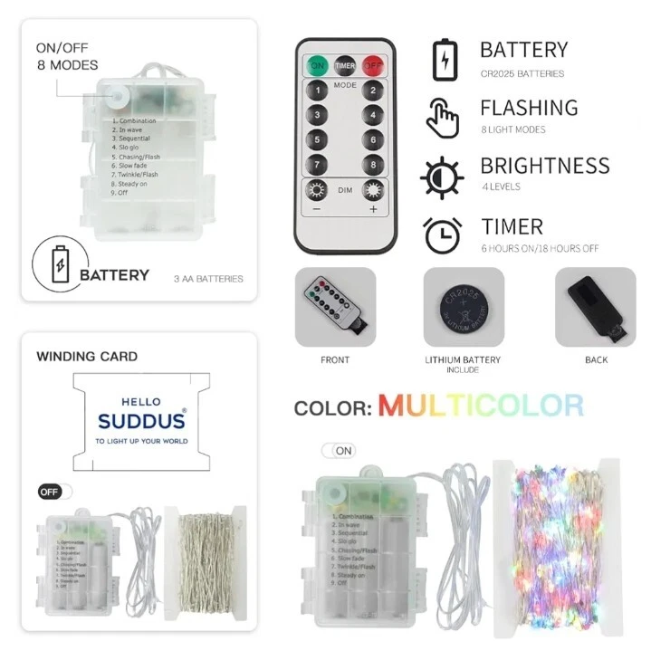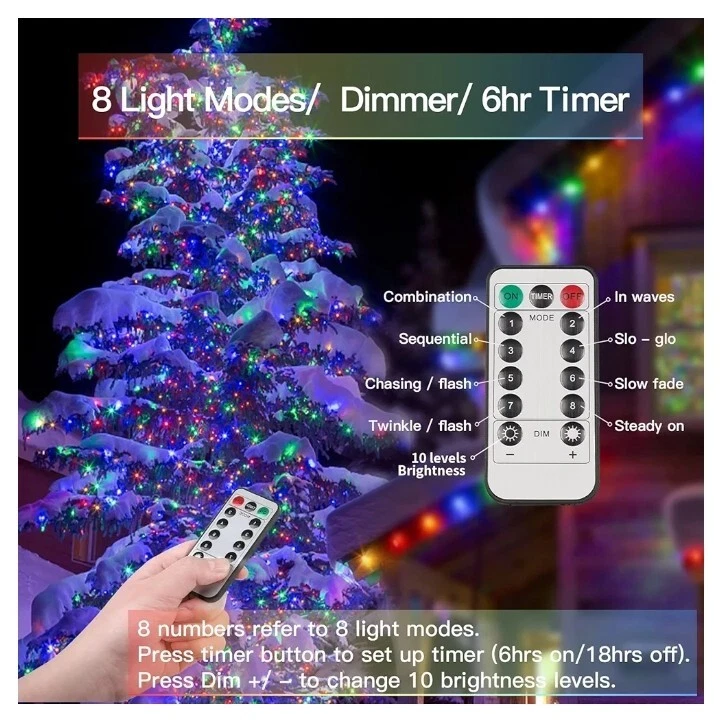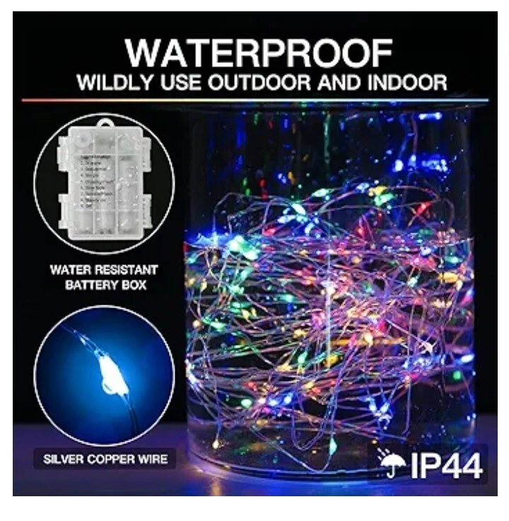 Portable & Waterproof Fairy Lights: These twinkle lights battery operated are portable—no more worries when there is no socket or power outage. This outdoor waterproof fairy light can make the most sparkling light show during Christmas; These decorative Christmas lights can keep flashing and shining during wet weather. The IP44 waterproofed battery box can against wet under splashing water at any angle Flexible & Safe Wire Lights: This durable LED fairy light line is made of pure copper material. It can easily conform to any shape. We can bend the copper wire over a thousand times, and it will not break. Try to wrap string lights to anything you like. 66ft fairy lights are enough for any indoor and outdoor décor. Moreover, twinkle lights with remotes are low heat emission, and safe to touch Timer & 8 Lighting Modes: The timer function for 6 hours on / 18 hours off, which will cycle. automatically for 24 hours; This string of lights has two control methods, you can use the battery box button control to change this lighting mode or use the remote control to change the fairy lights' brightness; This string of lights has eight different lighting modes, including combination, wave, continuous, slow fading, chasing flash, gradually disappearing, flashing, and always on. Ultra-Brightness: Pixie lights glow bright multicolor colors. Compared to traditional fairy lights, Ours' multicolor lights have durable copper wires and brighter LED bulbs. These fairy lights with remotes allow you to have ten adjustable brightness levels, giving you a different lighting experience. Use it when you have different needs. The dimmable light setting gives you a romantic feeling. The super bright light setting will add the most twinkling to the Christmas tree. Wide Application: Whether you are hosting a party, creating an intimate outdoor space, or decorating a holiday, this lamp post with a remote control is the perfect complement to your home decoration. With a length of 66FT and energy-saving LED bulbs, it will add warmth and charm to any environment.