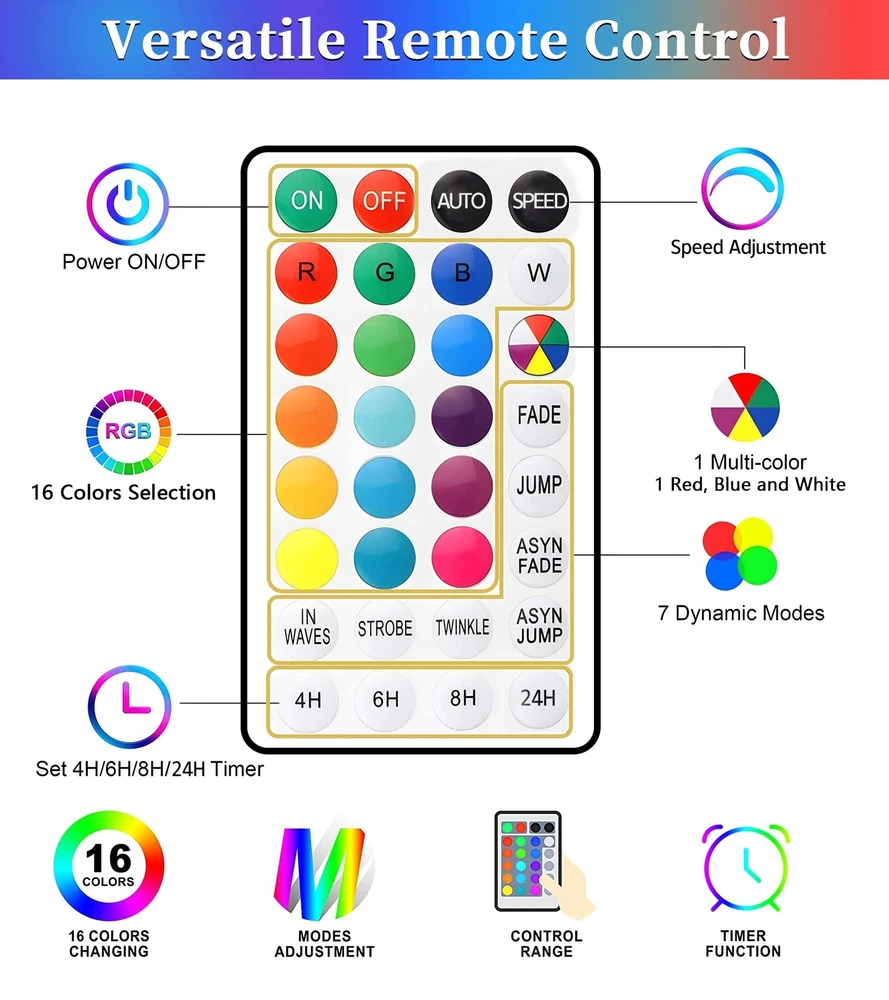 16 COLORS CHANGING STRING LIGHTS: With 16 vibrant colors to choose from, our outdoor led lights are perfect for adding a touch of color and creativity to any occasion. Whether you want to set a romantic mood with soft pinks and reds on Valentine's Day, celebrate St. Patrick's Day with festive green, or create a fantastical ambiance with orange and purple for Halloween, these lights meet your requirements. MEMORY & TIMER FUNCTIONS: Our rope lights are equipped with a multifunctional remote that allows for your customization. With the timer function, you can set the lights to automatically turn off after 4, 6, 8, or 24 hours. The remote also allows you to adjust the speed of the 7 lighting modes with the “speed” button. Additionally, the memory function ensures that the lights will remember your last setting even after being turned off by the remote, eliminating the need to reset them every time. VERSATILE LIGHTING MODES:With 7 lighting modes to choose from, you can easily set the perfect ambiance for any occasion. The available modes include Fade, Jump, ASYN Fade, ASYN Jump, In Waves, Strobe, and Twinkle. With upgraded color options available, you can brighten up your Christmas decorations with multicolored modes. If you're decorating for July 4th, simply press the multicolor button twice to switch to the red, white, and blue lighting modes. IP67 WATERPROOF: Our led rope lights are designed to withstand various weather conditions, including rain, wind, snow, and fog, making them an ideal choice for outdoor & indoor decorations. Whether you're hosting a party, celebrating Christmas, Halloween, Thanksgiving, or any other special occasion, our rope lights are a perfect addition to your decor. WIDELY INDOOR & OUTDOOR USED: The IP65 waterproof rating of these led rope lights outdoor waterproof makes them suitable for a wide range of indoor and outdoor uses. You can wrap them around a tree, backyard fence, or porch for a festive touch, or use them to decorate your living room or bedroom. They're also great for outlining your deck, window, door, pathway, or walkway. EASY TO INSTALL: The sturdy yet thin covering makes it easy to wrap the lights around any surface or object. Additionally, our colored rope lights are lightweight, making them easy to maneuver and install. The lightweight design allows for simple installation using either clear packing tape or clips.