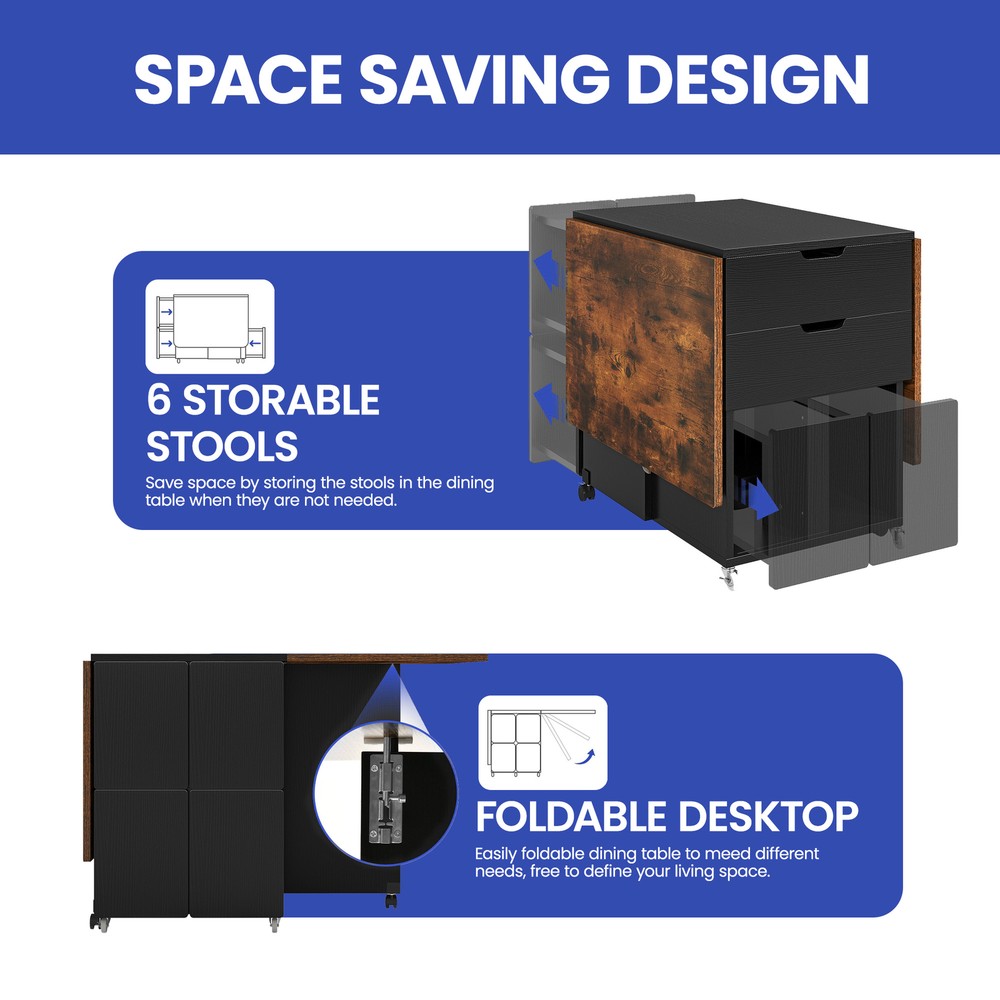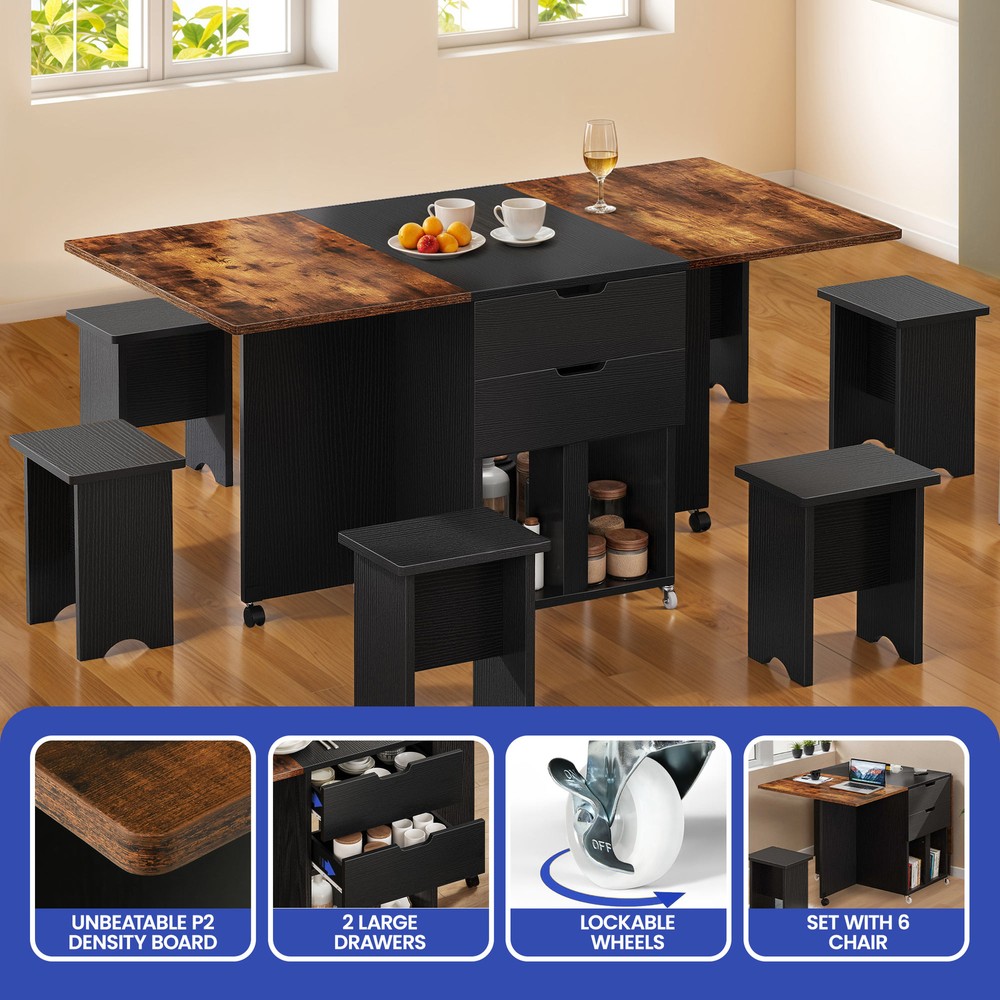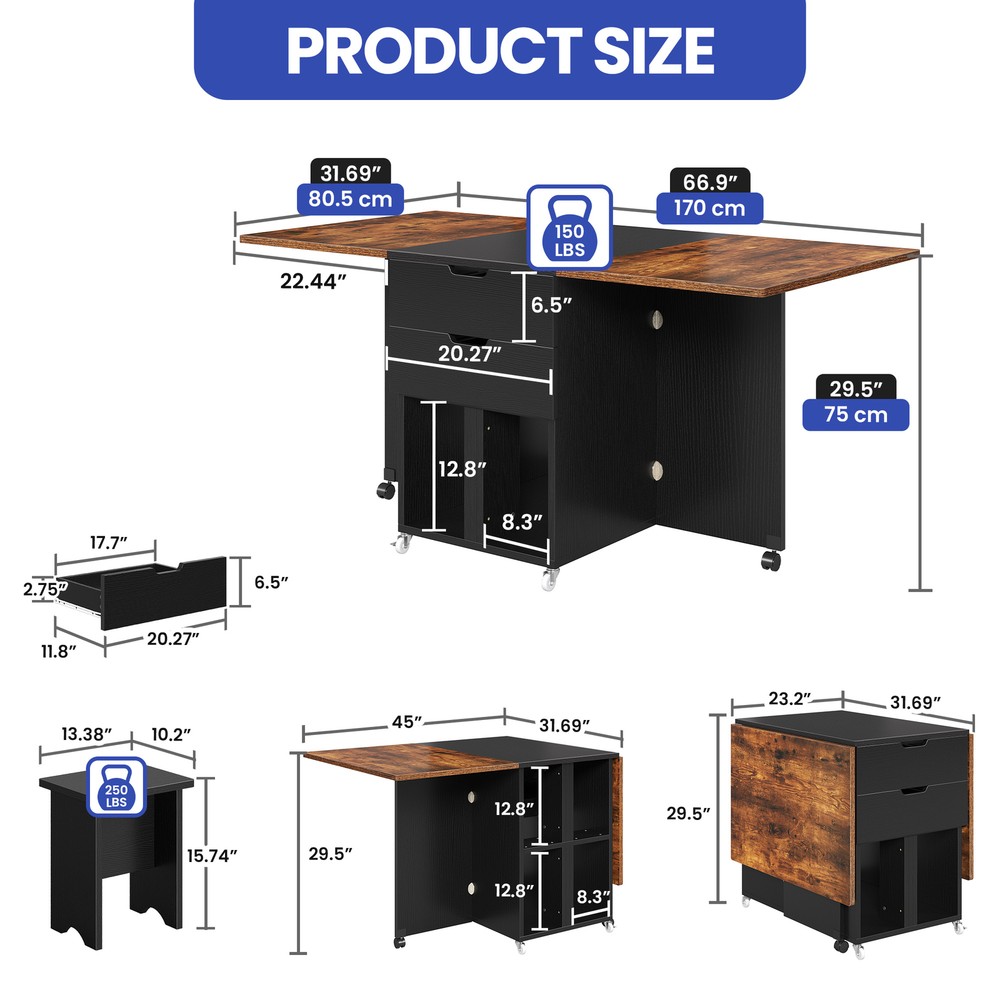 67" Folding Dining Table 6 People Seat Wood Chairs Dinette Set 2 Drawers Brown Product Description NOTE: Professional Installation would be Highly Recommended. Description: 1. Color : Brown 2. Features : Foldable, Lockable Wheels, Space-Saving, With Drawers 3. Material : Iron, MDF Board, and Wood 4. Mounting : Free Standing 5. Room : Dining Room, Home Office, Kitchen, Living Room, and Restaurant 6. Seating Capacity : 6 People Features: Spacious and Sturdy Design Enjoy ample room with a 66.9"L x 31.69"W x 29.5"H dining table , perfect for accommodating up to six people. The six matching chairs (13.3"L x 10.8"W x 15.7"H each) offer a comfortable seating experience, while the table supports up to 150 lb and the chairs up to 250 lb . Our set is ideal for both dining and workspace needs, making it a great addition to any household or business . Premium Quality Materials Crafted from high-quality MDF board, iron, and wood , our set combines durability with a stylish aesthetic. Our sturdy iron frame provides exceptional support , while the MDF board resists warping and moisture damage . Designed to withstand daily use, our set maintains our elegant look for years to come . Smart and Space-Saving Features Our table set is designed with functionality in mind , featuring a foldable desktop for easy storage when not in use. Our two large built-in drawers provide extra storage for utensils, napkins, or office supplies , reducing clutter and maximizing efficiency. Our freestanding design makes it a flexible solution for any room . Easy Mobility and Modern Appeal Equipped with lockable wheels , our table can be effortlessly moved and secured in place whenever needed. Our scratchproof and waterproof surface ensures easy maintenance , making it ideal for busy households or commercial spaces. The rich brown finish adds warmth and sophistication , blending seamlessly with various interior styles . Dimensions: 1. Chair Dimensions: 13.3"L x 10.8"W x 15.7"H 2. Table Dimensions: 66.9"L x 31.69"W x 29.5"H 3. Chair Weight Capacity: 250 lbs 4. Table Weight Capacity: 150 lbs 5. Weight: 136 lbs Package Included: 1. 1x Foldable Dining Table 2. 6x Foldable Chairs 3. Assembling Hardware Kits 4. Instruction Manual Book Shipping 1. Normally the item will be dispatched within 1 business day if payment is cleared before 12pm PST. 2. Please verify the correct shipping address in your PayPal account before making the payment. We only dispatch the item to the address that is sent to us at the time of checkout. 3. We don't ship to Hawaii, Alaska, Puerto Rico, APO/FPO/PO Boxes. 4. We don't provide local pick-up service. 5. Normally we will use USPS, UPS, FedEx & LTL to dispatch items. Payment 1. We accept PayPal and credit card. 2. We will ship to the confirmed Paypal shipping address that is provided with the payment only. Return 1. 30 days Money Back Guarantee. 2. Please contact our customer service to receive a RMA form first if want to return the item. 3. All returned items MUST in new condition with the original package. Contact If has any problem, please contact us by sending an ebay message. Our customer service will resolve the problem as soon as possible.