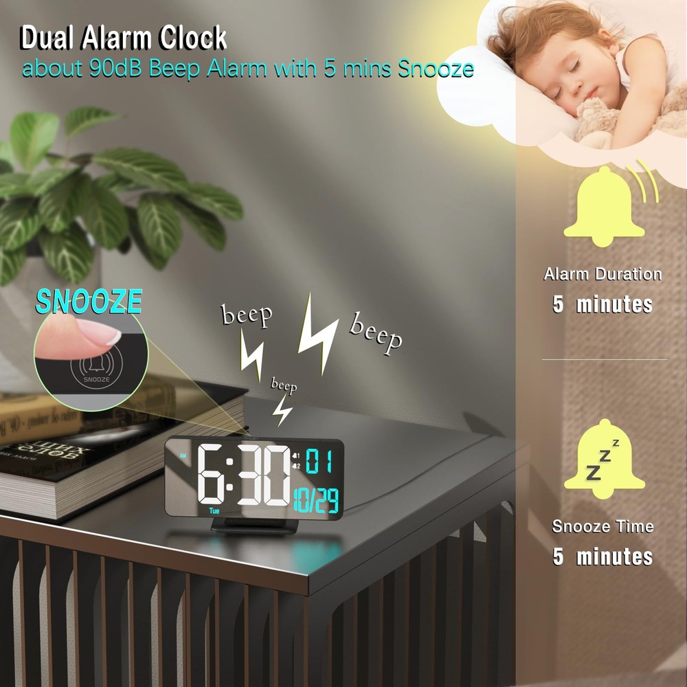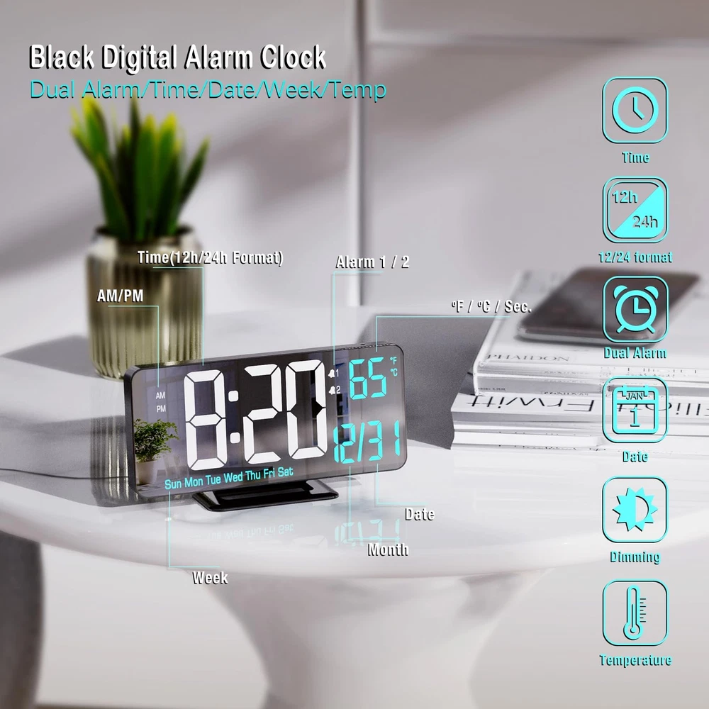 Digital Alarm Clock 6.7in Black Clock for Bedroom, Dual Alarm, Date, Seconds, Day of Week, 12/24h, Dimming, Temp, Desk Clock, LED Clock for Living Room, Calendar Digital Clock [6.7in Black Digital Clock] The black alarm clock features 6.7-inch LED light display with a sleek mirror clock style, which has dual alarms,12/24-hour format, date, day of week, seconds, temperature (℉ / ℃), and auto/manual dimming, it is also a stylish and modern digital calendar for room accessories. Additionally, the bright big white and sky blue digits make the desk clock cool and easy-to-read. [Auto/Manual Dimming] This LED clock features an auto dimming (via light sensor) and manual dimming (low, medium, high, or LED display off) , which makes a cool and customizable element to the digital clock. [Dual Alarm Clock with Snooze] You can set two alarm times for the digital alarm clock, each with 3 different alarm cycles, for workdays, weekends and every day as options. The desk clock also includes snooze function(with 5 mins alarm duration and 5 mins snooze time). [Digital Clock with Time/Date/Week/Temp] This black bedside clock features multi-functional display that includes the time, seconds, date, day of week and indoor temperature, it not only serves as a digital alarm clock but also as a cool digital calendar. Additionally, you can set separate alarms for your workdays, weekends, and every day. [Plug-in USB-A Power Supply] This digital LED clock requires a 5V/1A AC adapter (not included) to operate. It also comes with a button battery, which is only used to preserve the time during power outages and is not meant to be used as a continuous power supply. [Customer Services] We offer a 2-year warranty on our product. If you encounter any quality or usage-related problems, please don’t hesitate to contact us via email. We will promptly assist you in solving the issue.
