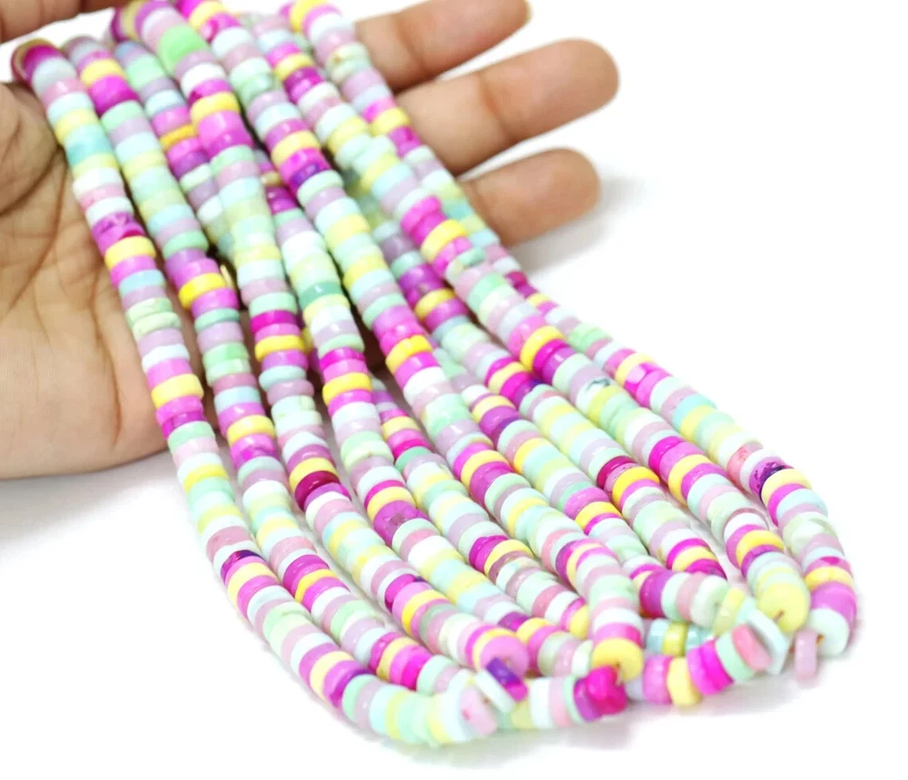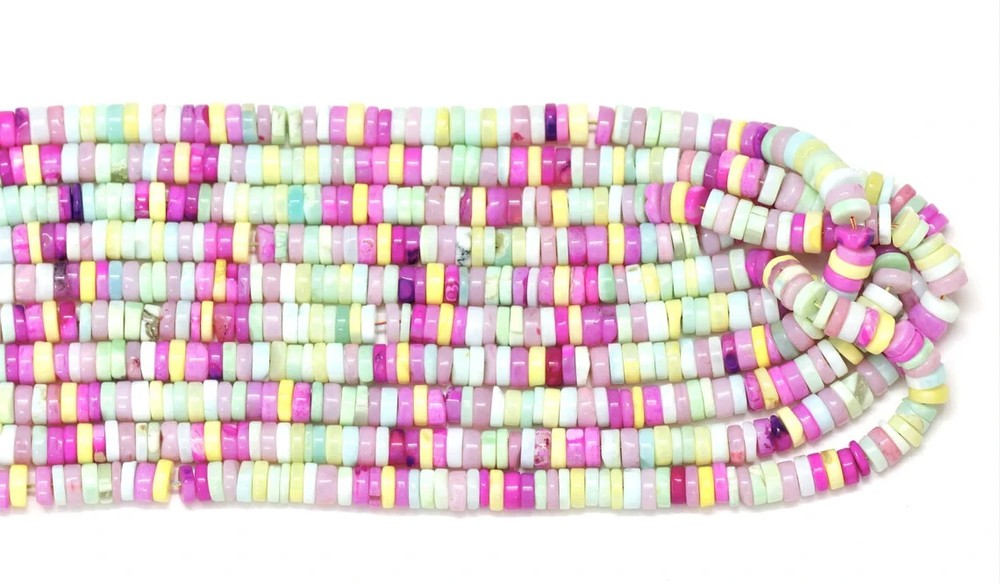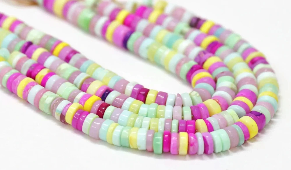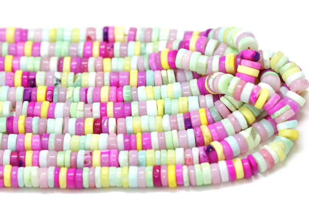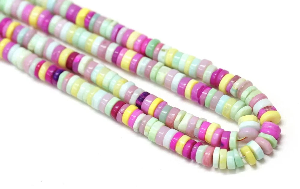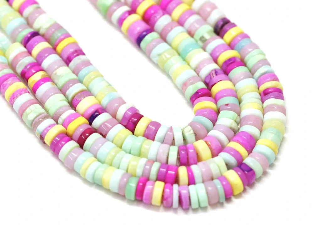 Made by Radhikagemsnbeads Supplies for making crafts Materials: Gemstone Bead hole size: .50 millimetres Beautiful Multi Disco Opal plain smooth Tyre Shape Heishi Beads, 7-9mm Mix Color Opal Plain Wheel shape gemstone Beads, jewelry making craft Gemstone : Opal Beads Color : Multi color Opal Size : 7 mm to 9 mm approx. Shape : tyre shape / Wheel shape Style : Smooth Handmade Beads Quality : AAA For : Necklace, Jewelry Design, Craft Making, Gift,Etc. Length : 8 inch / 16 inch