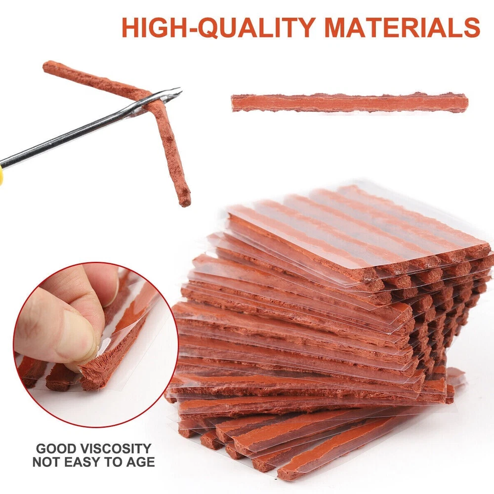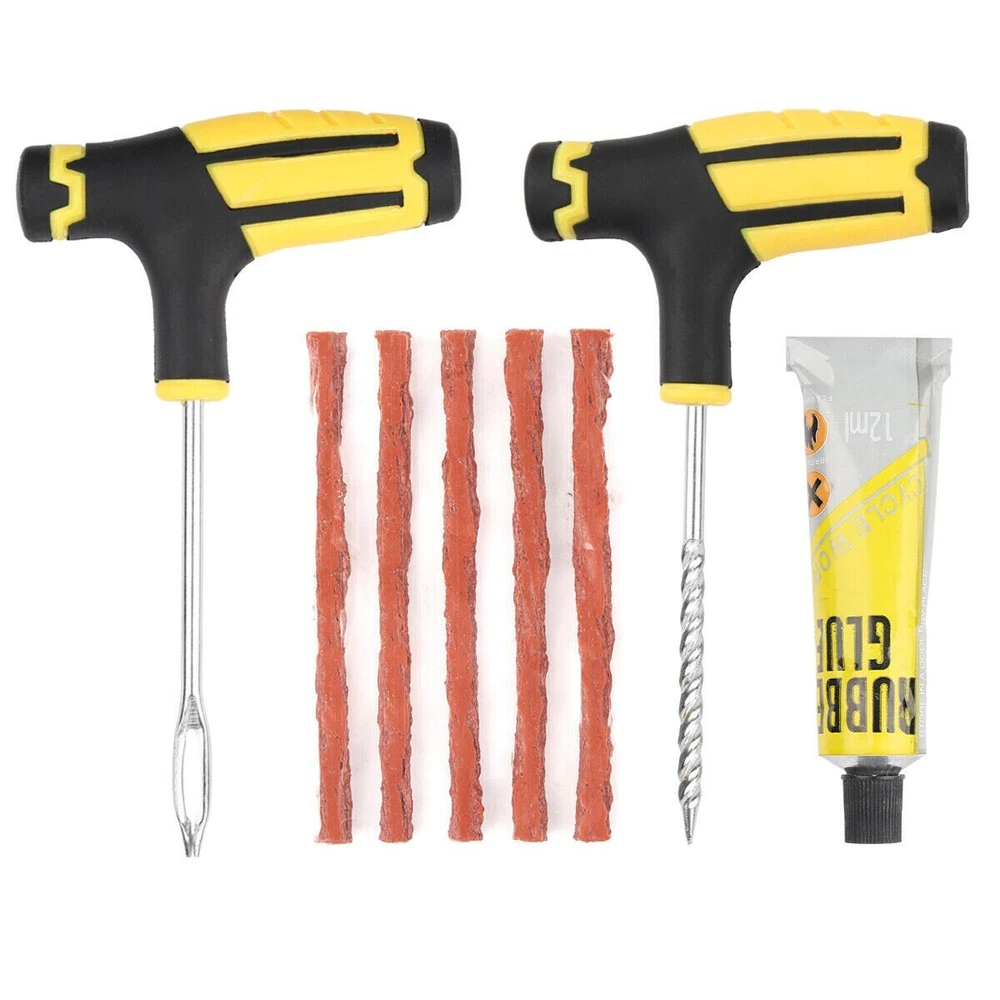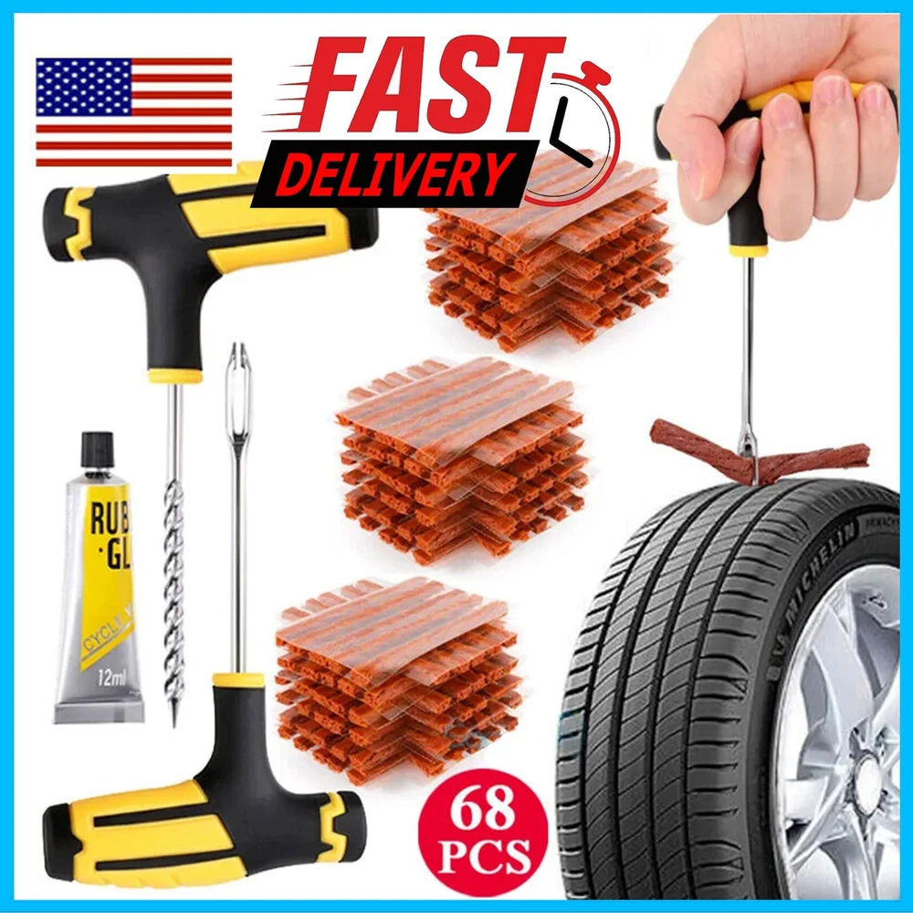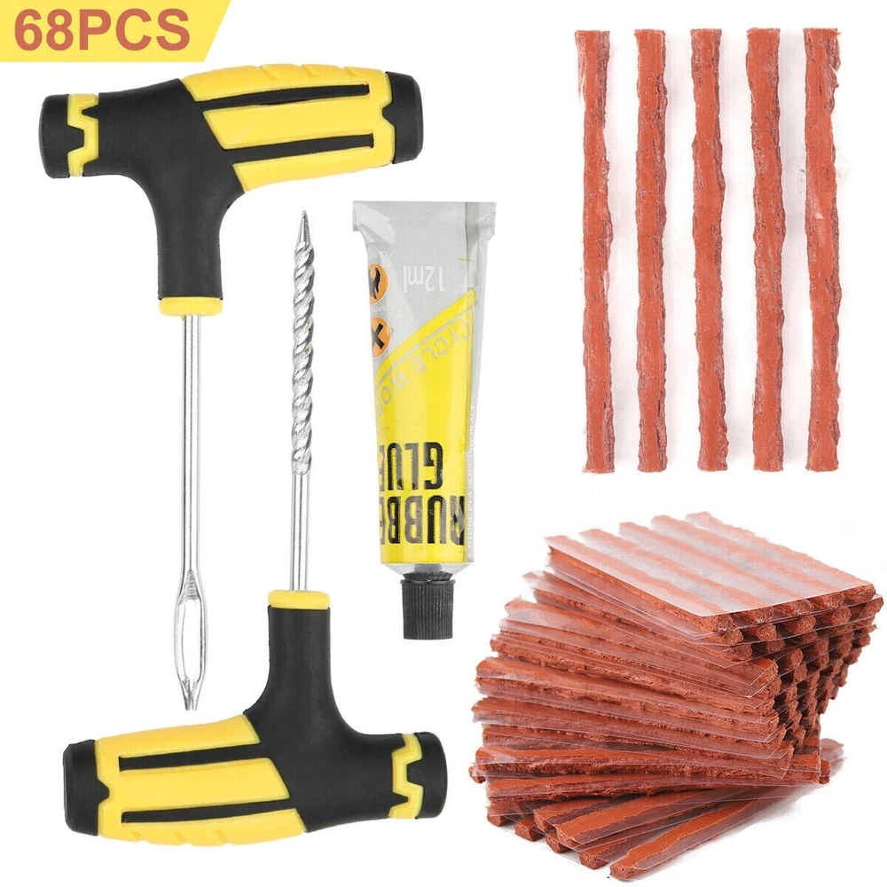 68pc Tire Repair Kit DIY Flat Tire Repair Car Truck Motorcycle Home Plug Patch Item Description 68PCS Tyre Repair Kits Material: ABS+Steel+ Vulcanized Rubber Color: Brown+Yellow+Black Size: As Picture Show Package Include: 1X Rasper Tool 1X Needle Reamer Tool 1X Rubber Solution 65X Tyre Bar Features: 1. With high-level upgrade glue bar - the heavy brown glue bar (65pcs) can provide excellent security sealing. It is stronger and better than the cheap string in the budget kit. Every aspect of our tire plug kit is designed very strongly. 2. It adopts a universal flat tire repair kit - cars, motorcycles, ATV, tractors, grass cutters, RVs, off-road bicycles, trailers, SUVs, trucks and spare tire repair kits. With 65 Superior Brown tire plugs, make it the best sub -tire repair kit. 3. The product adopts high- quality professional tools- our tire burst maintenance kit includes a pair of strong high-quality tools. This is a major upgrade of the cheap tools in other tire plug repair packs. 4. With T-shaped handle tools that conform to ergonomic design-tools suitable for this job can easily repair the perforation of internal tireless tires in a few minutes. Our portable tire repair kit includes a color description that is easy to understand and easy to follow.