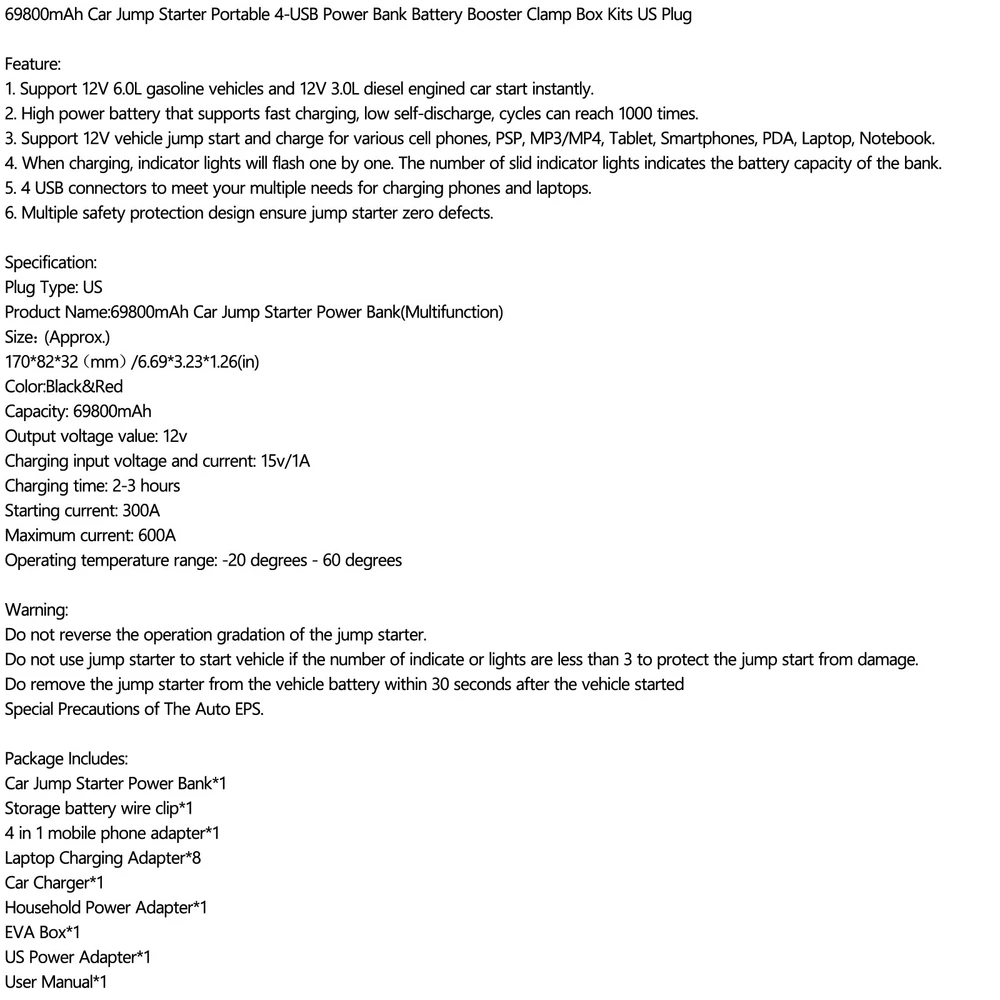 Sunbuck 2000W Stereo HiFi Power Amplifier Bluetooth 5.0 Karaoke FM USB EQ AUX 89.43 USD 98.27 USD Free shipping 9% off 10W 36LED RGBW Moving Head Light DMX512 Zoom Sound Active Stage Bar DJ 180.1 USD 197.91 USD Free shipping 9% off 62cc Gas Chainsaw 20" Bar Gasoline Powered Chain Saw 2 Cycle Engine Cutting L3 99.39 USD 109.22 USD Free shipping 9% off 24" 68CC Gasoline Chainsaw Cutting Wood Gas Sawing Aluminum Crankcase Chain Saw 199.04 USD 218.72 USD Free shipping 9% off WLtoys XK A280 RC P51 Fighter 4CH Airplane 3D/6G FixedWing BrushlessMotor Toy L3 119.32 USD 131.12 USD Free shipping 9% off LED Female Privates Vaginal Speculum Illuminated Vaginal Expander With Light L3 16.68 USD 18.33 USD Free shipping 9% off 65W Car AC Adapter Power Charger For HP Laptop Notebook 4.5x3.0mm 19.5V 3.33A L3 19.67 USD 21.62 USD Free shipping 9% off Garbage Disposal3/4 HP 2800 RPM Under Sink Kitchen Food Waste Disposer w/ Plug L 115.33 USD 126.74 USD Free shipping 9% off 2 IN 1 Chainsaw Teeth Quick Sharpener File For STIHL .325" 4.8mm Chain 19.67 USD 21.62 USD Free shipping 9% off 1x Mini Size Nagoya NSP-100 External Speaker For Yaesu Kenwood Icom CB Radio EP 15.69 USD 17.24 USD Free shipping 9% off Flight Case For 1Pcs 230W Beam 7R Sharpy Moving Head Stage Light Hard Case New 150.2 USD 165.06 USD Free shipping 9% off 145Pcs Furniture Pads Chair Leg Floor Protectors Felt Pads Hardwood Floors L3 11.7 USD 12.86 USD Free shipping 9% off 700g High Speed Electric Herb Grain Grinder Cereal Mill Flour Powder Machine L3 69.5 USD 76.37 USD Free shipping 9% off Wltoys 12427 1/12 Scale 2.4G 4WD Electric Brushed Crawler RTR RC Car Gift L3 109.35 USD 120.17 USD Free shipping 9% off Brake Pedal Upgrade Spring Fit For Logitech G25 G27 G29 G920 Steering Wheel L3 12.69 USD 13.95 USD Free shipping 9% off 24" Double Sided Blade 26cc Gas Hedge Trimmer Recoil Gasoline Trim Blade 149.21 USD 163.97 USD Free shipping 9% off Product Description 69800mAh Car Jump Starter Portable 4-USB Power Bank Battery Booster Clamp Box Kits US Plug Feature: 1. Support 12V 6.0L gasoline vehicles and 12V 3.0L diesel engined car start instantly. 2. High power battery that supports fast charging, low self-discharge, cycles can reach 1000 times. 3. Support 12V vehicle jump start and charge for various cell phones, PSP, MP3/MP4, Tablet, Smartphones, PDA, Laptop, Notebook. 4. When charging, indicator lights will flash one by one. The number of slid indicator lights indicates the battery capacity of the bank. 5. 4 USB connectors to meet your multiple needs for charging phones and laptops. 6. Multiple safety protection design ensure jump starter zero defects. Specification: Plug Type: US Product Name:69800mAh Car Jump Starter Power Bank(Multifunction) Size:(Approx.) 170*82*32(mm)/6.69*3.23*1.26(in) Color:Black&Red Capacity: 69800mAh Output voltage value: 12v Charging input voltage and current: 15v/1A Charging time: 2-3 hours Starting current: 300A Maximum current: 600A Operating temperature range: -20 degrees - 60 degrees Warning: Do not reverse the operation gradation of the jump starter. Do not use jump starter to start vehicle if the number of indicate or lights are less than 3 to protect the jump start from damage. Do remove the jump starter from the vehicle battery within 30 seconds after the vehicle started Special Precautions of The Auto EPS. Package Includes: Car Jump Starter Power Bank*1 Storage battery wire clip*1 4 in 1 mobile phone adapter*1 Laptop Charging Adapter*8 Car Charger*1 Household Power Adapter*1 EVA Box*1 US Power Adapter*1 User Manual*1 Shipping Returns Warranty Feedback About US ✔ Delivery Time: 3-5 business days (continental U.S.). ✔ Order Processing: Ships within 3 business day (Mon-Fri, excludes holidays). ✔ Tracking Info: Provided automatically via eBay. ✔ All orders will be shipped through USPS First Class, UPS and Fedex depends on the weight of the items. ✔ Shipping notification will be emailed to you once package has been shipped Fast & Reliable Shipping – Your order is our priority! We package all items with care to ensure safe arrival! Tracking number emailed as soon as your order ships! 🌍 Ships from U.S. Warehouse – No long waits! ULTRA-FAST SHIPPING – Because you shouldn't wait! We guarantee on-time delivery or your shipping fee back! 60-Day Hassle-Free Return Policy We offer 60-day free returns for your peace of mind. To ensure a smooth process, please contact us first before opening a return request—we'll gladly help resolve any issues! ⭐ Return Requirements: ✅ Unused & in original packaging ✅ Contact us immediately if the item is defective/damaged (photos/video required) ✅ Repack securely to prevent shipping damage ⚠️ Important Notes: • If returning due to change of mind, please select: "Changed mind" or "Didn't like item" Defective/damaged items? Contact us immediately with photos/video proof • Incorrect return reasons (e.g., falsely claiming "defective") may result in a refused refun d. ⭐ Return Process: • Contact us → We'll provide return instructions. • Ship the item back with tracking (recommended). • We inspect returns within 3-5 business days. Approved refunds are issued to your original payment method (processing time varies by bank). ⭐ Need Help? Message Us First! We're happy to offer alternative solutions, including replacements or discounts, before you proceed with a return. Your satisfaction is our top priority! No-Questions-Asked Warranty ⭐ HASSLE-FREE WARRANTY • 90-365 Day Coverage (varies by product - see listing details) • No Return Required for claims under $50 - we ship replacements immediately ✖ Exclusions: • Physical damage (drops/accidents) • Installation errors (YouTube tutorial links provided) • Modified/tuned vehicles Professional Installer Warranty ⭐ CERTIFIED INSTALLATION WARRANTY ✔ installed by licensed mechanics ✔ Free Technical Consultation before installation ⭐ Feedback & Satisfaction Policy Your 5-Star Reviews Help 