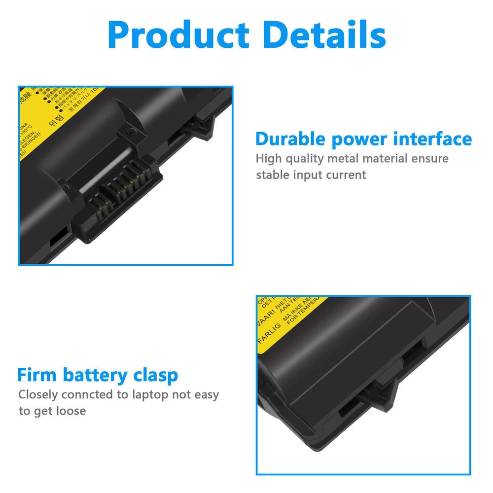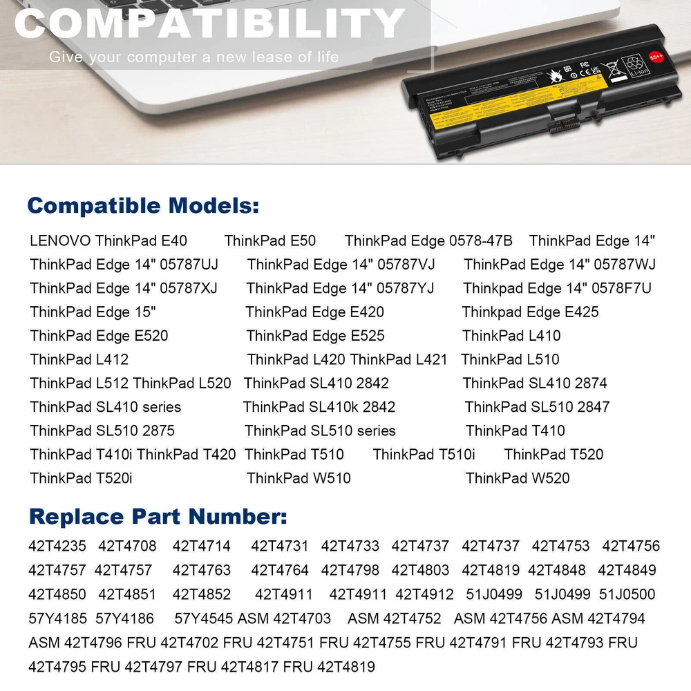 ✅6/9Cells Battery for Lenovo ThinkPad T410 T420 T510 T520 W510 SL410 SL510 E40 About us: ➡️We are a laptop battery manufacturer with more than many years , we are positioned for high quality, simplicity and durability. Our products are stable, safe and reliable in performance,and all batteries are made of Grade ''A'' cells . ➡️ If you have any question, pls feel free to contact us first instead of opening any form of case. Contacting our customer service is the best way to better cooperate with each other,thanks a lot. ➡️ Before purchasing, pls confirm that your model/capacity/size is compatible with your laptop . If you don’t know your model, you can provide us a picture of the appearance of the old battery for us to confirm. ➡️ Your positive feedback are the driving force for us to move forward. Specification: Battery type: Li-ion Voltage: 11.1V(Compatible with 10.8V) Capacity: 5200mAh / 7800mAh Cell: 6 / 9 Cells recharge cycles: 500 Operation time: Around 2.5-3.5 hours Compatible Models: ( Ctrl + F for fast search ur laptop model) For LENOVO ThinkPad E40 E50 ThinkPad Edge 0578-47B ThinkPad Edge 14" 05787UJ 05787VJ 05787WJ 05787XJ 05787YJ 0578F7U ThinkPad Edge 15" E420 E425 E520 E525 ThinkPad L410 L412 L420 L421 L510 L512 L520 ThinkPad SL410 SL510 series ThinkPad SL410 2842 ThinkPad SL410 2874 T hinkPad SL410k 2842 ThinkPad SL510 2847 ThinkPad SL510 2875 ThinkPad T410 T420 T510 T520 ThinkPad W510 W520 Compatible Part Numbers: 42T4235 42T4708 42T4714 42T4731 42T4733 42T4737 42T4737 42T4753 42T4756 42T4757 42T4757 42T4763 42T4764 42T4798 42T4803 42T4819 42T4848 42T4849 42T4850 42T4851 42T4852 42T4911 42T4911 42T4912 51J0499 51J0499 51J0500 57Y4185 57Y4186 57Y4545 ASM 42T4703 ASM 42T4752 ASM 42T4756 ASM 42T4794 ASM 42T4796 FRU 42T4702 FRU 42T4751 FRU 42T4755 FRU 42T4791 FRU 42T4793 FRU 42T4795 FRU 42T4797 FRU 42T4817 FRU 42T4819 Payment Delivery details Warranty & Return About us Contact us Payment 1. We accept payment via Paypay only. 2. All payments must be prepaid. Delivery details 1. Items are generally shipped out within 24-48 hours after your payment has been cleared (Sat. & Sun. excluded.) 2. Orders from the United States will all be shipped out via USPS and FedEx. The shipment usually takes 3-7 business days( Exclude public holiday), if you need the item urgently, please contact us for detail before purchase. 3. We ship to US ONLY and do not support Collection. 4. All items will be shipped to buyer's paypal address. Please check your paypal address before place the order. 5. We are not responsible for wrong or undeliverable address. We reserve the right to charge the shipping fee again for returned items due to wrong address. Warranty & Return 1. We provide 30 days money back on non-defective, undamaged, unused and resalable products. Product is not eligible for refund after the 30-day refund period has expired. 2. Our warranty does not extended to any products that are physically damaged or that are not under normal operating conditions as a result of misuse or improper installation on the buyer/user's part. 3. For all returned products, Please contact us for the returning address and Pls no return case. 4. In all cases, buyers pay shipping fees at their own cost to return products for exchange or refund. We will be responsible for the postage of replacements. Refund will be made upon receipt of the returned item. About us We are a store, mainly run laptop accessory. Such as battery , ac adapter etc. All item passed FCC / CE / ROHS certificates. Help buyer reduce the risk of damage, fire, dangerours mostly. We work with a good quality OEM supplier and factory. Help you and us save money greatly. Contact us Currently, our after-sale workmate good at English. it is better send eBay message in English. You will get our most effetive feedback in time. If you have any question, just send a eBay message is a best solve way between us. If you satifaction our service, leave 5 stars and postifive feedback at our store. It will help our small store development greatly. We will very appreciated for your doing.