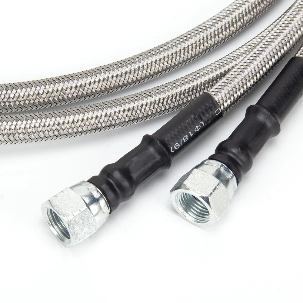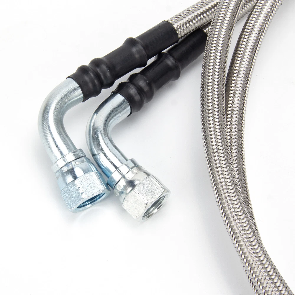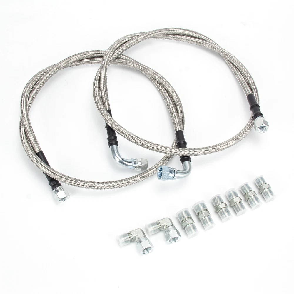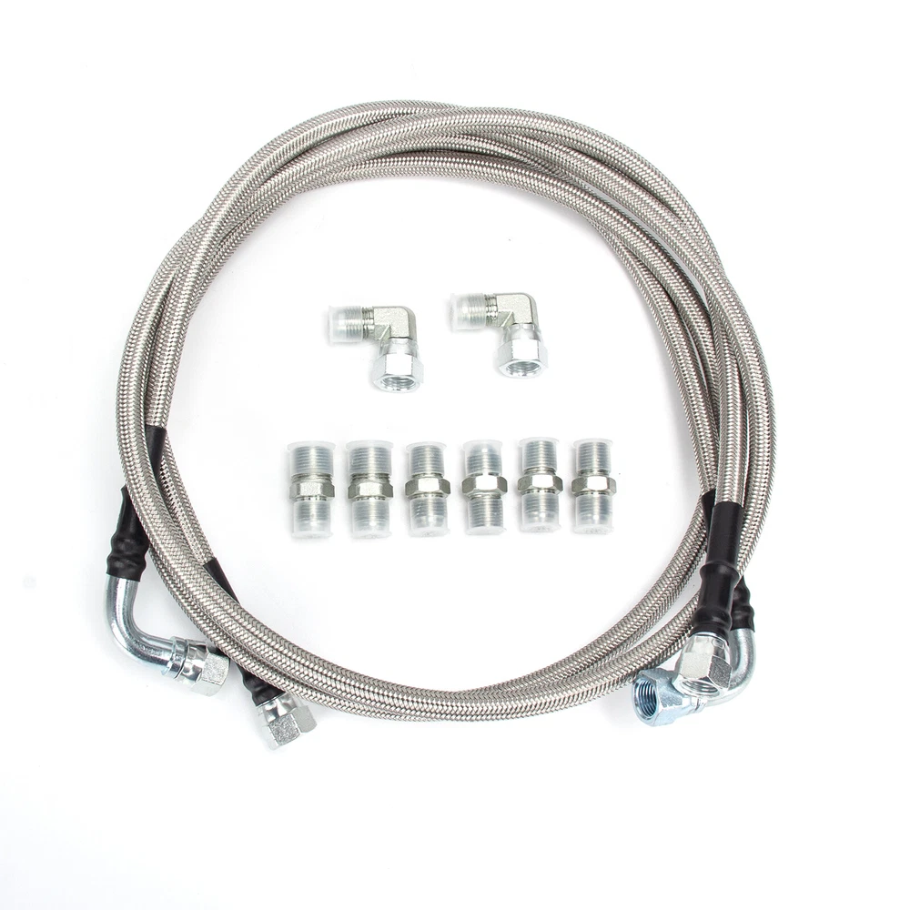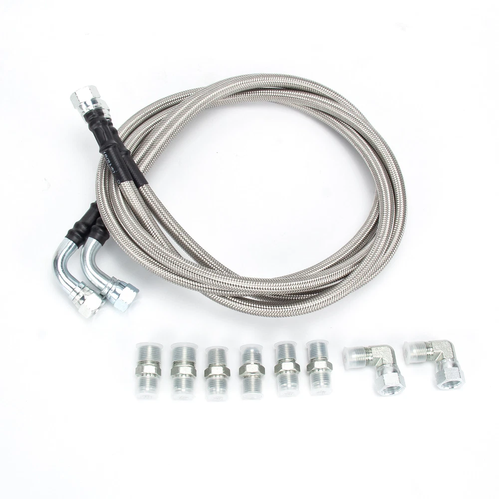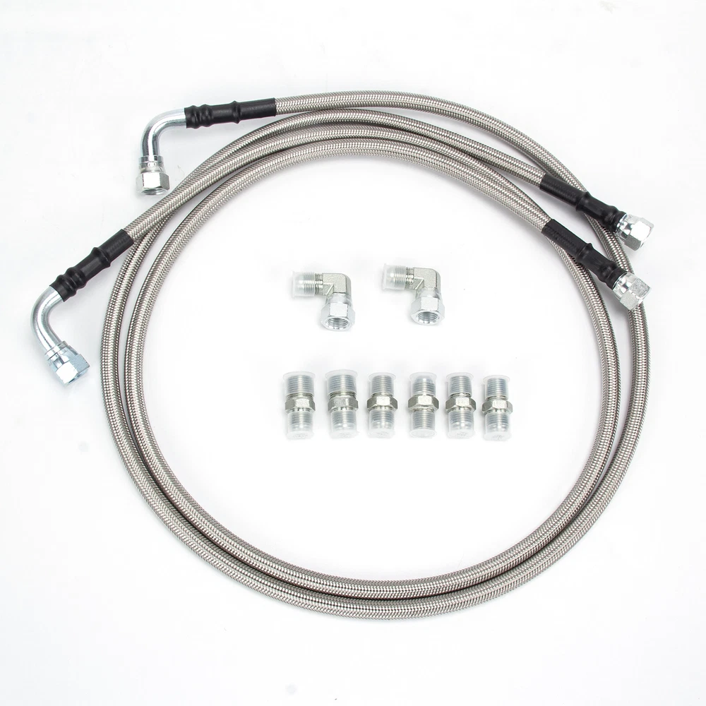 Items description 6AN Fiber SS Braided For GM 4L60E 4L65E Automatic Transmission Cooler Lines Kit SS Braided Transmission Cooler Hose lines Fittings TH350 700R4 TH400 52" Length Item Description: · The 52" long & 3/8" inner diameter Stainless Steel Hoses fit single and dual pass coolers. · The universal kit is perfect for your Rat Rod, Hot Rod, Street Rod, Muscle Car, Custom and more! · Works with many Chevy, Ford, Mopar, GM, GMC, Buick, Cadillac cars and trucks! · PLEASE check the sizes of hoses and fittings to ensure they will satisfy your needs before placing order; · Each line about 50", and 2 lines in the kit! Work With: · Turbo 350 (Some are 1/4" NPT) · Turbo 400 · Turbo 200 - 200R4 · Power Glide (Some are 1/4" NPT) · 700R4 - 4L60 - 4L60E - 4L65E · 4L80E: 1995 & older · Ford C4 - C6 - AOD Tips: · Some transmission above-listed & coolers may have different size fittings than our kit includes; · Please check hose & fitting sizes prior to ordering since some fittings are 1/4" and others 3/8". Kit Includes: · (2) 52" & 3/8" ID Stainless Steel Braided Hoses (one line about 50", and 2 lines in the kit); · (2) -6AN to 3/8" NPT Fittings; · (4) -6AN to 1/4" NPT Fittings; · (2) 90 Degree Female to Male Swivel Elbow -6AN to -6AN Fittings. Please check pictures for more details.