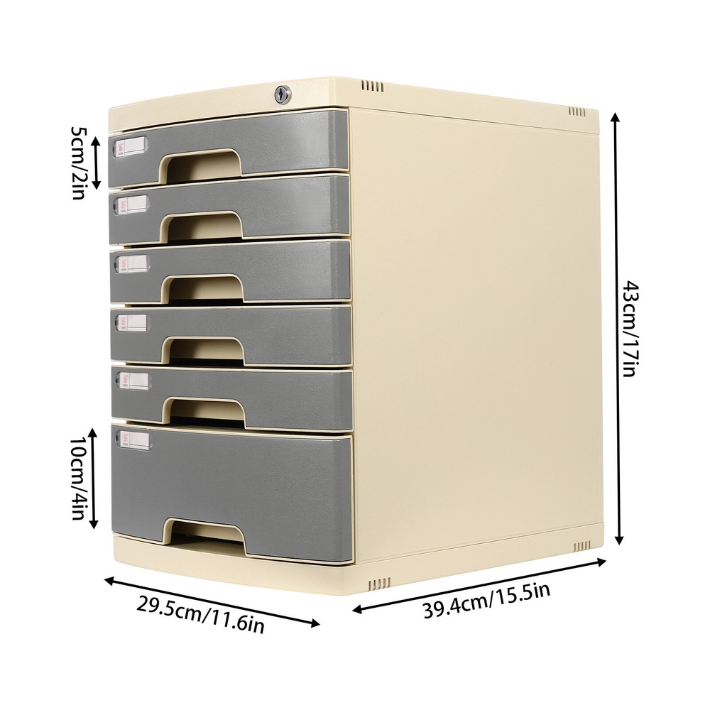 Application This product is ideal for the study, office, living room, bedroom, dormitory, school, and other places. It can be used to store documents, pamphlets, folders staplers, and other items such as cell phones. Specifications Color: Grey Style: Modern Shape: Rectangular Material: Plastic Assembly Required: No Mount Type: Tabletop Thickness: 2mm/0.08in Number of Drawers: 6 Each Drawer Load-bearing Capacity: About 1.5-1.8kg/3.31-3.97lbs Tier Spacing: 10cm/3.94in; 5cm/1.97in Product Size: 29.5*39.4*43cm/11.6*15.5*17in Package Size: 45*31*40cm/17.72*12.2*15.75in Gross Weight: 4.3kg/9.48lbs Net Weight: 4kg/8.82lbs Package Included 1* Drawer Organizer 2* Keys Desktop Storage Box 6 Drawers Organizer Lockable Desk File Organizer Home Office Description This drawer organizer adopts 6 drawer design. It is designed to make full use of space and achieves fine classification storage so that it will make your life and work more orderly. A modern appearance can show a sophisticated sense of style. You can put labels in label holders to help you quickly find what you need, so it will become your ideal storage assistant. Key Features High-quality Material: Premium plastic makes this product wear-resistant and not easy to deform, ensuring high durability. Storage Assistant : The 6 drawers can store files, pamphlets, folders, staplers, and other small items(not included) to keep your desktop tidy. In addition, the spacious top can also hold small potted plants, cups, decorations, etc. (not included), making your room more organized. Privacy Protection: The product comes with two keys that allow you to lock your drawer organizer so you can have your own private storage space. Stable Structure : Thickened materials and rectangular structure provide it with stable construction, making it not easily shaken and stand stably on the tabletop. Elegant Appearance: The simple gray color, rectangular structure and smooth lines give it a contemporary style that adds beauty and modern elements to your room. Thoughtful Design : The drawers help protect your documents or belongings from dust or moisture, thus maximizing the preservation of your items. Ready to Use : You can use this product directly after receiving it without tedious and complicated assembly, saving you time and labor. Simple Cleaning: Thanks to its smooth surface and simple structure, you can easily clean it with a rag (not included). Ideal Gift: With a delicate outlook and practical storage function, it is a wonderful housewarming or festival gift for your families, friends, or colleagues. Details Label Frames: They offer great convenience for categorizing items for storage and finding what you need quickly. Smooth Edges: They can effectively protect your hands from being scratched when using or cleaning this product. Recessed Handle: The recessed handle is more durable, can add aesthetic appeal, and allows you to push and pull the drawer more easily. Application This product is ideal for the study, office, living room, bedroom, dormitory, school, and other places. It can be used to store documents, pamphlets, folders staplers, and other items such as cell phones. Specifications Color: Grey Style: Modern Shape: Rectangular Material: Plastic Assembly Required: No Mount Type: Tabletop Thickness: 2mm/0.08in Number of Drawers: 6 Each Drawer Load-bearing Capacity: About 1.5-1.8kg/3.31-3.97lbs Tier Spacing: 10cm/3.94in; 5cm/1.97in Product Size: 29.5*39.4*43cm/11.6*15.5*17in Package Size: 45*31*40cm/17.72*12.2*15.75in Gross Weight: 4.3kg/9.48lbs Net Weight: 4kg/8.82lbs Package Included 1* Drawer Organizer 2* Keys Notes Please double-check the size before ordering. Please note that this product does not include other items shown in the picture. Please allow the slight color difference caused by the shooting light and 1-3cm error due to manual measurement, and make sure you do not mind before you order. On Jun 8, 2025 at 21:47:16 PDT, seller added the following information:
