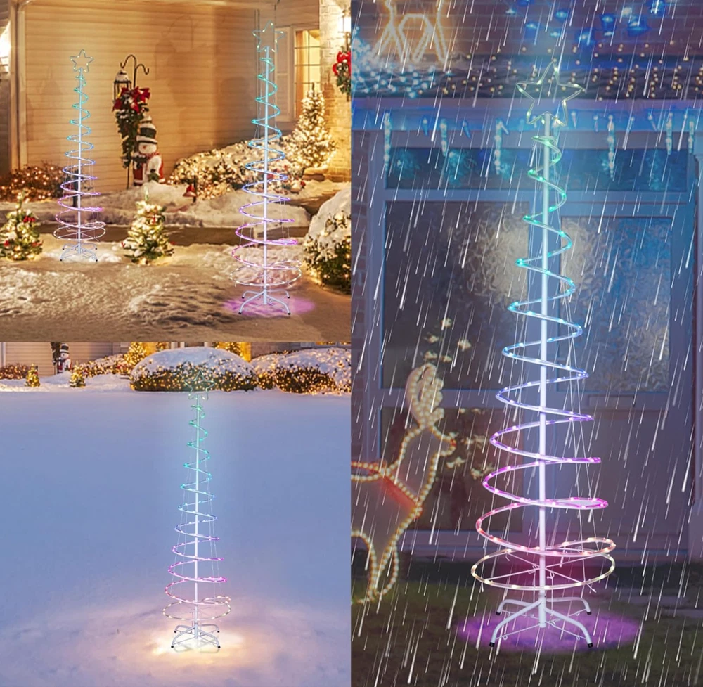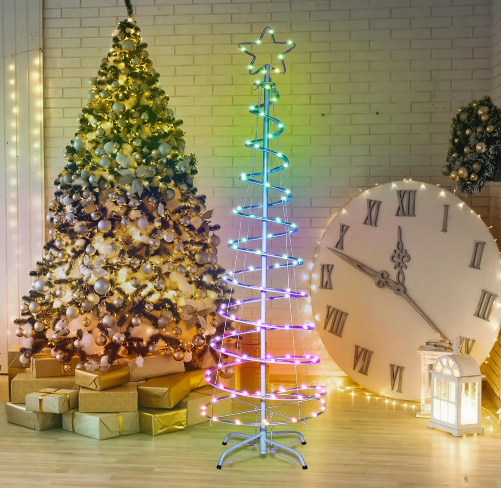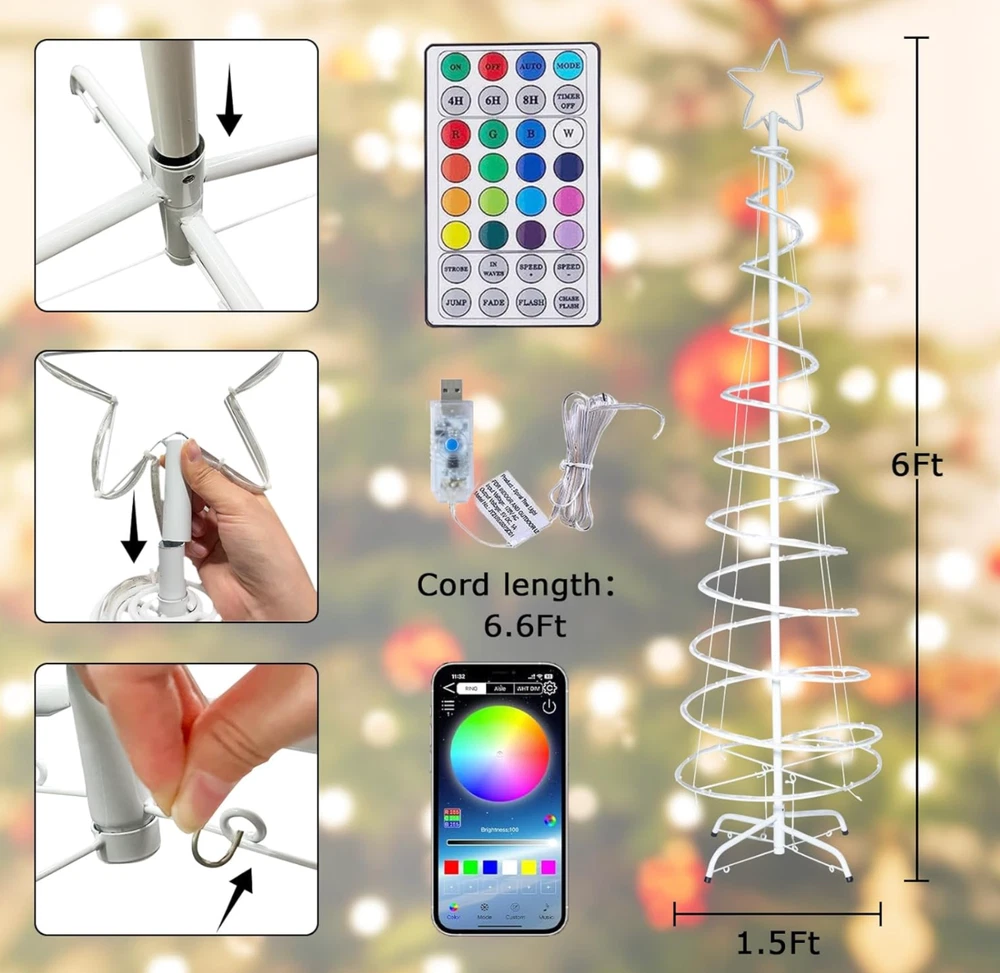 About this item Ideal Christmas Decor: The 6FT Spiral Christmas Tree Lights will add a touch of festive charm to your space. With a top star, these LED lights beautifully present the shape of a Christmas tree, perfect for creating a warm and inviting holiday atmosphere. APP & Remote Controller: You can connect the APP "Hello Fairy" or remote control will bring you and your family a perfect lighting feast and win the praise and appreciation of friends or neighbors. Easy Setup & Flexibility: Designed with a floor standing base, our Spiral Christmas Tree Lights can be easily positioned wherever you desire. Installation is a breeze, with no tools required. for added stability, the ground stakes are included. Energy Saving & & Long Lifespan: USB Powered, the Spiral LED lights use 0.7W only, low energy consumption for your home decoration; Each LED with 50,000-hour lifespan, suitable for long lasting use. Dazzling Lighting: Featuring a total of 182 RGB LEDs, our Spiral Christmas Tree Lights shine and twinkle, filling your night with joy and fun. The impressive lighting effect is sure to catch everyone's attention.