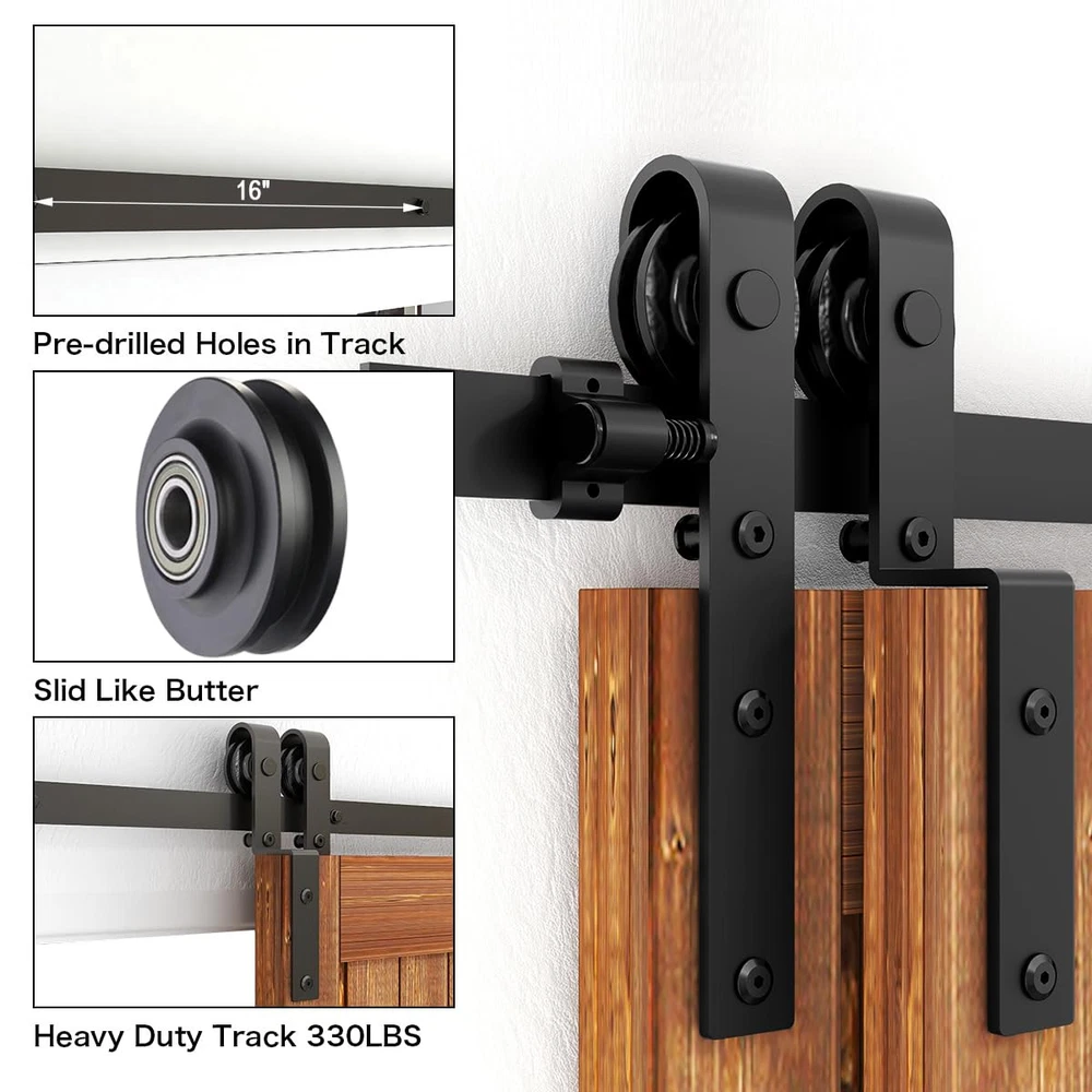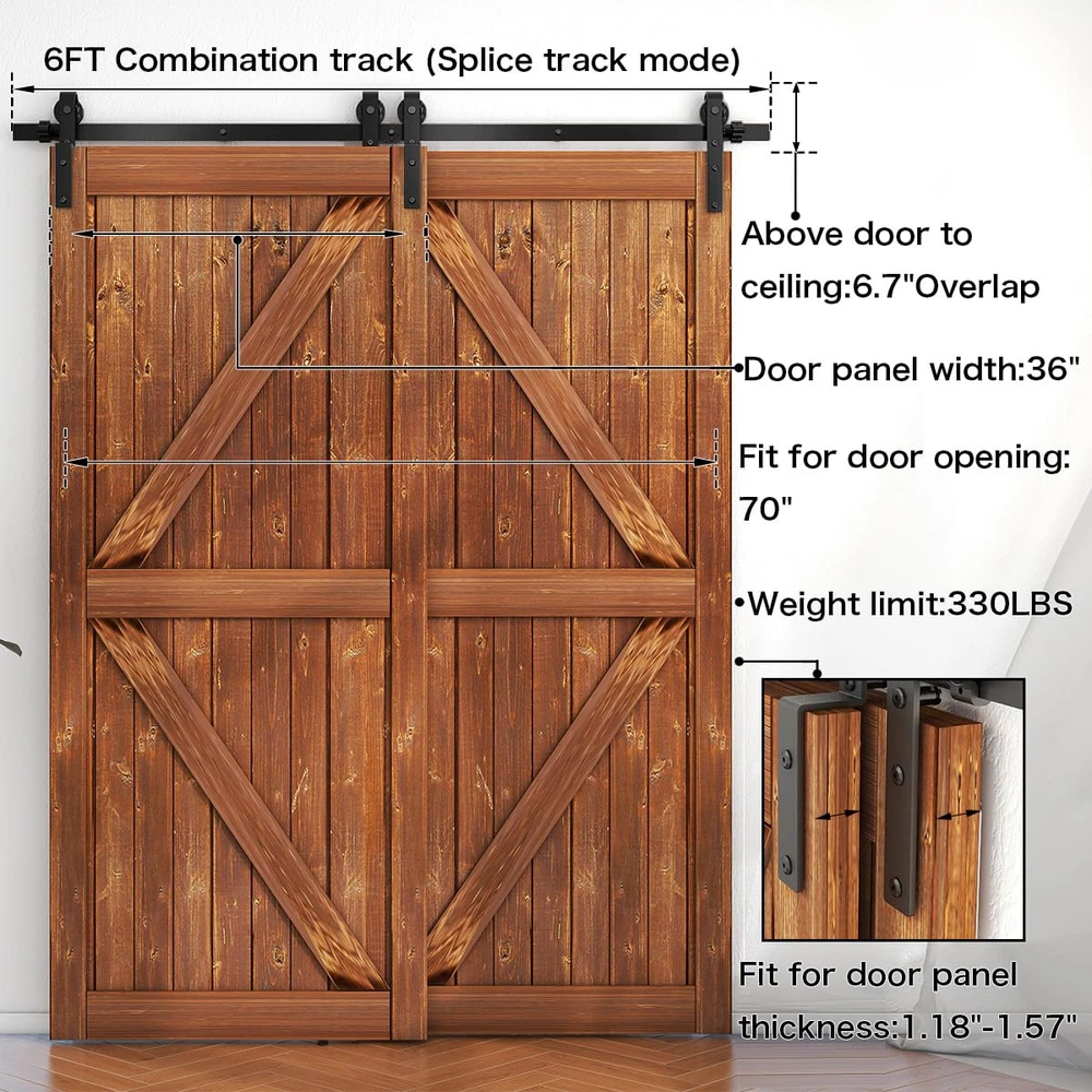 🛠Overlap Space: For Bypass Barn Door Hardware kit, there would be a 6.7" overlap space since the 2 doors are hanging on single rail. Please be reminded that your door panels should be wider than your opening. If not, the 2 rollers will hit when door slide, then drive other door slide. 🛠Package Includes: A Double Barn Door Hardware Kit comes with (6 feet splicing track, Rail Spacers, Rollers, Door Stops, Anti-jump Discs, Floor Guide, Hex Key; All other necessary hardware is included as you see in the pictures.) DOOR NOT INCLUDED. 🛠High Quality Material: The Double Sliding Barn Door Hardware Kit Bypass Made of premium steel black coating, it is waterproof and rust resistant, preventing the kit from scratching, Barn Door Kit provides silent, smooth and steady rolling. Door weight capacity: 330 lbs; fit for door width up to 36"; fit for door thickness from 1.18'' to 1.57''. 🛠Easy to Install: The Single Track Bypass Sliding Barn Door Hardware with Upgraded Combination Track Mode design and Includes Step-by-Step Installation Instruction manual ,Professional install instruction and team to help you solve all problems in time. Step by step service save your cost of finding a carpenter and enjoy joyful DIY. 🛠Service Assurance: We ensure you will get everything you need in a timely manner,we will ship at first time if missed or broken parts from U.S warehouse, any problem in using Double Bypass Barn Door Hardware Kit, our professional staff in the barn door hardware field will answer questions for you in 24 hours.