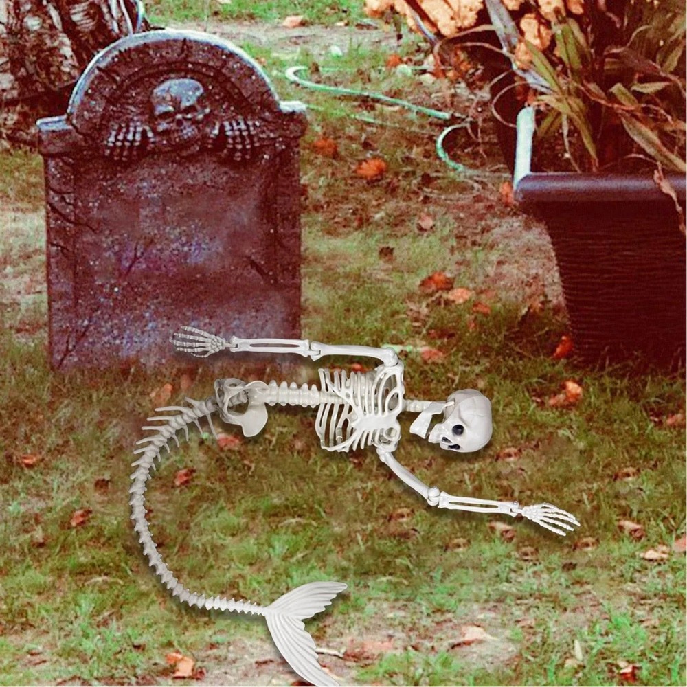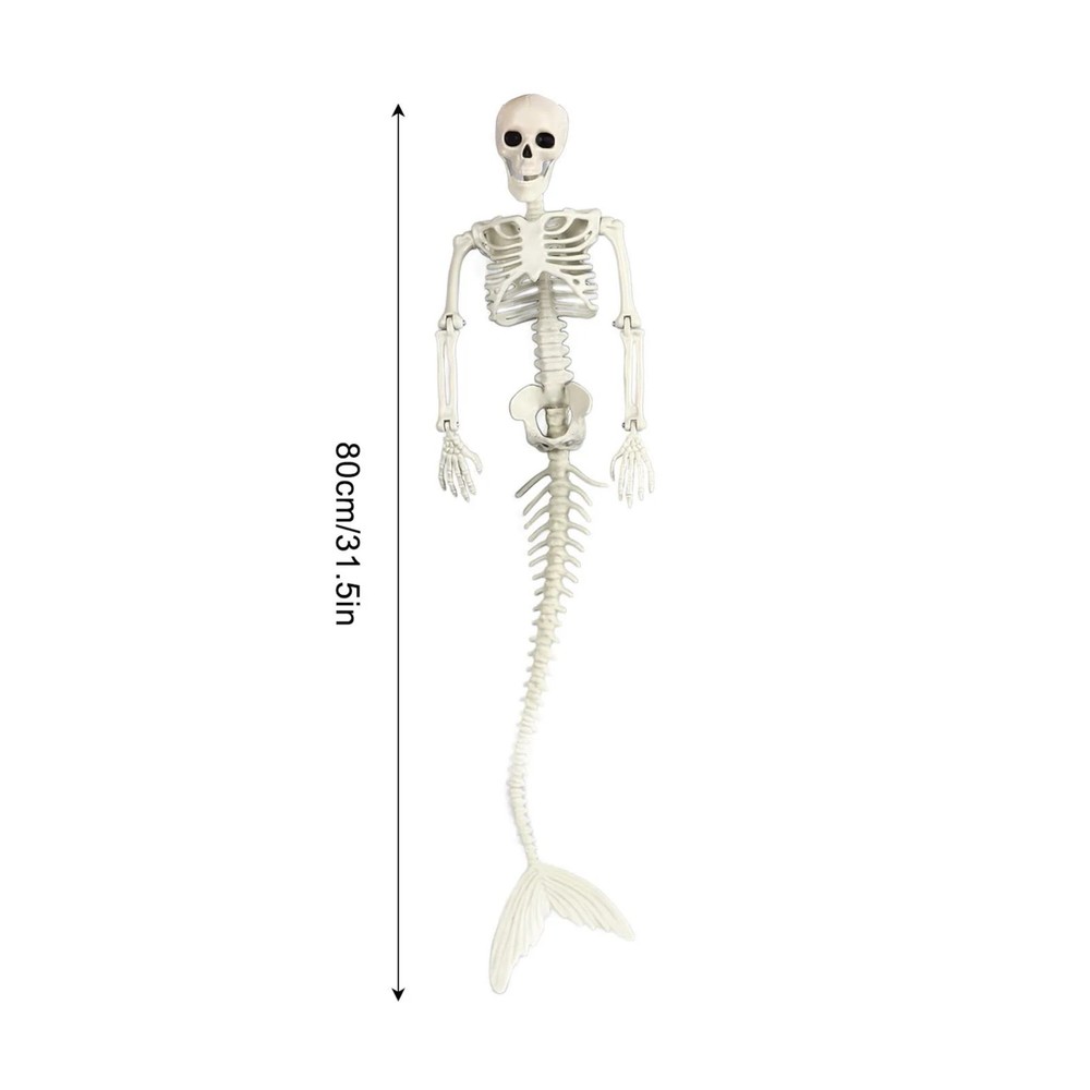 Life Size Skeleton Mermaid Halloween Outdoor Decorations Movable Posable Joints Realistic Full Body Skeleton Mermaid Props Feature: 1. Entrance Decorations: Place Halloween themed decorations near the entrance to create a welcoming and festive atmosphere for guests and trick or treaters. 2. Halloween Backdrop: Create a Halloween themed backdrop for a party or event with these charming accessories and props for a fun and festive setting for photos and socializing. 3. Life Size Skeleton: A life size skeleton of a mermaid, add this mermaid skeleton to a scary Halloween scene for an eye catching look. 4. Prime Material: This mermaid skeleton decoration is made of premium plastic material, durable and not easy to damage, can be reused. 5. Applicable Occasion: This mermaid skeleton is thrilling and interesting, suitable for use as a patio decoration for Halloween, costume party, and thriller party. Specification: Item Type: Skeleton Mermaid Weight: 475g / 16.76oz Material: Plastic Product Size: Approx. 85cm / 33.4in Package List: 1 x Skeleton Mermaid