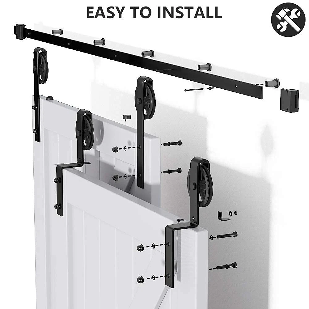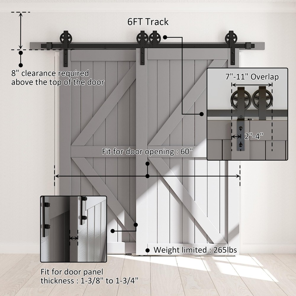 Heavy Duty Sliding Barn Door Hardware Single Track Bypass Double Door Kit [Single Track Bypass Barn Door Hardware Kit] Condition: New; Material: Carbon Steel(High Standard); Surface: Black Powder Coated(Anti-Rust); Door weight capacity: 265 lbs; Fit door panel width: Up-36"; Door Thickness: 1 3/8" - 1 3/4"; [One Single Track for Bypass System Available] Normally we need to install the bracket for bypass system,however it is not a easy job for most of us . Some Customer were not have enough space between the ceiling and Doors .But now it will not be a problem ,we have upgrade the bypass system and make it can be install on one track . [EASY TO INSTALL] Step by Step Instruction. Our Instruction is listing every step for installation, you can do it step by step, It is very easy when you install the barn door hardware.In case you get any problem or missing parts during installation ,please free feel to . [Package Included] 2*3FT Flat Track ,4*Rollers , 2*Anti-jump Pads ,2*Floor Guides ,2*Door Stoppers ,5*Leg Screws ,5*Wall Spacers ,1*Manual [IMPORTANT] "ONLY HARDWARE KIT INCLUDING, BARN DOORS WERE NOT INCLUDED."