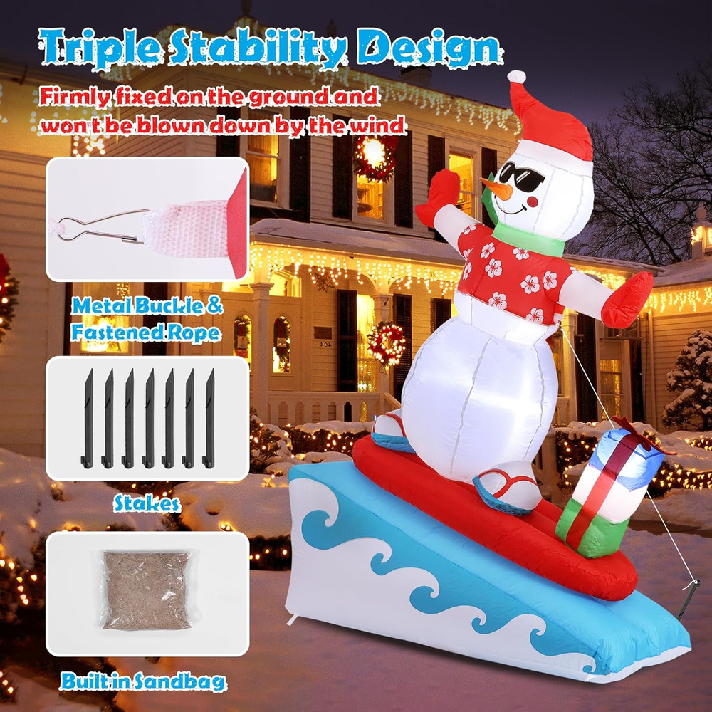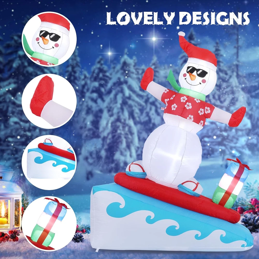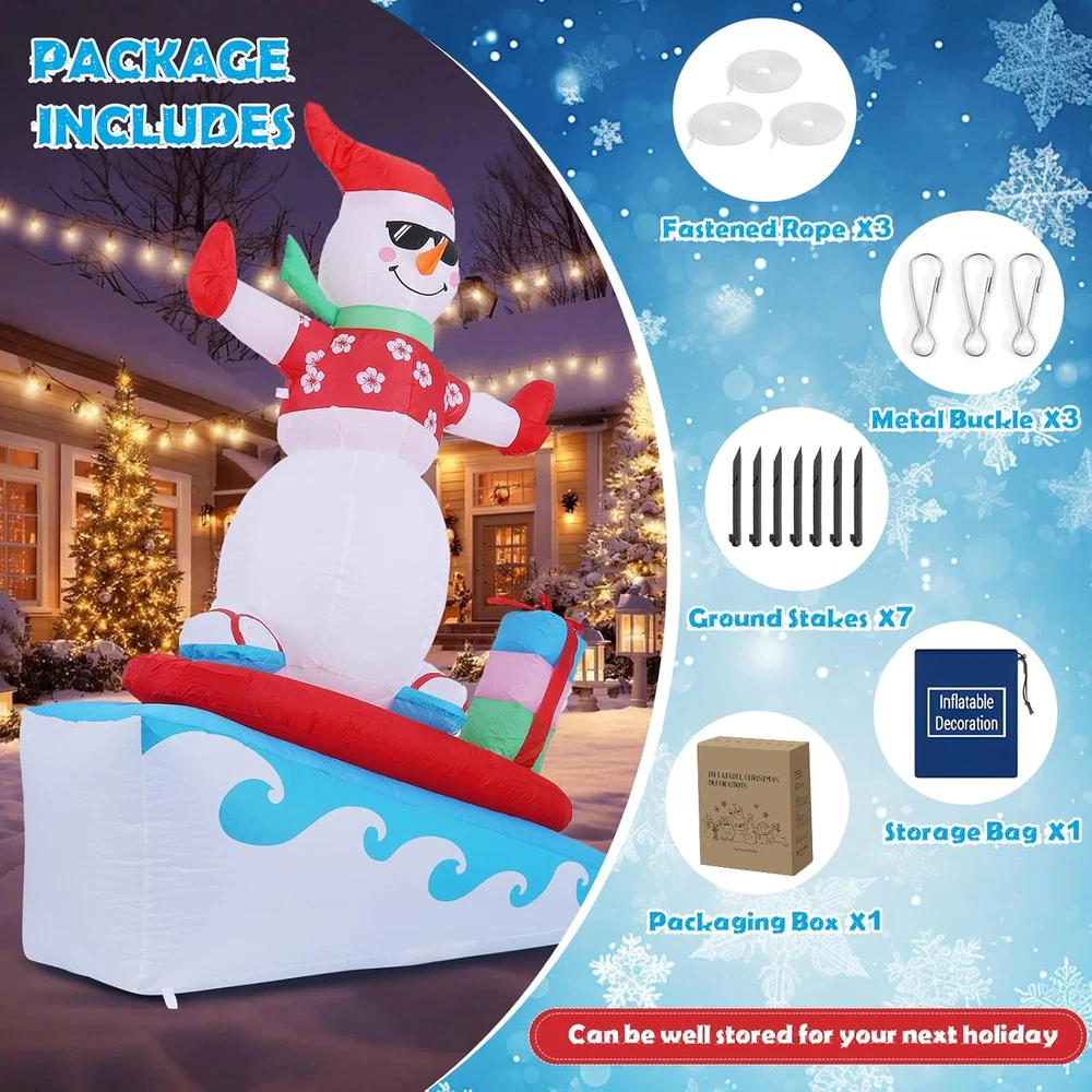 Menu Other Items Feedbacks About Us Contact Us Add To Favorites Inflatable Christmas Decorations Outdoor, 6FT Inflatable Snowman with LED Lights Surfing Snowman Blow up Yard Decorations Xmas Decorations for Xmas Party Indoor Outdoor Home Garden Lawn Surfing Snowman Inflatable: This 6FT Christmas inflatable outdoor decoration seems to have just returned from surfing in the ocean and brought Christmas presents for you and your family, which will certainly give you, your family and guests a good mood. Your children may also hope to have a cute inflatable friend to accompany them at Christmas. This snowman inflatable is an ideal Christmas gift for kids, its vivid and funny appearance will make them love it at the first sight. Inflatable snowman with LED Lights: The built-in warm white LED lights help this Christmas decorations outside inflatable light up your garden and create a happy and warm Christmas atmosphere in the evening, which will easily catch the eyes of children, neighbors and guests. All of you can dance or talk happily in the warm light forgetting all troubles. Our light up snowman is ideal for both outdoor and indoor family Christmas party decorations to enliven the festival atmosphere. High-quality Inflatable Christmas Decorations: Made of high-quality umbrella cover fabric, this Christmas inflatables snowman can be used without worries in snowy or rainy days. With excellent stitching umbrella fabric, this inflatable christmas ornament won’t be torn apart or fade, and will accompany your family at Christmas next few years. What a perfect inflatable Christmas yard decoration. Christmas outdoor inflatables with Good Stability: There are 1 built-in sndbag, 3 6.6ft ropes and 7 stakes to help to fix the blow up snowman. You can easily install the outdoor snowman on the lawn, in the yard or in the garden. The inflatable snowman outdoor will be firmly fixed on the ground and won’t be blown down by the wind. Just let this Christmas inflatable snowman bring you laughter and joy at Christmas and enjoy a happy and wonderful Christmas party! Fast Inflation and Deflation: The snowman inflatable is quipped with a powerful air blower. Plug in and zip up, you'll see a inflatable snowman in 30s. Unplug and zip up, the snowman blow up can be quickly deflated. The 6.6ft power cord reduces the distance limit of power supply. Just feel free to have a Christmas party in the yard. Putting the Xmas inflatable snowman in front of the door of your store, shopping window will make them more eye-catching and attract more customers. Precautions: 1. Do not cover the surface of the blower during inflation. 2. Keep away from sharp objects. 3. Keep the plug and blower away from water. Elegear guarantees to serve you! If you have any questions, suggestions, ideas, please feel free to ! Product Description Elegear Christmas Inflatables Outdoor Decorations - 6FT Surfing Snowman Do you want to enjoy a different Christmas party? Choose Elegear! With a vivid and funny appearance, this 6FT surfing inflatable snowman will enliven your Christmas party and create a cozy and warm Christmas atmosphere for you. The video showcases the product in use. The video guides you through product setup. The video compares multiple products. The video shows the product being unpacked. Elegear Inflatable Christmas Yard Decorations 6FT Blow Up Surfing Snowman Seeing a snowman in the courtyard when you go back home after one-day hard work will definitely give a you a good mood. Putting this Christmas snowman inflatable in you yard will catch the eyes of your neighbors and passersby and make your garden stand out in your community. This is a perfect Christmas gift for your family. Follow the video steps to install Precautions: 1. Do not cover the surface of the blower during inflation. 2. Keep away from sharp objects. 3. Keep the plug and blower away from water. The video showcases the product in use. The video guides you through product setup. The video compares multiple products. The video shows the product being unpacked. Perfect for outdoor and indoor decorations Elegear Holiday Decorations Add to Cart Add to Cart Add to Cart Add to Cart Add to Cart Add to Cart Customer Reviews 4.5 out of 5 stars 225 4.5 out of 5 stars 225 4.5 out of 5 stars 225 4.6 out of 5 stars 96 4.7 out of 5 stars 19 4.7 out of 5 stars 24 Price $45.99 $ 45 . 99 $56.99 $ 56 . 99 $29.99 $ 29 . 99 $35.99 $ 35 . 99 $29.99 $ 29 . 99 $29.99 $ 29 . 99 Special Feature Extra Large, 11 Modes Unique Pink Design, 140 LEDs 60 LEDs, 8 Modes 140 LEDs, 8 Modes 3D, 8 Modes, Timer 3D Infinty Mirror Tunnel Light Occasion Outdoor, Indoor Outdoor, Indoor Outdoor, Indoor Outdoor, Indoor Outdoor, Indoor, Mantle Outdoor, Indoor Size 11.8IN 7.4IN 7.4IN 7.4IN 13.8IN 3FT Original Design ✔ ✔ ✔ ✔ ✔ ✔ Waterproof ✔ ✔ ✔ ✔ ✔ ✔ Item Specification Item Shape 6FT Surfing Snowman Item Dimensions 55.2 x 24 x 72 inches Color Christmas Colors Theme Christmas Occasion Christmas Additional Features Easy Setup, Fade Resistant, Durable, Easy Deflate Subject Character Snowman Cartoon Character Snowman Dimensions Shipping Returns Additional Info Product Dimensions: 24.0 inches x 55.2 inches x 72.0 inches. Weight: 2.88 lb Fast shipping is very important for us. Our standard shipping service is FREE. Your order will be shipped within 1-3 business days upon full payment received. Most items are delivered within 3-5 business days, however, please allow 3-10 business days. We are shipping only to USA. We only ship to the confirmed Paypal address. We reserve the right to cancel any order for any reason at any time. We are not responsible for undeliverable addresses. We offer a 30 day return policy from checkout winning date. Your satisfaction is guaranteed! If for any reason you are unhappy with your item, just return it within 30 days for a full refund, minus shipping cost. Please contact us prior to initiating a return so that we can issue you a refund authorization. Items defectiv