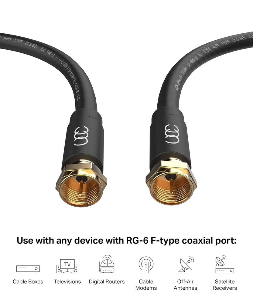 Durable 6FT Coaxial Cable RG6 with F Connector - Weatherproof for Indoor/Outdoor ‹ › ‹ › ‹ › ‹ › ‹ › ‹ › ‹ › ‹ › ‹ › Durable 6FT Coaxial Cable RG6 with F Connector - Weatherproof for Indoor/Outdoor Use Key Features: Versatile Connectivity: Ideal for connecting cable televisions, satellite receivers, cable modems, VCRs, cable boxes, digital routers, antennas, computer networks, digital audio devices, and more. All-Weather Durability: Designed with a quadruple shielding to protect against electrical interference, making it perfect for outdoor or indoor use. High-Grade Protection: Encased in a water-proof, UV resistant, and lead-free PVC jacket featuring weather-sealed Double Rubber O-Rings for secure connections. Superior Connectivity: Gold-plated connectors minimize signal interference, ensuring a corrosion-resistant connection that remains intact. In-Wall Safety Rated: Complies with fire safety codes, making it suitable for in-wall installations, security systems, speaker wires, intercom systems, and more. Exceptional Signal Quality: Constructed with a pure copper core, this cable maintains a uniform 75 ohms, effectively supporting high frequency ranges from 2.3 MHz to 3.0 GHz. Hassle-Free : Backed by a 12- and complimentary U.S.-based technical support for your peace of mind. Why Choose Our Coaxial Cable? Elevate your audio and visual experience with our 6FT Coaxial Cable RG6, the embodiment of durability and reliability. Whether you need it for indoor entertainment or outdoor applications, this cable is built to withstand the elements while delivering unparalleled performance. The seamless gold-plated connectors ensure a steady connection, while its superior shielding provides protection against signal loss. Experience the clarity of sound and picture that you deserve with this versatile cable. Don't settle for less; upgrade your connectivity with our high-performance coaxial cable! Shipping Free & Fast Shipping - We offer free shipping to most of the USA with a normal delivery time of 3-7 days. However, due to the current situation, additional delivery time (up to 3 weeks) may be required for some items. Alternative Carriers - We may use alternative carriers (e.g. USPS, FedEx, UPS, etc.) to ensure your package arrives safely and on time. Due to the use of multiple carriers, we are unable to provide a tracking number automatically. Handling Time - Orders are processed and shipped within 1-2 business days of receiving cleared payment. Shipping Restrictions - Shipping to Alaska, Hawaii, Puerto Rico, Guam, and other US territories may incur shipping charges or delivery restrictions. Please contact us before ordering, or your order can be refunded/cancelled. State Restrictions - There may be restrictions based on your state of purchase. For example, certain items may not be shipped to California due to state regulations. Contact for Tracking Updates - If you require tracking updates or have any concerns about the delivery of your order, please feel free to contact us, and we will be happy to assist you. Return 30-Day Hassle-Free Returns - We want you to be completely satisfied with your purchase. If you are not, you can return the item within 30 days of receiving it for a full refund or exchange. Easy Return Process - To start a return, simply contact us and we will provide you with a prepaid return shipping label and detailed instructions. Restocking Fee - There are no restocking fees for returns. However, the buyer is responsible for return shipping costs if the return is not due to a seller's error. Refund Processing Time - Refunds will be processed within 5 business days of receiving the returned item in its condition. Payment We accept all major credit cards, PayPal, and Apple Pay for your convenience. Your payment information is secure and encrypted to ensure a safe and seamless transaction. Please complete your payment within 3 days of purchase to avoid any delays in shipping. Feedback Your feedback is extremely important to us. We strive to provide the best products and customer service possible. If you are satisfied with your purchase, please take a moment to leave us a positive review. If you have any concerns or issues with your order, please contact us before leaving negative feedback. We are committed to resolving any problems and ensuring your satisfaction. Contact Us If you have any questions or concerns, please feel free to out to our customer support team. You can contact us through the eBay messaging system. We are available Monday to Friday, 9:00 am to 5:00 pm EST, and we will do our best to respond to your inquiry within 24 hours. Buy it now and enjoy a pleasant shopping experience! Unit Quantity: 6 Item Height: Coaxial Cable Item Length: Coaxial Cable Item Width: Coaxial Cable Connector A: Coaxial F Male Connector B: Coaxial F Male Features: Gold Plated,Low Loss High-Speed,Quad Shielded,In-Wall Rated,UV Resistant,Lead-Free PVC Jacket Compatible Model: Universal,Direct TV Boxes,Router,Cable Box,Off-Air Antennas,Satellite Receivers,TV,TV Box,Satellite Dish,Xfinity,Gigabit Internet,Modem,Television Type: Coaxial Cable Cable Length: 6 ft Connection Split/Duplication: 1:1 Output Voltage: Not applicable Unit Type: ft Color: Black Gauge: 18 AWG Fiber Type: Not applicable