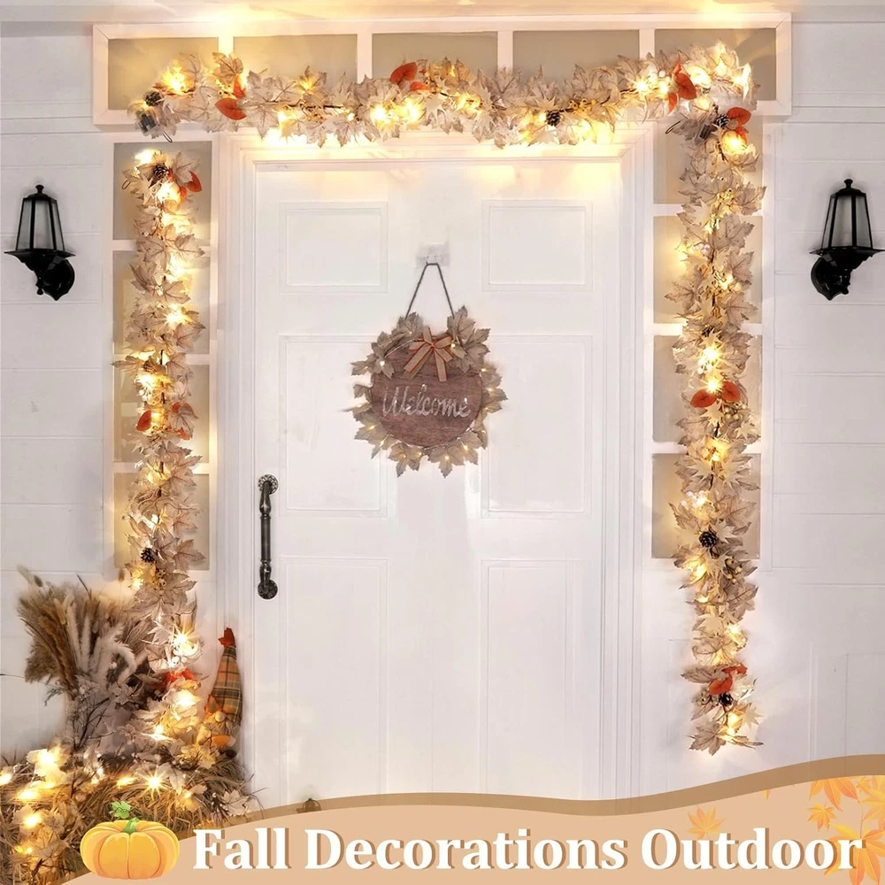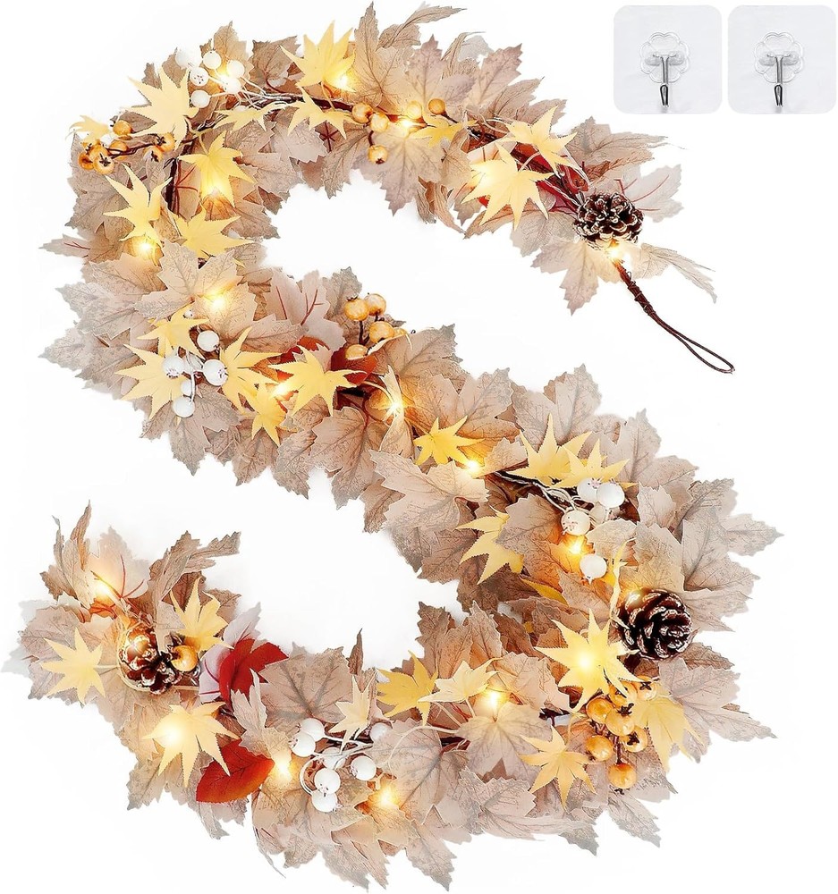 Timer - Fall Garland Decorations for Home, 6Ft Pre-Lit Real 6 FT, Beige LuxeFusion Product Description Features 6 FT Maples Leaves Garland: This 6FT fall garland features natural gray white maples leaves, orange eucalyptus, pine cones, white and yellow berries, capturing the essence of the season in one stunning piece. Ideal for Thanksgiving, Halloween decor Cozy Glow with Built-In Timer: Pre-lit with 20 warm white LEDs, this fall garland with lights adds a soft, welcoming glow. The built-in timer keeps the lights on for 6 hours and off for 18—set it and forget it while enjoying effortless autumn charm Durable & Mess-Free Decor: Crafted from high-quality silk and plastic, these fall decorations for home are reusable year after year. No falling leaves or wiring hassles—just open, fluff, and style it on your table, stairs, or wall Indoor & Outdoor Ready: Whether used as a Halloween garland indoor centerpiece or wrapped around porch railings outdoors, this garland holds up beautifully. Includes 2 adhesive hooks for easy, flexible setup in any space Perfect Fit for Mantels & More: Measuring 6 feet long with 4x4 inch maples leaves, this fall Christmas garland for mantle is ideal for styling fireplaces, door frames, or banisters. Garland is great for fall, Halloween, Thanksgiving and Christmas Decor Product Details Is Lighted: Yes Size: 6 FT Shape: Garland Manufacturer: TURNMEON Package Dimensions: 9.45 x 8.23 x 4.45 inches Item Weight: 14.4 ounces Item model number: DCH-4V112MAA Brand: TURNMEON Color: Beige Material: Polyvinyl Chloride (PVC) Number of Light Sources: 20 Is Artificial Garland: Yes Free Shipping All orders ship free and fast to your doorstep. Easy Returns Satisfaction guaranteed. 30-day returns, no questions asked. 24/7 Support Contact us anytime; we’re here to help, day or night. Brought to you by LuxeFusion – Quality you can trust.