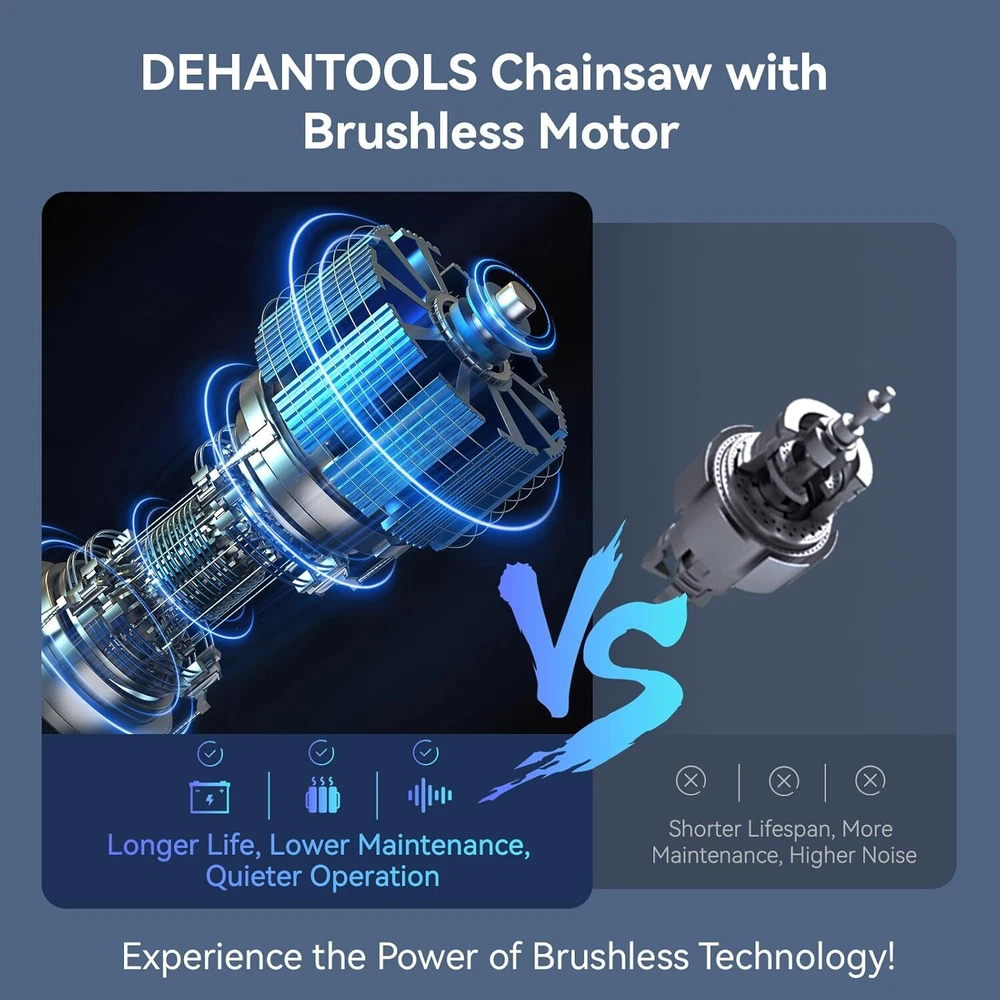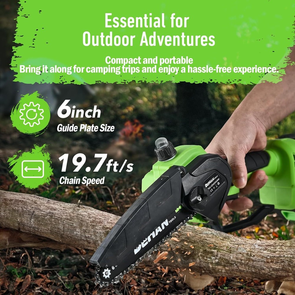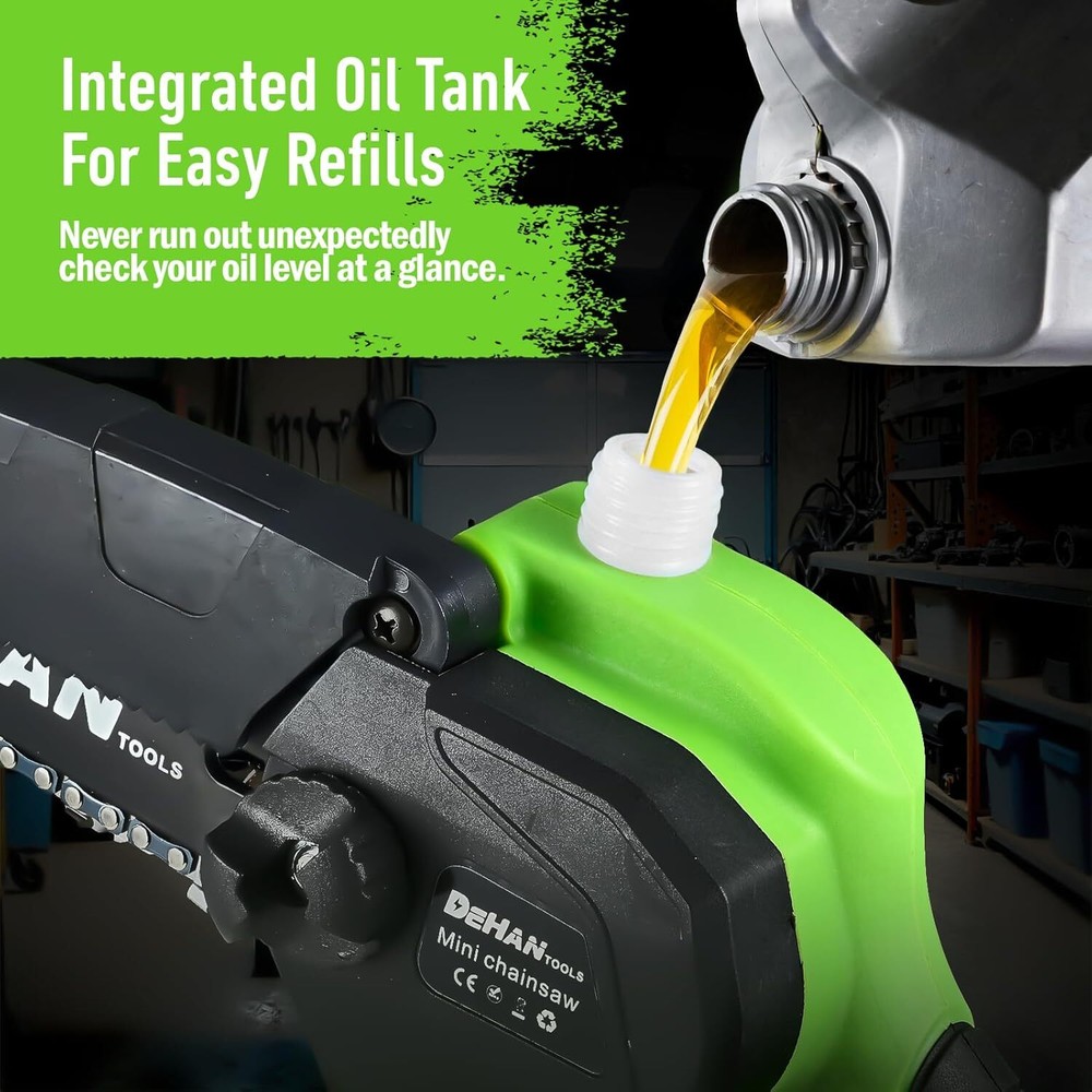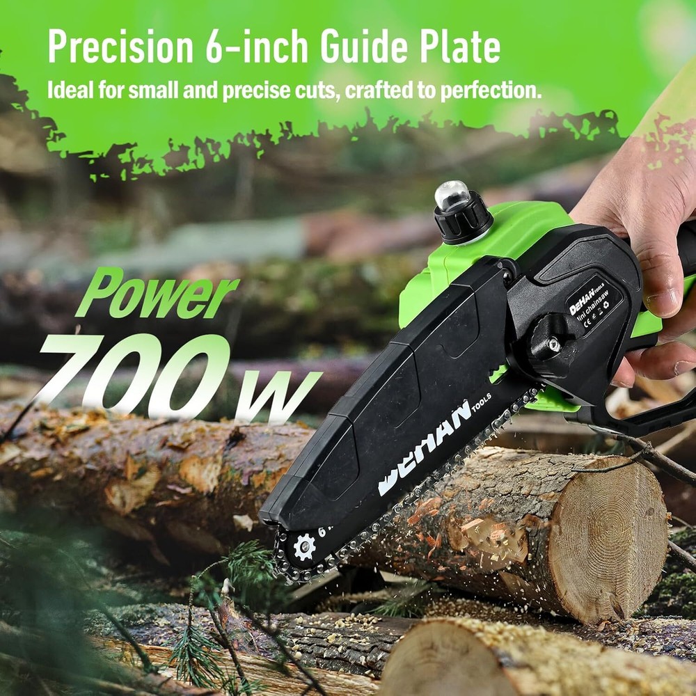 Chainsaw 6 Inch Mini Cordless Brushless Chainsaw, with 2 x 2.0Ah Batteries, Portable Handheld Chain Saw for Cutting Tree Trimming, Wood Cutting, Best Gifts for Men, Dad and Husband Item Description About this item Powerful Brushless Motor Chainsaw: This DEHANTOOLS Mini Chainsaw is equipped with an upgraded brushless pure copper motor that provides superior torque, increased power, and smoother cuts. The brushless design enhances cutting efficiency, reduces friction and maintenance, and ensures longer-lasting performance for all your cutting needs. 6 Inch Mini Chainsaw: DEHANTOOLS Cordless Electric Chainsaw features a 700W motor with a 20ft/s cutting speed, effortlessly slicing through 6-inch branches and logs. Ideal for trimming, pruning, and small DIY woodwork tasks—making outdoor and home projects quicker and easier. Lightweight & Easy to Handle: Weighing only 6.2 lbs, this 6-inch small chainsaw is lightweight, compact, and comfortable to use for extended periods. Quick to assemble in under a minute, it’s perfect for homeowners, gardeners, and DIY enthusiasts who need a tool that's efficient, portable, and easy to operate. Enhanced Safety & Durability: The DEHANTOOLS mini chainsaw features a dual safety lock to prevent accidental starts and an anti-kickback system for safer operation. The ergonomic handle offers a secure, comfortable grip, minimizing slip risks during use. Built to last, this chainsaw also includes an auto-oiling system for smooth performance and long-term durability. Complete Chainsaw Kit with Everything You Need: The full kit includes 2 x 21V 2.0Ah rechargeable batteries, 1 x charger, 1 x pair of work gloves, 1 x pair of safety goggles, 1 x oil bottle, 2 x guide bars, 3 x chains, 1 x cleaning brush, 1 x screwdriver, and 1 x storage box for convenient organization. Get started immediately and enjoy extended, uninterrupted cutting power with the included long-lasting batteries. › See more product details Payment We accept payment only through PAYPAL Shipping We ship products worldwide through standard express courier service, it will reach within 7 to 10 days to abroad buyers, we ship the product after recieved clear payment and give full information about shipment to the buyer Return We accept product return within 7 to 21 days from delivery date but product should be in original position and not in damaged condition,the return shipping charges will be buyer responsibility