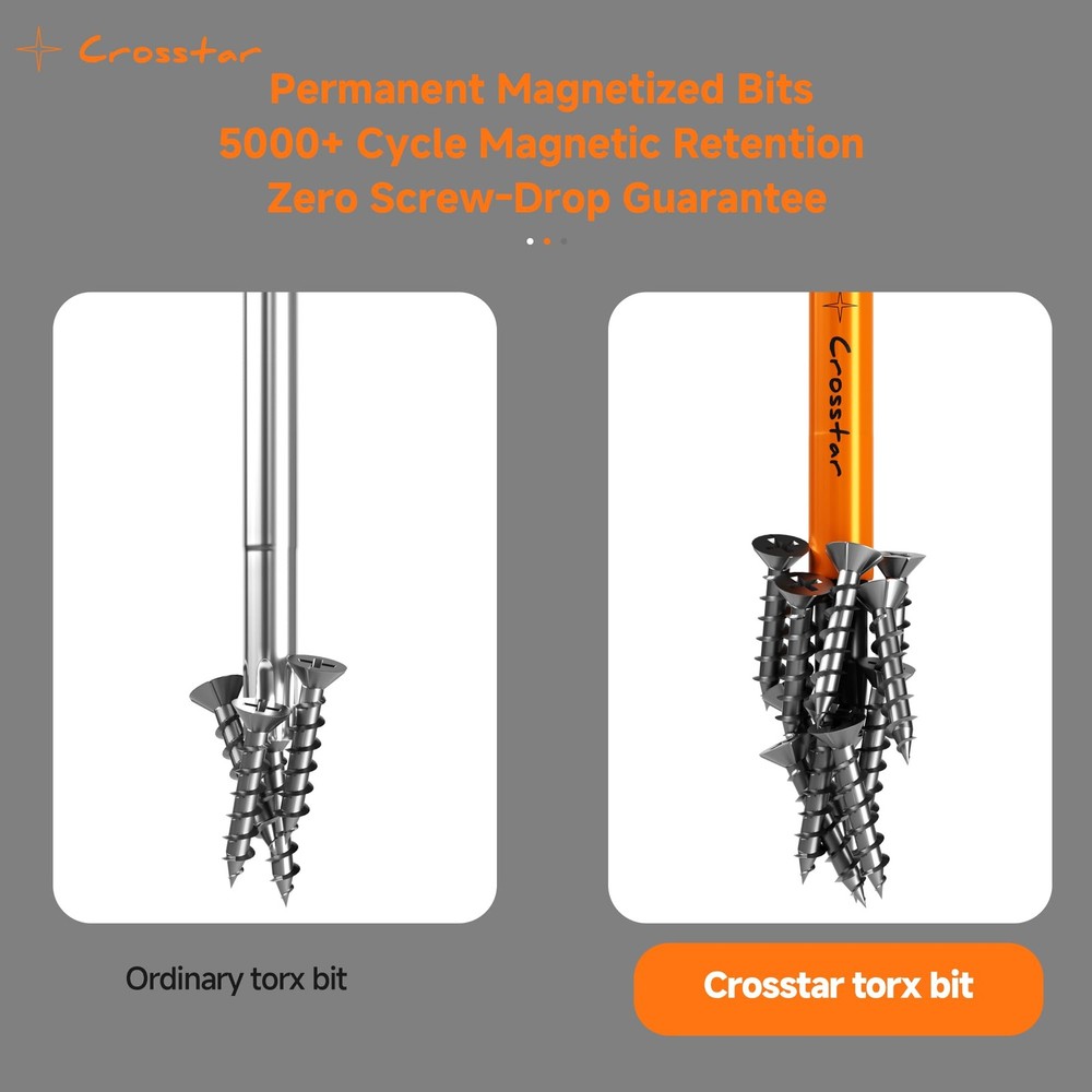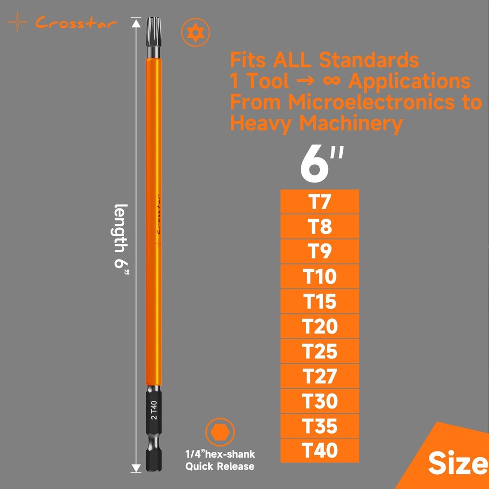【14 Commonly Used Drill Bits, 1 Magnetizer】This product is 6 inches long, about 15.24 cm, carrying T7, T8, T9, T10, T15, 2 T20, 2 T25, 2 T27, T30, T35 and T40 models with 1 magnetizer. The product is suitable for use with tools such as impact drivers, drills and screwdrivers 【High-quality S2 steel, CNC precision manufacturing】The main body of this product is made of high-strength and high-toughness S2 steel, wear-resistant and high-temperature resistant, not easy to be corroded, which greatly extends the service life of the drill, and is equipped with eye-catching orange paint, the product model number is clearly marked, and can be quickly detected.CNC machine tooling ensures that the accuracy and overall quality of the drill, can excellently complete a variety of work tasks 【Tamper-resistant torx bits and magnetic design of the bits】 The tamper-resistant design of the bits allows them to be used in work environments where enhanced security is required. The drill is equipped with a magnetic function to hold small parts, nails and other objects during work, ensuring that parts are not easily lost 【Magnetic add/drop function and slim size design】You can use the magnetizer to magnetize or demagnetize the drill bit according to your actual use, in order to better complete your work. 6 inches long drill bit makes this product can be used in more work scenarios 【Easy to Store and Carry, Suitable for Multiple Scenarios】Transparent storage box design, you can visualize the drill accessories inside. The storage box is small and lightweight, can be put into the pocket, carry with you. This product can be used for furniture assembly, maintenance of household appliances, etc., but also can be used to repair electronic equipment, driving tools, precision instruments, etc