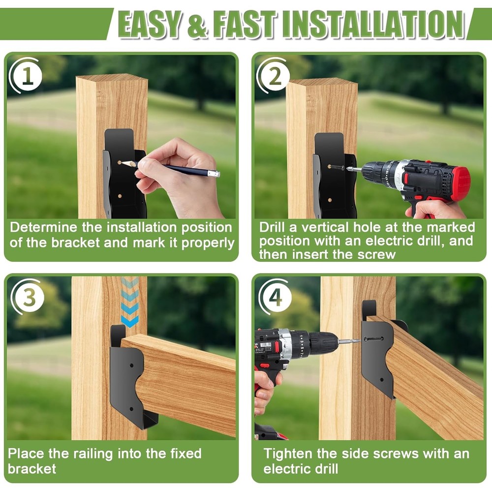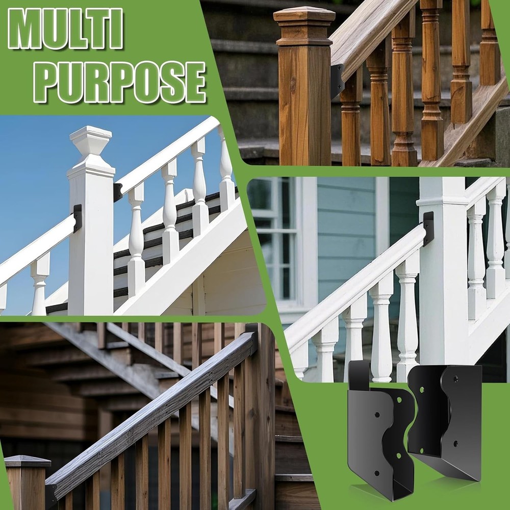 6 Pair 30° Deck Railing Bracket Stair Connector Stainless Steel 2"x4"(Actual 1.5"X3.5") Suitable for Staircase Handrail, Wooden Column Fence Product Details Package Dimensions : 10.71 x 5.24 x 2.48 inches; 4.06 Pounds Manufacturer : FNXAOR Brand: FNXAOR Material: Metal Manufacturer: FNXAOR 【QUALITY DESIGN】 Stair railing bracket connector fit standard 2"x4" (Actually 1.5"x3.5") wood deck railing, Can be installed in the 30 ° oblique angle of the deck railing stairs, Hidden stair railing bracket closely fit with the wooden post connection, Deck railing bracket hidden design, indoor and outdoor can choose to use, beautiful and generous. 【STURDY MATERIAL】Staircase railing made of high-strength and corrosion-resistant 201 stainless steel material, high-temperature black powder coating treatment, waterproof, rust-proof, can resist the erosion of wind and rain and high temperature in all seasons. 【APPLICATIONS】Concealed Stair Deck railing bracket can be used indoors and outdoors and can be installed on Deck railings Stair, Fences, Barns and Beam ends; Kit includes all Bracket pieces and Screws for immediate installation 【SIZE SPECIFICATION】 Top: L1.75" x W1.57" x H4.15" Bottom: L1.75" xW 1.57" x H5.1" (Actual mounting size: 1 ½" x 3 ½") 【INSTALLATION STEPS】 1. Install the bracket in the pre-installation position of the Post and lock in the long screws; Slide the ends of the handrail (Both ends need to be built and polished according to the installation tilt angle) into the joist, And then lock in the short screws on each side, Complete the installation