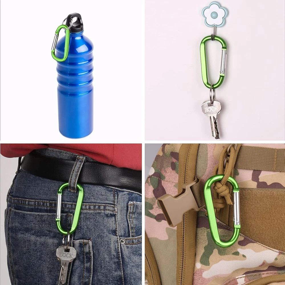 Lightweight but strong, aircraft aluminum material made, max secure load is 50 LB, elegant, strong and practical. Durable and easy to use, improved spring clip can be opened and closed more than 5000+ times in our test 6pcs extra keyrings pack, carabineer length: 3"/79mm,package includes 6pcs carabiner clips,6pcs keyrings Great for indoor outdoor applications, hanging lights, camping tent supplies, backpack attach keychain clips etc. Not for climbing or heavy duty work