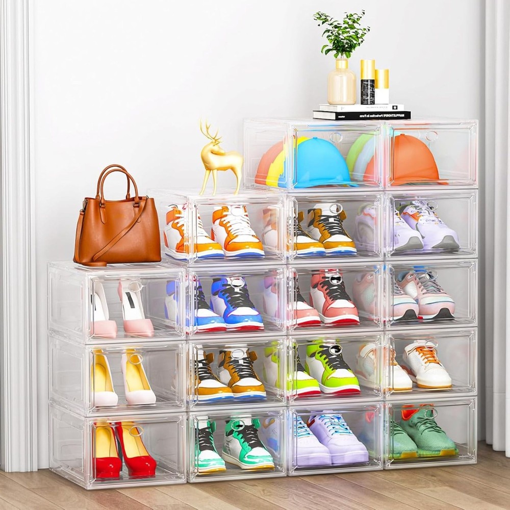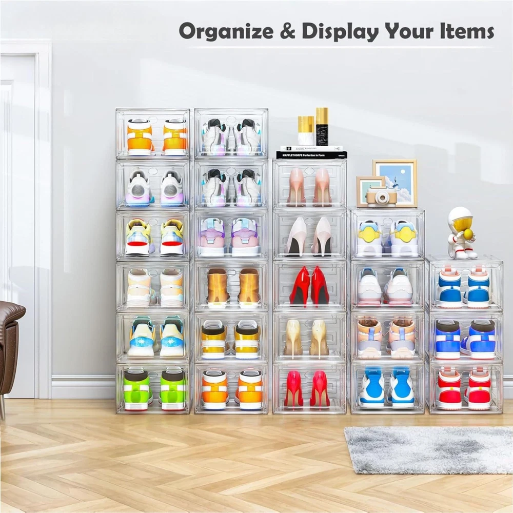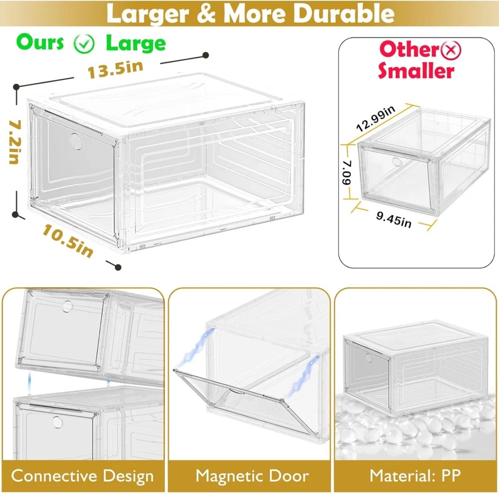 Thicken & Sturdy Clear Shoe Storage Organizer with Magnetic Door, Stackable Boxes for Closet, Foldable Space-Saving Shoe Rack for Sneaker Boot Container, Plastic Shoe Cabinet Shoe Box 6 Pack, White A must for every shoe lover! - The six sides of the shoes organizer are made of upgrade harder thick solid plastic. Say goodbye to those flimsy plastic shoe storage boxes, our solid shoe storage organizer worth every penny. Clear Shoe Boxes Stackable - Clear magnetic front door, stackable design, harder material, the shoe case provide you a more load-bearing multiple layers of shoe walls. No sliding, safe and stable. Stack easily on side and tops with pegs, you can connect them however you please. Not Only shoe organizer! - Total 6 packs shoe boxes with the size of 13.5"x10.6"x7.5". Suitable for storage with shoes, hat, clothes, baby items, toys. Transparent design allows you to recognize the items you want at a glance. Great gifts for everyone - Suitable for all families. Large-capacity allow you put sneakers stand in the box not laying flat in the shoe bin. fits various types of shoes. Sneakers, heels, flats, flip flops, sandals, wedges. Worry about assemble? - Each of our employees who have assembled our clear shoe box thinks it is so easy. By watching the installation notes, anybody can set up this shoe box organizer with ease. If you encounter any issues, please don't hesitate to contact us at your convenience!