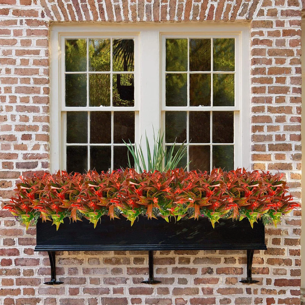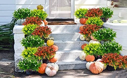 Size and Package:13.4"H x 8.7’’W. One package includes 6 bundles of outdoor faux plants. 6 bunches can filler a 8" pot, that looks very full and thick. 12 bunches can be "planted" in 2 of 8" pots. They were also nice accent pieces, will perfect to arrange around smaller flowers or large plants Easy to "Plant":The artificial flowers for outdoors can be easily organized and fixed on vase, wall pots, wood boxes, outdoor containers, hanging pots and fences. If the size is too big for you, you can trim them to the size you want with scissors or pliers UV Resistant Artificial Outdoor Plants:These outdoor fake plants are made of high quality plastic, uv protection, weather proof. it's sturdy, attactive, and don't worry keep it live.“Plant” these fake plants outdoor on kitchen, yards, kitchen, balcony, window boxes, front porch, fence, patio, entrey way and yard. the uv fake outdoor plants can hold up themselves nicely in the sun, rain or wind Look Real & Care Free:Dusts accumulated from long-term use can be washed away with water, If you place them outdoor, the rain will do the job for you Warm Tips:The fake outdoor plants are packed tightly for shipping, Please stretch out the sprigs to get the best looking of the fake greeenry shrubs. if you worry they will fade in the sun, so just hit them with a coat of outdoor UV spray once a week or so and you have pretty, fuss-free flowers all seasons
