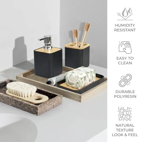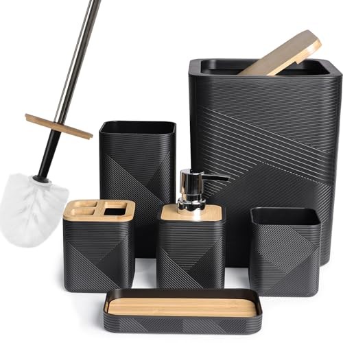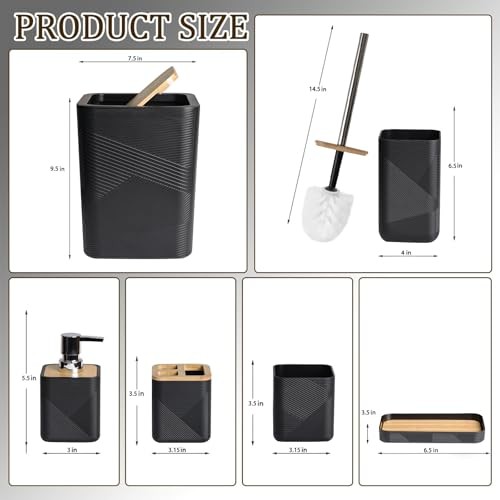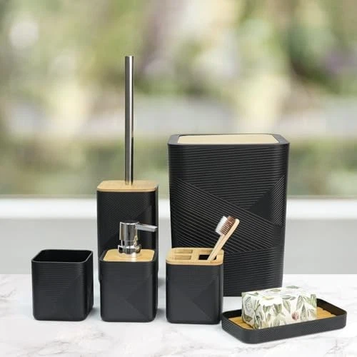 Menu 1. We require immediate payment. 2. We currently accept payment via eBay managed payments only. 3. Once payment is cleared, we will dispatch your shipment within 1-3 business days. Please refer to the "Shipping" tab for more information regarding shipping speed to your destination. Bathroom Accessories Set 6 Piece Bamboo Bath Ensemble Includes Soap Dispenser, Toothbrush Holder, Toothbrush Cup, Soap Dish for Decorative Countertop and Housewarming Gift (Black) Product description Polyester DURABLE and AMAZING QUALITY: this 6-Piece Bathroom Accessory Set is made of durable plastic that can outlast competing products. It’s also ideal for kids' bath for its durability and not easy to break like ceramic set , not easy to mildew like bamboo set. Our high quality plastic bath accessories will resist to constant use, keeping their look just as elegant and new over time FULLY FUNCTIONAL COMPLETED SET - A completed bathroom accessory set which equips everything you will need to organize your toiletries. Toothbrush holder features 3 - holed openings, 2 small ones allow you to keep your toothbrushes and 1 larger hole to place slim toothpaste, making brushing teeth in one grab PREMIUM QUALITY LIQUID SOAP DISPENSER PUMP – We know how frustrating it can be to use a flimsy pump that leaks or just does not work. No matter how your bathroom set looks like, a bad pump can ruin the experience. That’s why we included a hard plastic pump for the liquid soap dispenser in this set ELEGANT DESIGN: take your bathroom decor to stylish new heights with this bathroom accessories set, very stunning and a great touch of extra elegance to the bathrooms, perfect for giving as a gift for housewarming or a wedding Product description Elegant Design , Set Includes :1 Soap Dispenser, 1 Toothbrush Holder, 1 Toothbrush Cup, 1 Soap Dish, 1 Toilet Brush Holder,1 Trash Can,1 Qtip holder PLEASE MESSAGE US IF YOU HAVE ANY OTHER QUESTIONS, AND MANY THANKS FOR READING ALL OF THIS. Copyright ©#. All Rights Reserved.