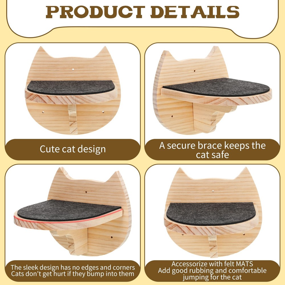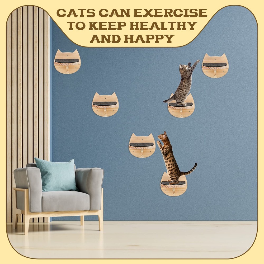 Features: You can give this cat wall furniture set to your family, colleagues and friends, and they will be very happy to receive such practical and useful gifts, which can bring lots of fun to their cats. These cat ladders can help increase cats' reaction and practice, get away from being fat due to lying on the floor for the whole day, besides, cats can play without your accompany by. Specifications: Material: wood Color: wood color Size: each about 19 x 17 cm/ 7.48 x 6.69 inches Package includes: 6 x Cat stairs with instruction book and installation tools Notes: Manual measurement, please allow slight errors on size. The color may exist a slight difference due to different screen displays. Swallowing risk may exist, please keep away from kids. Package Includes: the package will provide you with 6 pieces of cat stairs, which are rich in quantity and delicate in appearance, can well meet your daily use and decorative needs Fine Workmanship: the cat steps for wall are composed of wood material, also equipped with screws and wall anchors, sturdy and firm, not easy to break, deform or fade, has no unpleasant odors or burrs, serviceable for long time use; Also equipped with a felt mat, your cat will be happy to play with it Size Information: each cat wall shelf measures about 19 x 17 cm/ 7.48 x 6.69 inches, suitable for most cats, they can jump, walk or rest on the shelf Stylish and Practical: cat climbing shelf is designed for cats scratching, anti slip, looks more beautiful and elegant at the same time, making an interesting play place for your cats; It can also save your space, and decorating your house Easy to Install: the cat wall stairs are equipped with instructions and complete installation tools, friendly to most people to assemble, saving your time
