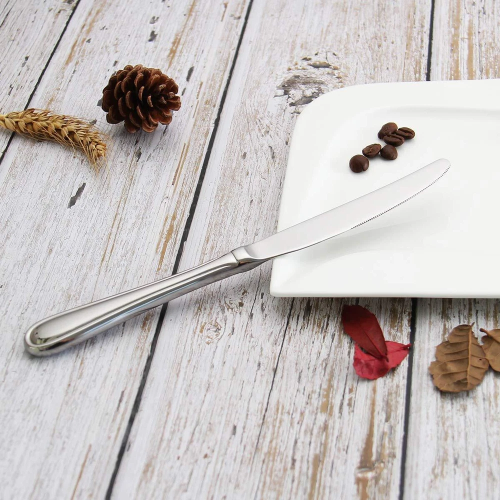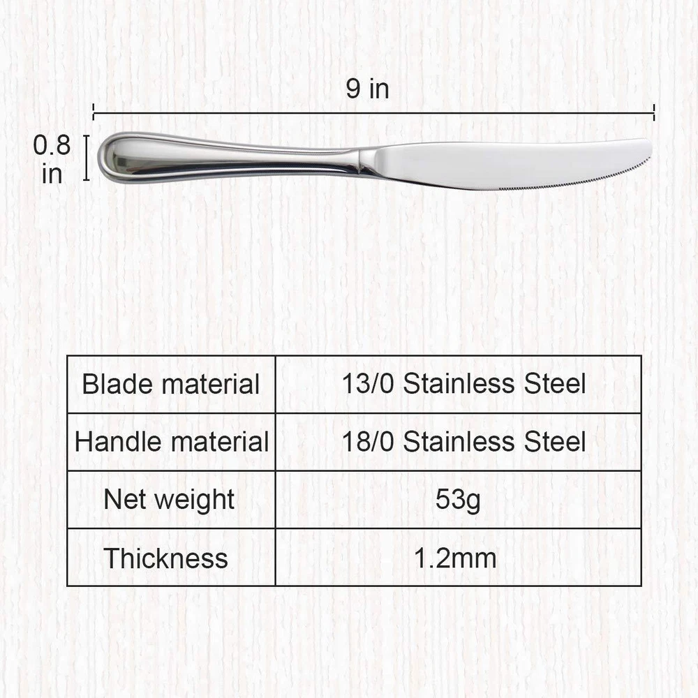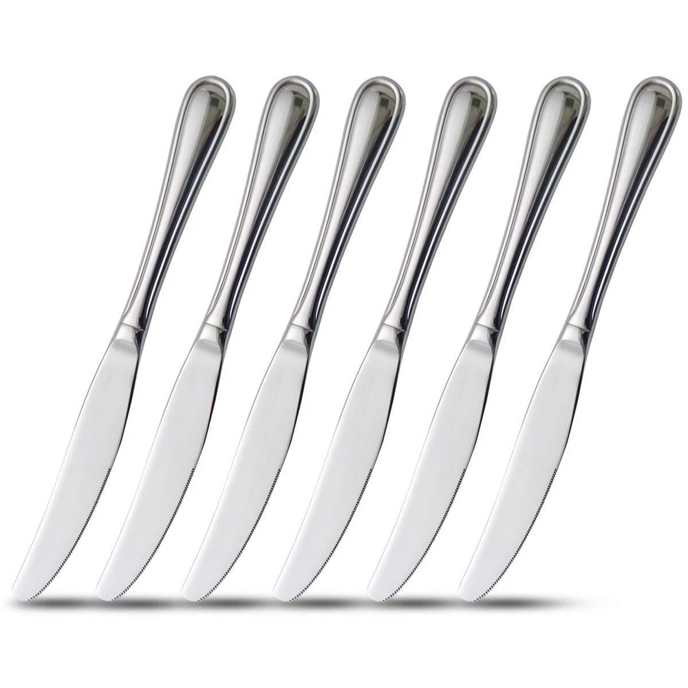 Our 6-PCS hollow handle knives set is a sturdy cutlery set made of high-quality stainless steel. It has a smooth appearance and can be comfortably held. With its high quality and simple and elegant design, it can match your kitchen style and tableware. Easy to clean and dishwasher safe. Material: Heavy-duty, more healthy, smooth edge no rough spots, dishwasher safe, rust resistance, and easy to clean with smooth mirror polishing, sturdy and durable for years to come. Hollow Handle Design: Mirror polished and rounded edges, smooth appearance with a clean line. Heat-resistant hollow design to protect your hand and have proper gauge thickness and weight to hold. Easy To Clean: Dishwasher safe and convenient to hand wash. What Include 6-piece stainless steel table/dinner knife set of hollow handle Using Instruction 1. Please wash the knives set with warm soapy water before first using to wash off any processing residue left from manufacturing. 2. Wipe dry after washing for daily use and it in a dry place. Warm tip: The knife is sharp, be careful when touching the blade, especially for children. Please feel free to us if you have any questions, our service team will provide you with 100% satisfactory reply within 24 hours. Thank you. Set of 6 silver hollow handle dinner knives. Made of stainless steel 18/0, light heavy duty and durable. Light hollow design knife which is heat-resistant to protect your hand and have proper gauge thickness and weight to hold comfortably and provide you fine dining experience. Ideasl for restaurants, dining room, senior clubs, etc .Food quality materials for human,nice for family dinner party. Easy to clean,this dinner knives set is dishwasher safe(no harsh detergents),making clean up easily and conveniently.