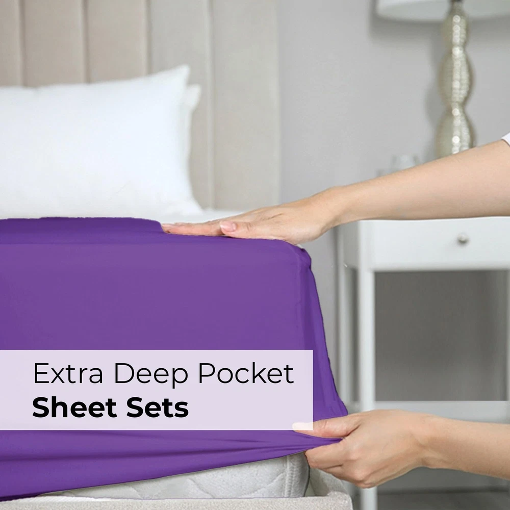 EXTRA DEEP POCKET QUEEN SHEETS / EXTRA DEEP FITTED QUEEN SHEETS: These bed sheets are for very deep pocket mattresses. They fit any mattress with pockets that are 18, 20, 21, 22 and 24 inches deep. There's stretchable elastic around the extra deep fitted sheet which stretches for a nice tug around your mattress. Perfect for extra tall & large mattresses. Rest assured these oversized sheets will stay on tight & stay in place! 6 PIECE SHEET SET: This bed sheet set comes with 4 pillowcases total all with a beautiful decorative embroidery design on each pillow case. The pillow cases have enclosure designs. This bedding set will accommodate your extra thick mattress perfectly. GREAT FOR DOUBLE PILLOW TOP MATTRESS: These bed sheets are perfect for mattresses with a 3 inch or 4 inch topper on top, memory foam toppers, big mattress pads, pillow tops, foam toppers, big foam toppers, pillow top mattresses and memory foam. These sheets will not come off. MICROFIBER: These are the softest type of microfiber bed sheets we have created. Super soft with a light feel. Not crisp like cotton. If you're accustomed to cotton sheets and you've never tried microfiber sheets we recommend you give these a try. They're even softer than cotton! DIMENSIONS & SIZES: Flat Sheet 95 wide and 102 long. Fitted sheet 60 wide and 80 long with 21 inch pockets (has elastic so it can stretch). All four pillow cases are oversized 20 x 30 inch.
