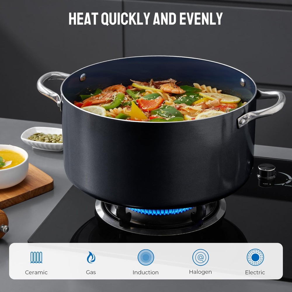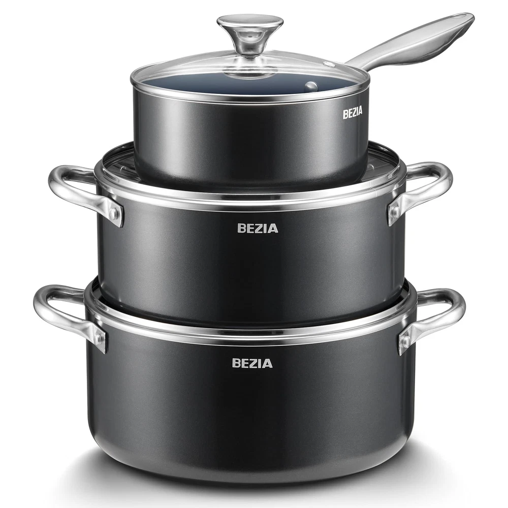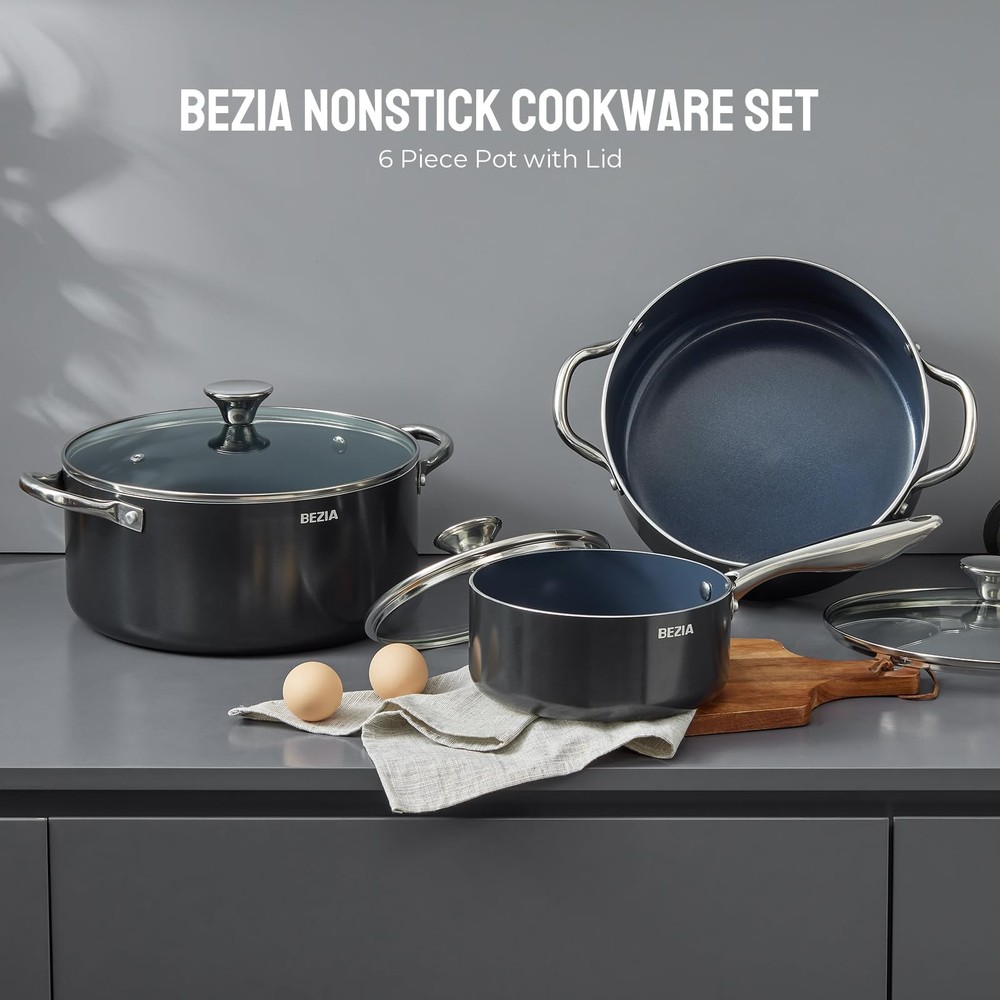 pot set cooking pot pot sets for cooking nonstick pots set kitchen pots big pots for cooking non stick pots cooking pot set pots and pans set non stick cooking pots cookware set pot sets nonstick pot pots and pans cooking pots with lids stackable pots and pans set non stick pot kitchen cookware sets pots and pans set induction cookware pot sets for cooking set of pots non stick pot set pots set non stick big cooking pot Cookware Set Includes: You will get a beautifully designed and well-made cookware set. Included 2 QT saucepan with lid, 4.8 QT stock pot with lid, 6 QT stockpot with lid. Our non stick cooking set offer different kinds of choices for you to cook a variety of meals. Nonstick Cookware Set: You can say goodbye to stuck-on food and hello to perfectly cooked meals with our nonstick cooking pan set. Our non stick ceramic coating ensures that food releases easily and cleanup is a breeze, making cooking a joy rather than a chore. And when you're done cooking, simply throw the pots in the dishwasher for easy cleaning and maintenance. Heats Evenly: Each pot is comprised of a solid sheet of aluminum, allowing for a quick and even heat distribution from end to end, cooking foods perfectly and evenly throughout. Not only does this make meal preparation more convenient, but it also helps to prevent overcooking and undercooking. Induction Compatible: Enjoy unrestricted freedom in the kitchen with our high magnetic conductive stainless steel base that works seamlessly across all cooktops, including induction, gas, and electric. Our cookware is oven-safe up to 500°F, opening up endless recipe possibilities! Maximize Your Cooking Experience: Our cookware has a durable dual-riveted stainless steel construction, this cookware is built to last and will be your trusted companion in the kitchen for years to come. Plus, the airtight glass lid seals in moisture and heat and lets you monitor the cooking progress. 6-Piece Pot Set: The set of pots includes 2 QT saucepan with lid, 4.8 QT stock pot with lid, 6 QT stockpot with lid Effortless Storage: Compact and easy to stack, this saucepan set saves space in your kitchen and cabinets, keeping your kitchen organized and clutter-free Ultra-Durable Non-Stick: 3X the durability of traditional cookware for effortless food release with our non stick pots. Free of PFAS, PFOA, lead, and cadmium Even Heat Distribution: Made with recycled aluminum and reinforced bottoms, these big pots for cooking distribute heat evenly, eliminating hot spots and undercooked areas Oven safe up to 450°F. Compatible with all cooktops: induction, gas, and electric. Transition seamlessly from stovetop to oven (lid not oven-safe) Easy to Clean: Cleanup is a breeze with the non-stick coating. Simply wipe with a paper towel or rinse with water for spotless pots and pans. Dishwasher Safe for a hassle-free cleanup experience Secure & Comfortable Hold: Ergonomically designed stainless steel handles of these stock pots with lid , making it easy to handle and maneuver during cooking Tight-Seal Shatter-Resistant Glass Lid: Perfect for the large pots for cooking, it enhances efficiency & allows clear progress monitoring during the cooking process