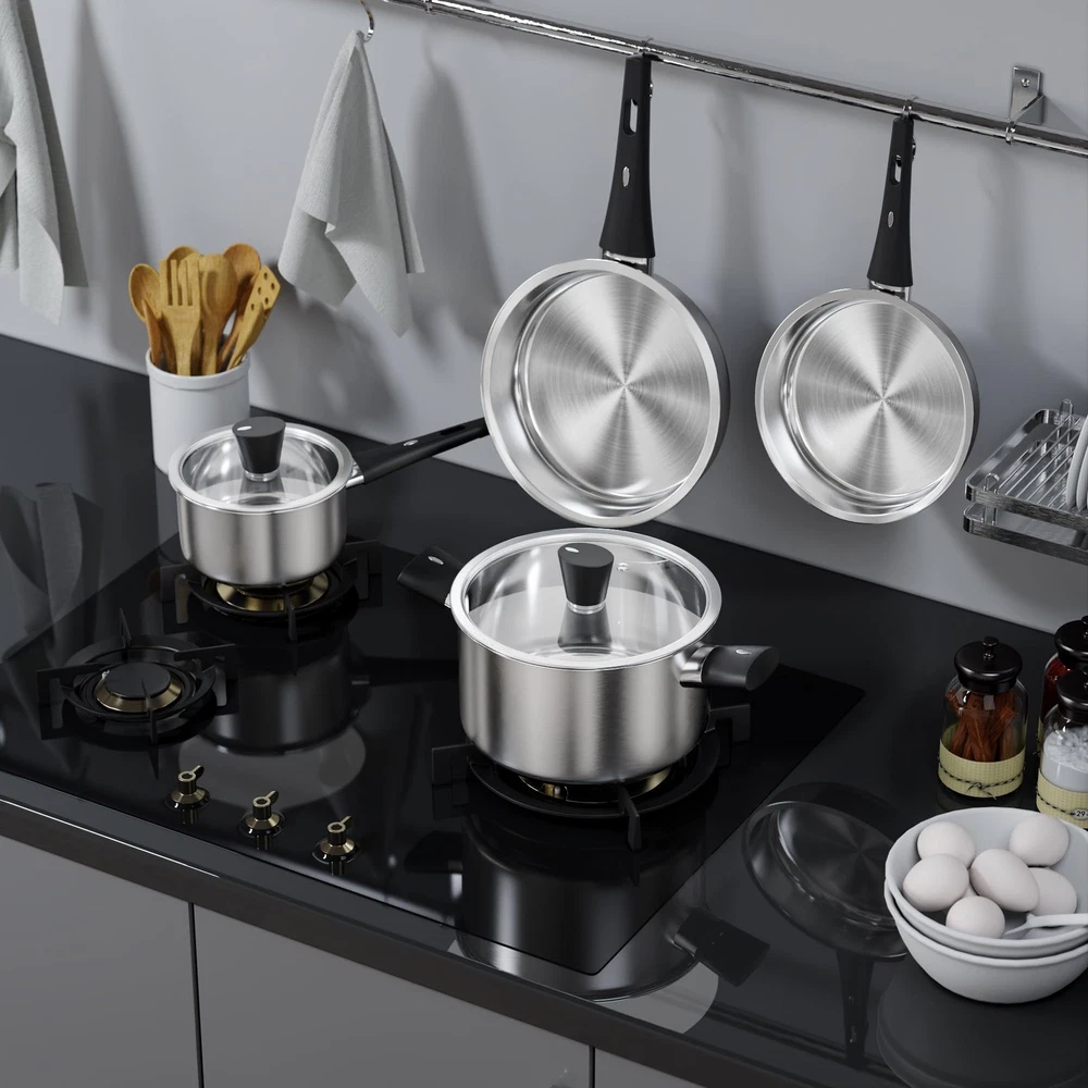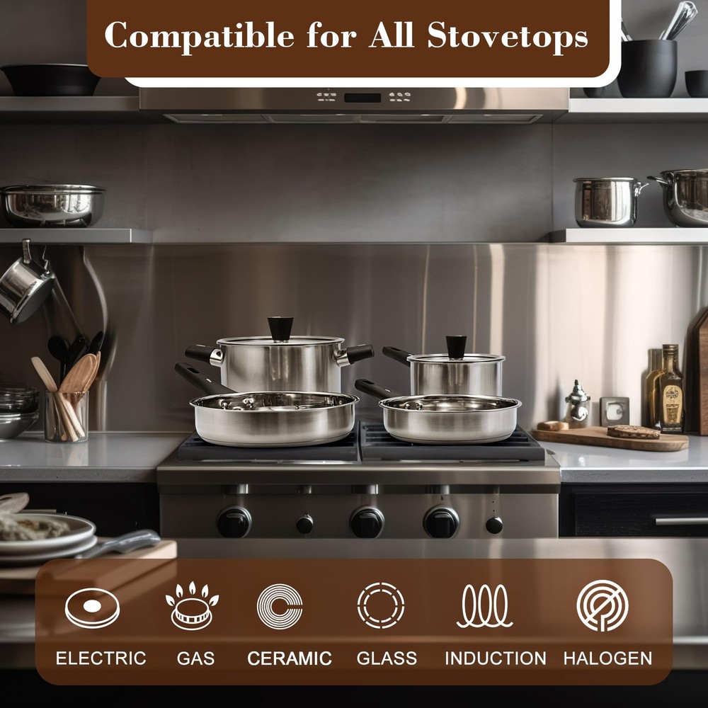 6 PCS KITCHEN COOKWARE SET: 8 Inch Frying Pan, 10 Inch Saute pan, 2.5 Quart Saucepan with Lid, 5.5 Quart Casserole Pot with Lid. Stainless Steel Pots and Pans Set is made of food-grade stainless steel, 100% free of PFOS,PFOA, which ensures that your daily cooking is always safer and healthier. 【6 PCS KITCHEN COOKWARE SET】: 8 Inch Frying Pan, 10 Inch Saute pan, 2.5 Quart Saucepan with Lid, 5.5 Quart Casserole Pot with Lid. 【NON-TOXIC MATERIAL】: Stainless Steel Pots and Pans Set is made of food-grade stainless steel, 100% free of PFOS,PFOA, which ensures that your daily cooking is always safer and healthier. 【DISHWASHER SAFE】: Easy Clean & Anti-Rust. The pots and pans are dishwasher safe for easy and convenient cleaning, and the food-grade stainless steel that is durable, rust-proof, and corrosion-resistant. 【BAKELITE HANDLES】: Stay-cool handles designed for without worrying about burning your hands. Ergonomic designed for picking up the pots and pans comfortable. 【SEE-THROUGH LIDS】: The Visualization glass lids for easy monitoring of cooking progress. Steam vents ensure that heat is continuously vented to prevent glass breakage. 【All Stovetops】: Pots and Pans are suitable for all stovetops, including induction, gas, electric, halogen and ceramic. 【LIFETIME WARRANTY】: We are here to offer you only the best quality products, please feel free to contact us if you have any questions.