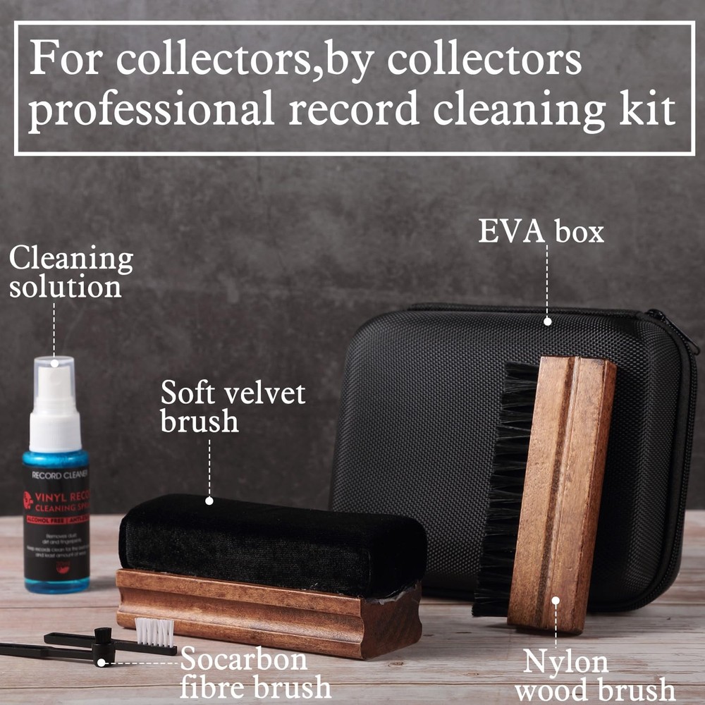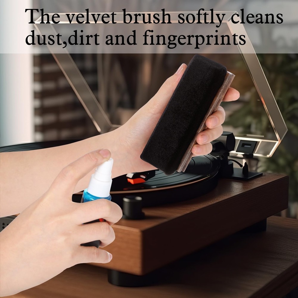 This vinyl cleaning kit is a must-have for any record collector! The compact storage box keeps everything neatly organized, while the dark brown brushes add a stylish touch. The velvet brush feels premium and effectively removes dust without scratching. The included cleaner fluid works great, leaving records sounding crisp. Perfect for maintaining your vinyl collection—functional, sleek, and totally worth it!