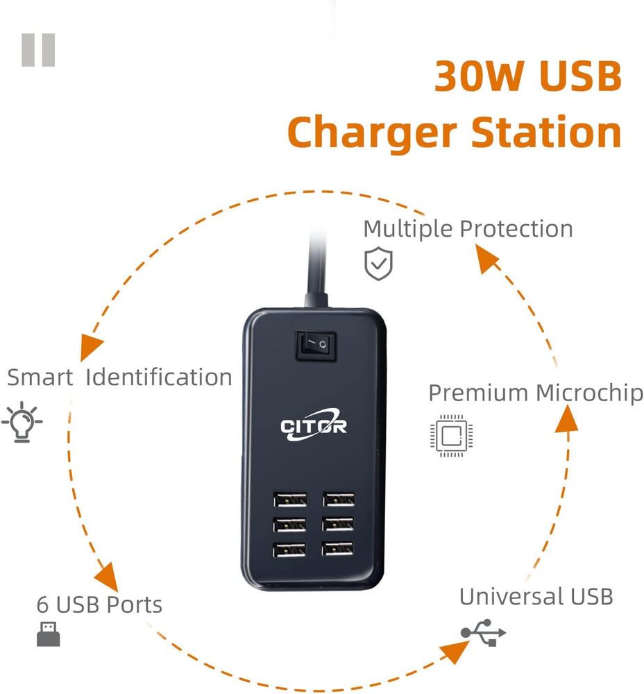 Neighborhood service Multiport USB Charger, 6 Port USB Charging Station for Multiple Devices, Phone, Tablet, Power Strip with On/Off Switch (Black) ENJOY THE FEATURES 6 Ports USB Charger - Multi-Port USB charger hub to charge up to 6 of your devices simultaneously at full speed, outputs up to 2.4 amps for each port ON/OFF Power Switch - There is a switch to control power supply so that you could plug continuously. The 5ft cord made it convenient to use. Multiple Protection - The USB charger hub features surge protection, over-current and over voltage protection, 100% protect your smart devices securely. Compatible with almost USB Devices - USB charging station is compatible with cellphones, tablets, Bluetooth speakers, headsets, cameras, PSP and more. Best Service - 12 Months Worry-free Warranty & dedicated email customer support. Product Description 6 Port USB Input AC 100-240V 50-60Hz Output: DC 5V 6A Dimension 4.4*2.5 in Weight: 7oz Simultaneous and Intelligent Charging With a premium chip, each port of the charging station detects the exact current requirements of a connected device and stably distributes the right amount of current. Just enjoy fast and stable charging at the same time. Space-Saving and Worldwide Travel Design Compact size is easily stored into a bag or suitcase to charge essential electronics on the move. Input voltage AC 100-240V 50/60Hz, suitable for most countries' standard voltage, ideal for international travel. Item model number KK-1 Whats in the box charging station Connectivity technologies Bluetooth,Usb Color black Other display features CE Compatible Devices Cellular Phones แตงčers Item Weight 5.9 ounces Special features Travel Hardware Interface USB Special Feature Travel Package Dimensions 5.98 x 3.98 x 1.46 inches 3.98 inches x 5.98 inches x 1.46 inches. Weight: 5.9 oz PAYMENT We accept all payments via Ebay using Credit Cards , PAYPAL , Apple Pay and many others SHIPPING We are always working hard to ensure your package arrives as soon as possible. Please understand that some factors like weather, high postal traffic, and the performance of shipping companies are outside of our control. We offer free shipping to the lower 48 states and ship within 3-5 business days of payment, usually sooner. We do not accept P.O. Boxes. Please provide a physical address. We do not ship internationally at this time. DELIVERY & RETURN POLICY We do not offer returns unless the item violates eBay policies. Please be aware these polices only make sellers accept returns if the item violates eBay's Buyer Guarantee. If you would like to learn more about this please visit eBay's Help Page. Thank you for your business