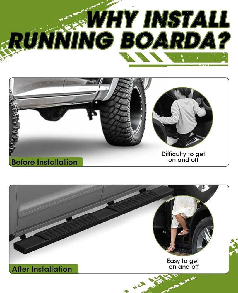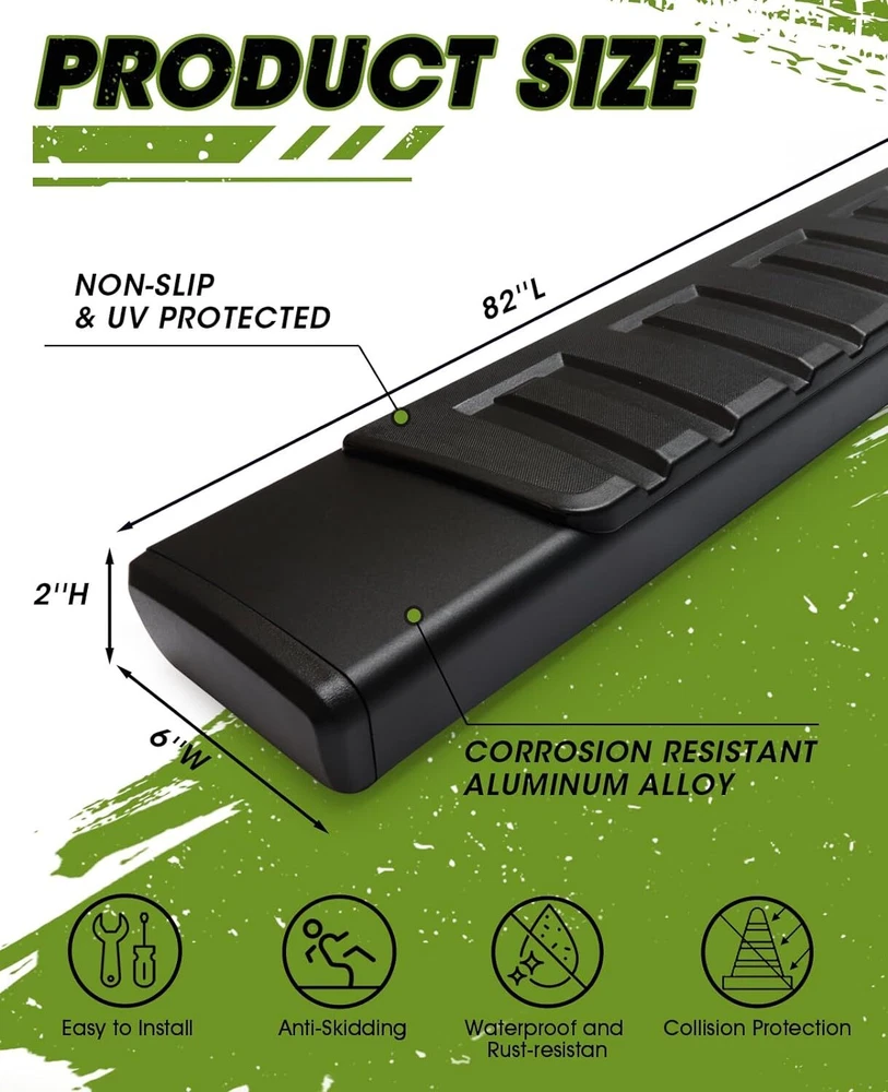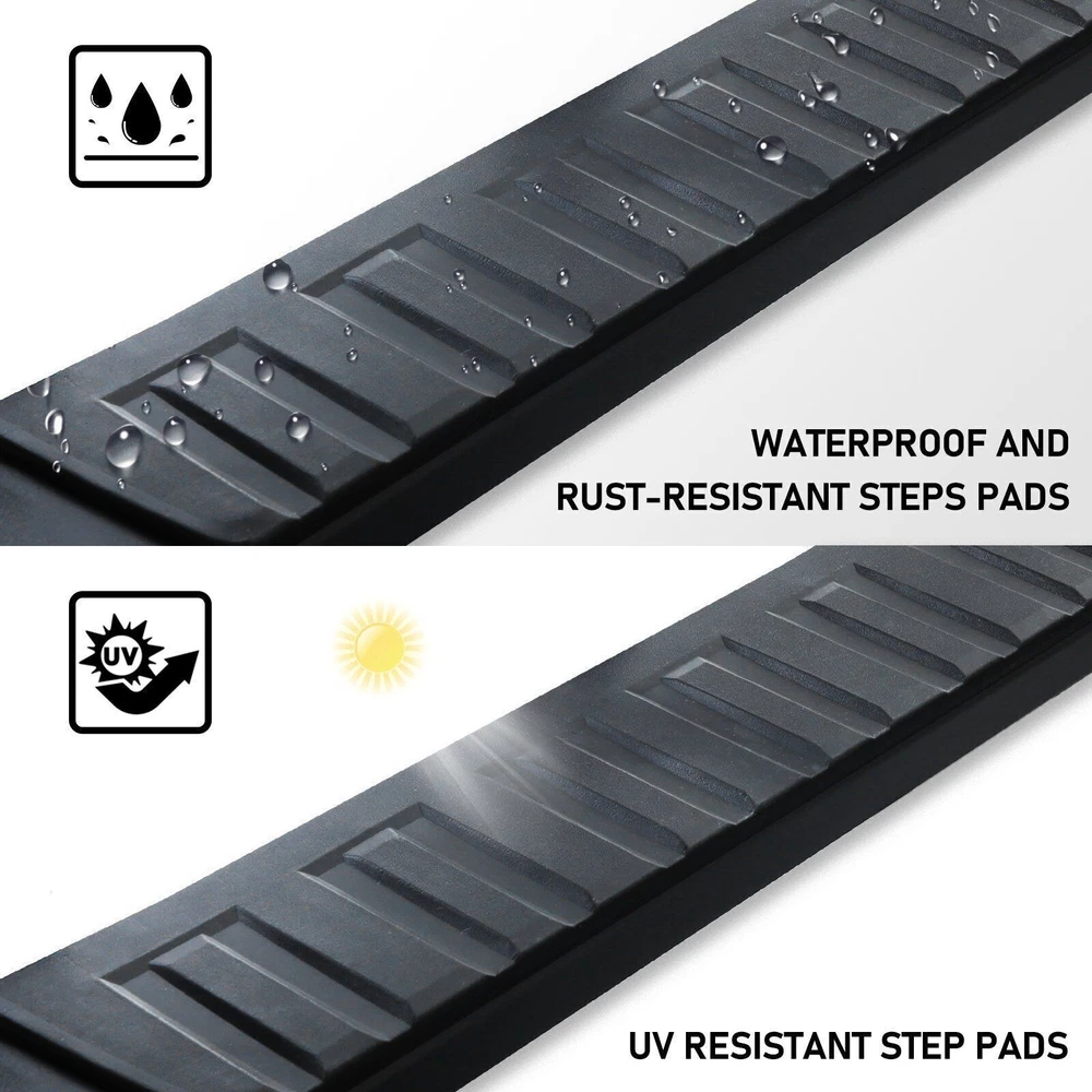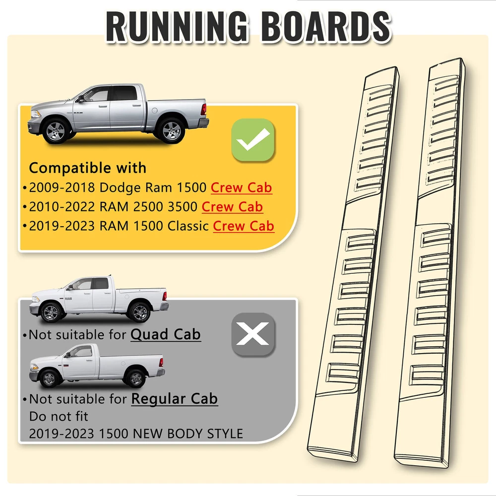 6"Running Boards For 2009-18 Dodge Ram 1500 Crew Cab Nerf Bars Side Steps BLK FITS PERFECTLY- Compatible With 2009-2018 Dodge Ram 1500 Crew Cab (Including 2019-2023 Classic), 2010-2023 Dodge Ram 2500 3500 Crew Cab. Only For Crew Cab model (4 full-size doors). Please Check your Vehicle Type Before Ordering. ANTI-SLIP & RUST RESISTANCE- Made with high-quality anti-corrosion black aluminum alloy and anti-slip plastic pads. Our side steps are fearless of rain and snow erosion, sturdy and durable. One piece design ensures great performance, is not easy to accumulate water or get stuck, and is simple to clean. FRIENDLY DESIGN- Width 6 Inches for maximum comfort in stepping on and off. They'll serve as a step to give you an assist getting in and out of your truck. Our running boards' heavy-duty material is sturdy and can hold up to 500 lbs on each side. PROTECTION- Siziom running boards can provide maximum side protection for your pickup to prevent it from being hit. And the smooth surface will help keep you from getting snagged and hung up when off-road. EASY TO INSTALL- Just mounted it, direct bolt-on, no need to drill. All factory holes are perfectly aligned with the mounts. Package includes 2 running boards, 6 brackets, relevant hardware, and detailed installation instructions. Note: 2009-2012 models require self-drilling on pinch weld. Fitment: Also Fit For 2019-2022 Dodge Ram Classic Model. For 2009-2018 Dodge Ram 1500 (Include 2019-2022 Classic) For 2010-2022 Ram 2500/3500 Crew Cab(4 Full Size Doors) NOT For Quad Cab(2 Big Front Doors&2 Small Rear Doors) Please Check The Cab Size Picture Before Ordering! Description 1.Item is 100% Brand New in Box, Come in A pair of Running boards, mounting kits,hardwares, Installration instruction. 2.Just Mounted it , Direct Bolt on , no need to drill. And also each bar can support up to 450 LBS. 3.It made from Heavy Duty Galvanized Steel and Anti-slip plastic steps 4.Well in all weather condition