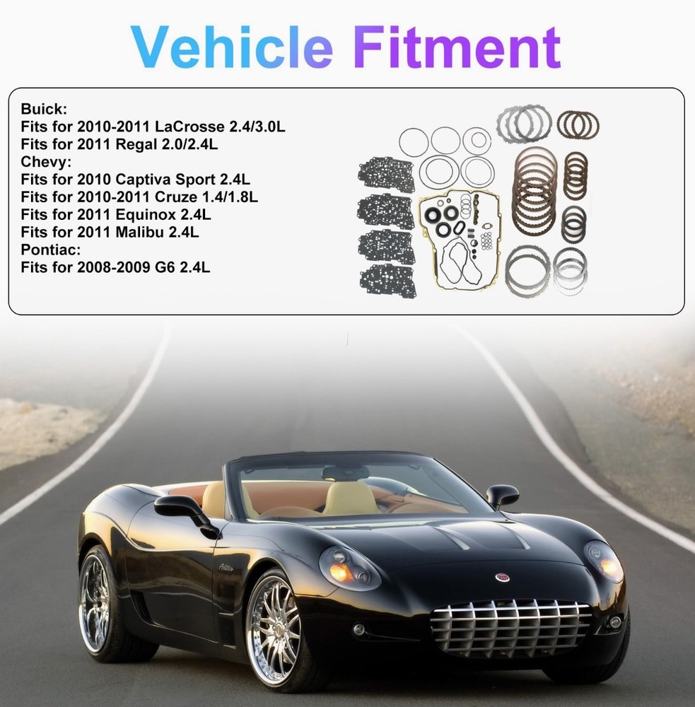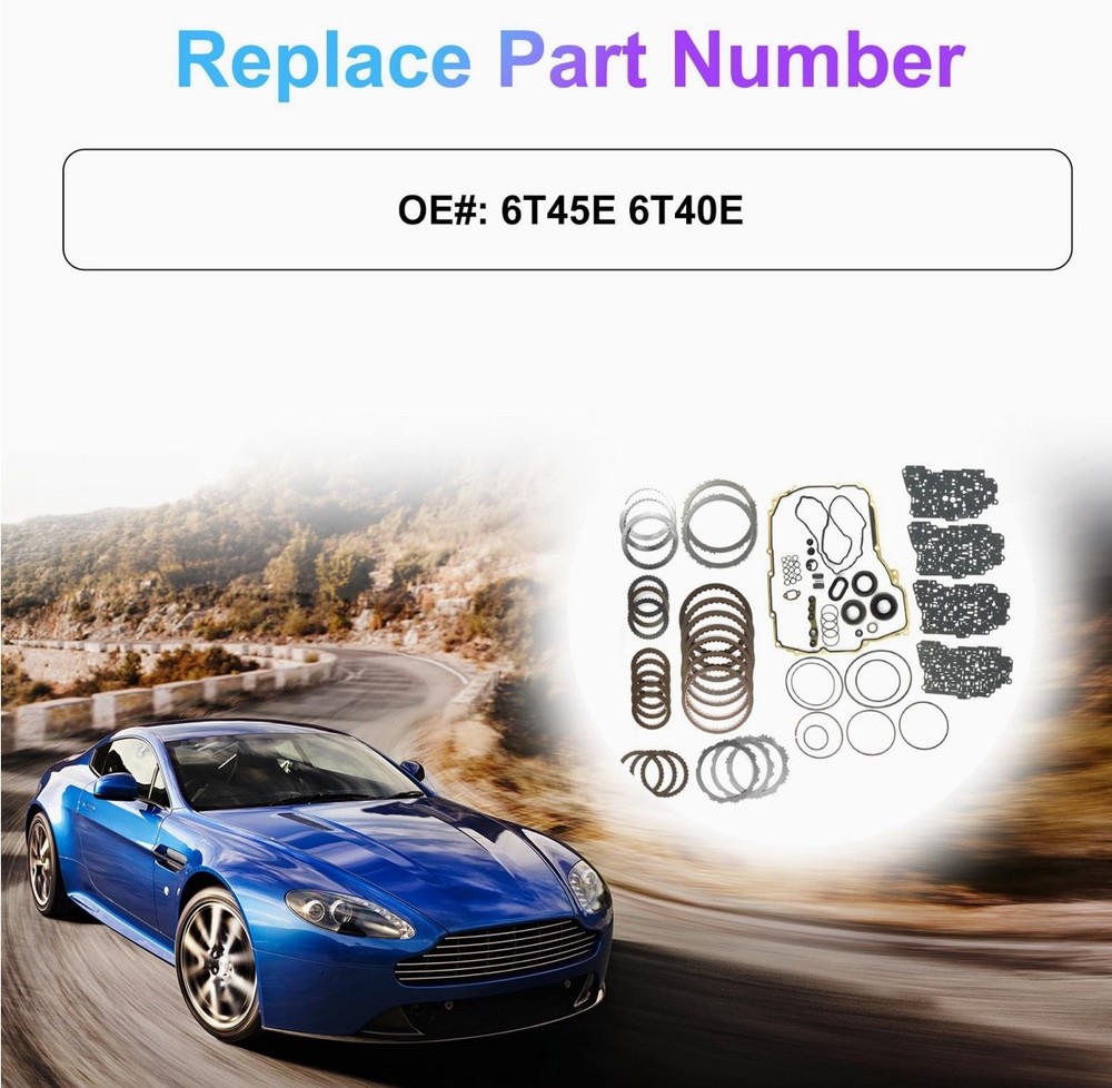 #2908 6T40E 6T45E Transmission Master Rebuild Kit w/Friction Plates Fits for Buick LaCrosse 10-11, Chevy Captiva Sport/Cruze/Equinox/Malibu 10-11, Pontiac G6 08-09 Replace OE 6T40E 6T45E 【REPLACE PART】6T40E 6T45E Transmission Master Rebuild Kit OE 6T40E 6T45E 【Compatible With】6T40E 6T45E Transmission Master Rebuild Kit Fits for 2010-2011 LaCrosse 2.4/3.0L, Fits for 2010 Captiva Sport 2.4L, Fits for 2010-2011 Cruze 1.4/1.8L, Fits for 2011 Equinox 2.4L, Fits for 2011 Malibu 2.4L, Fits for 2008-2009 G6 2.4L 【COMPREHENSIVE COVERAGE】 The Parts In The Kit Cover Key Components Within The Transmission, Including Clutch Plates, And Can Meet The Needs Of Most Common Automotive Transmissions. 【SIMPLIFIED REPAIR PROCESS】 With The Transmission Rebuild Kit, You Don’t Need To Purchase And Search For Various Parts Separately. You Can Get All The Components You Need At Once, Simplifying The Transmission Repair Process. 【RESTORE ORIGINAL PERFORMANCE】 Rebuilding With A Transmission Rebuild Kit Can Restore The Original Performance Of Your Vehicle's Transmission Because The Parts In The Kit Match The Original Equipment Manufacturer (Oem) Specifications. 【COST-EFFECTIVE】 Compared To Purchasing A Brand New Transmission Or Purchasing Parts Separately For Repair, The Transmission Rebuild Kit Provides A More Affordable Option, Allowing You To Complete Transmission Repairs At A Lower Cost. 【INGKAN-ONLINE AFTER SALES】INGKAN-ONLINE Provides 24-hour Online Consultation And Customer Service With Professional, Enthusiastic, And High-Level Team After-Sales Processing Standards. Whatever We Do, We Do It To Make A Difference In Our Internal And External Customers’ Lives In A Better Way! The Overhaul Gasket Set Part Number: 6T45E 6T40E This Engine Rebuild Gasket Set Replacement With: For Buick: Fits for 2010-2011 LaCrosse 2.4/3.0L Fits for 2011 Regal 2.0/2.4L For Chevy: Fits for 2010 Captiva Sport 2.4L Fits for 2010-2011 Cruze 1.4/1.8L Fits for 2011 Equinox 2.4L Fits for 2011 Malibu 2.4L For Pontiac: Fits for 2008-2009 G6 2.4L Package includes: Transmission Master Rebuild Kit*1 Our Rebuild Overhaul Kit Product Features: (1)Stable performance, high reliability. (2)High-temperature resistant, long service life. (3)Easy to install, fast response. (4)Made of high-quality metal materials, safe and reliable. (5)Complete accessories, strong performance.