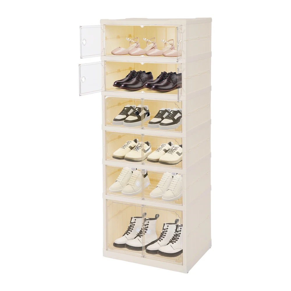 This shoe rack is a game-changer for keeping my entryway tidy! The sturdy plastic holds up to 12 pairs without wobbling, and the foldable design makes it super convenient when I need extra space. Love the modern cream and yellow color—it brightens up my hallway while keeping shoes neatly organized. Assembly was a breeze, and it stays compact when folded. Perfect for small spaces!